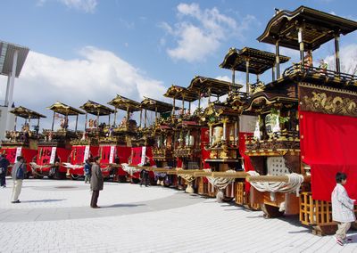 太田川駅東口 ロータリーに4台の山車が並んだ。背景に高層マンションがあるどんでん。