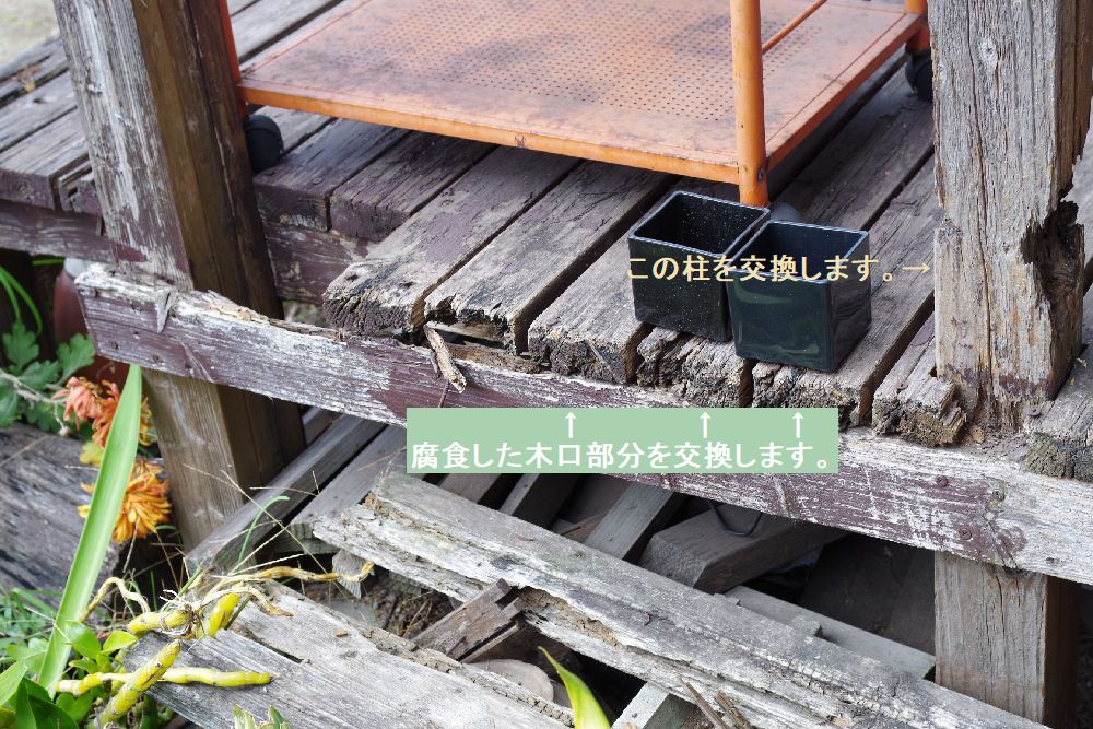 老朽化したウッドデッキの東端。手すりを支える柱の根元の腐食もひどい。