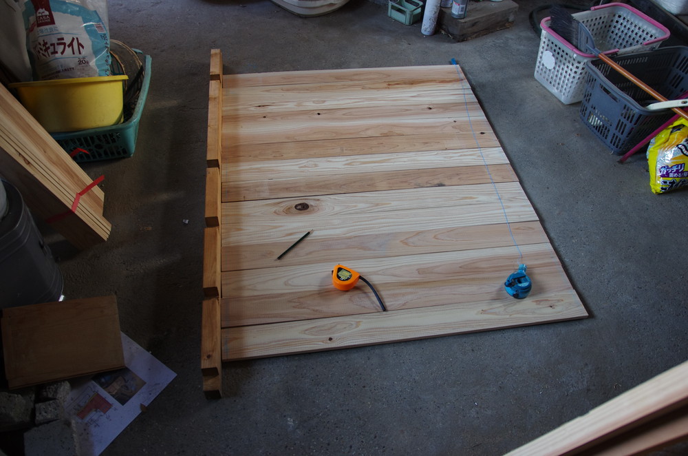 すのこの板を切り出しします。墨壺(だけどチョークですけどね)で墨入れして