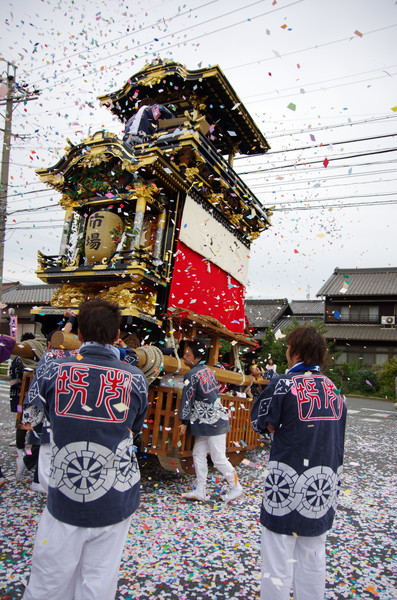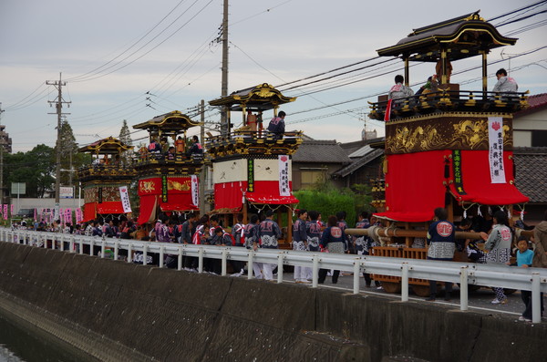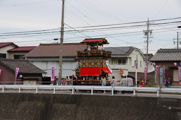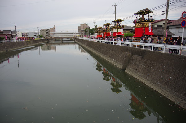 むりやり川面に写った山車も撮ってみた。