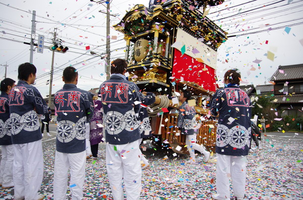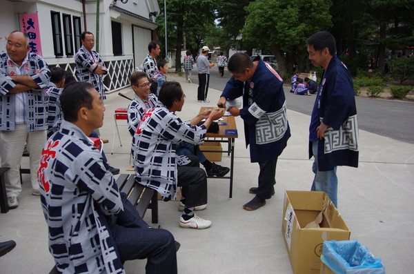 にぎやかにお神酒を受ける組衆