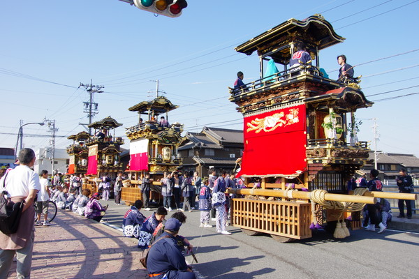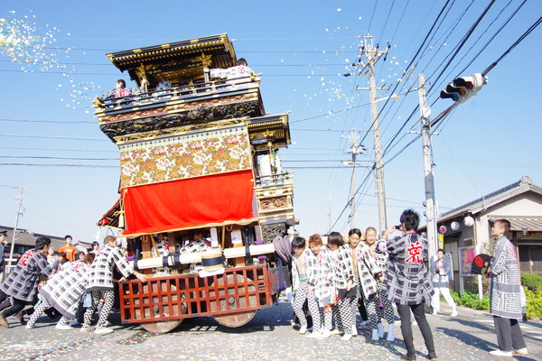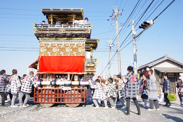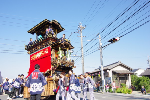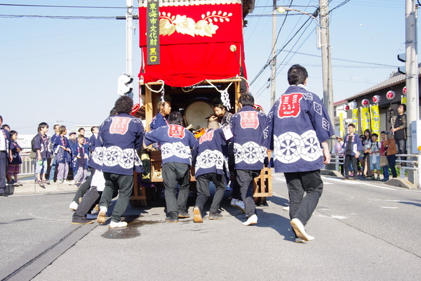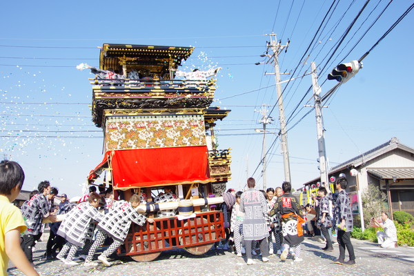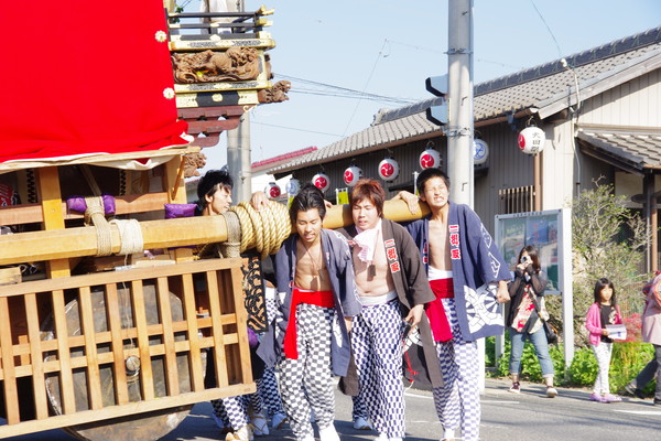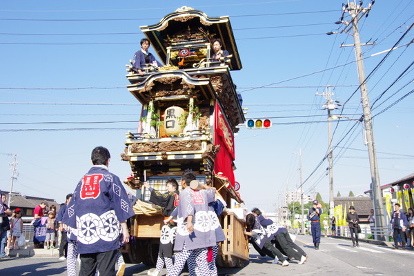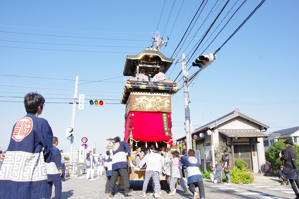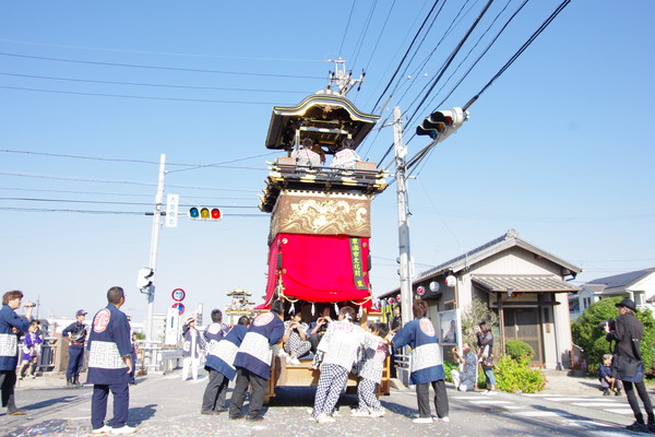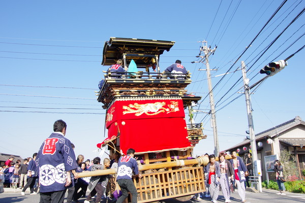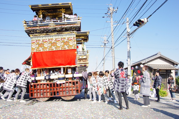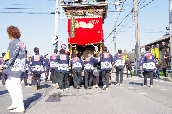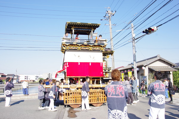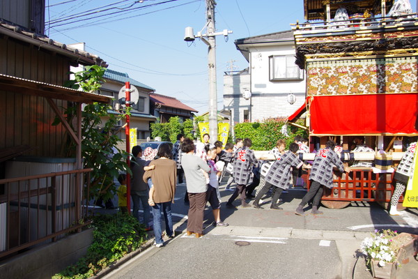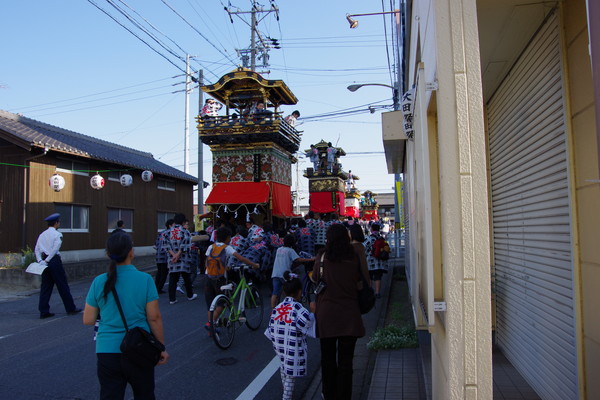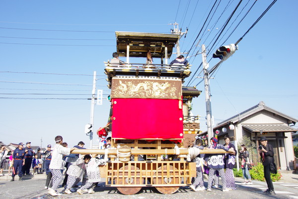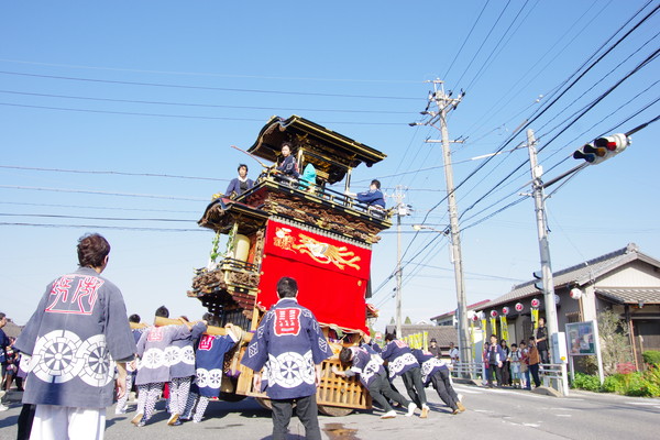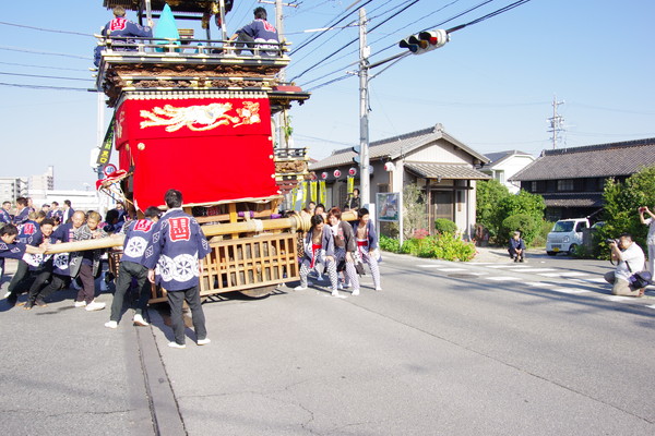 本楽 早朝 荒古の山車が 旧山車蔵の近くを通過して行く。