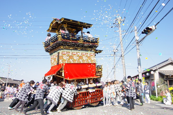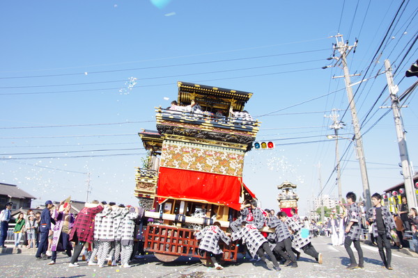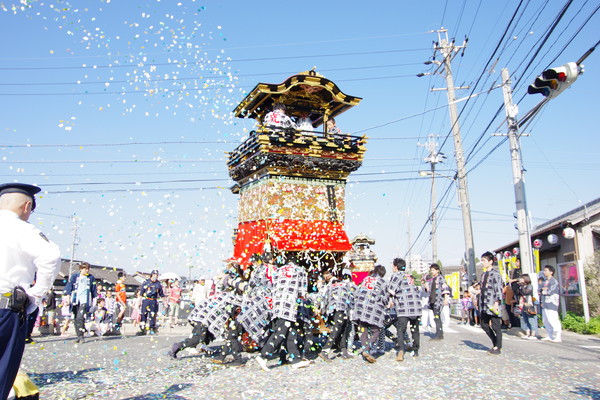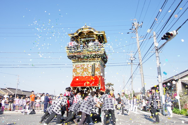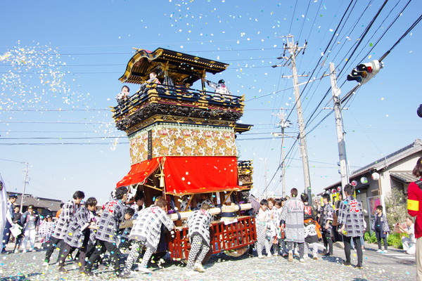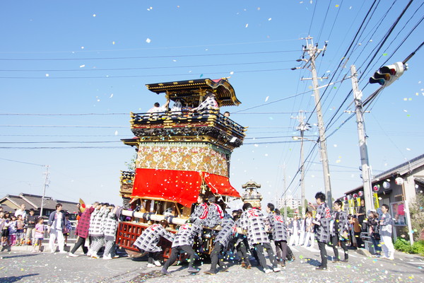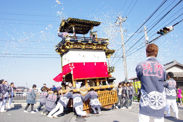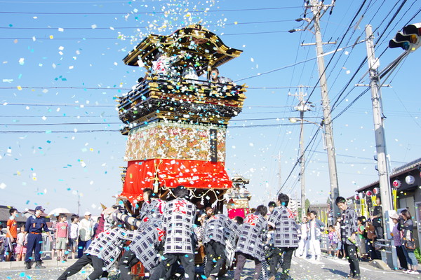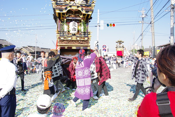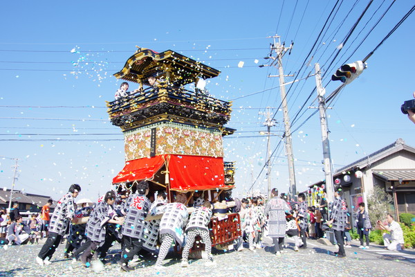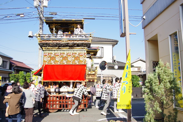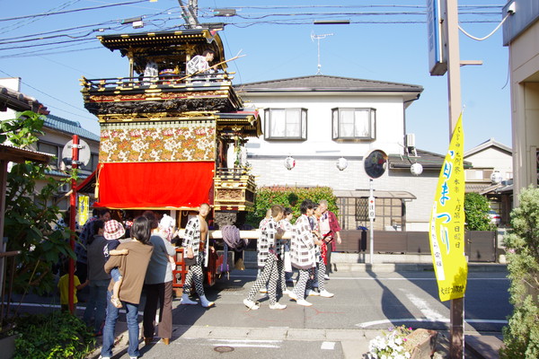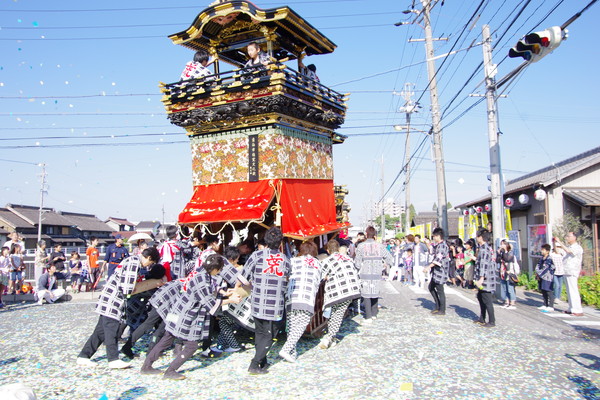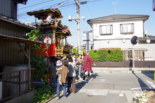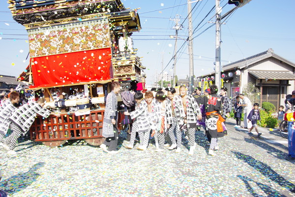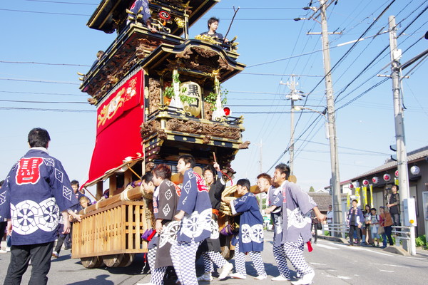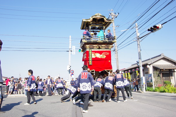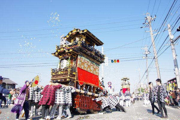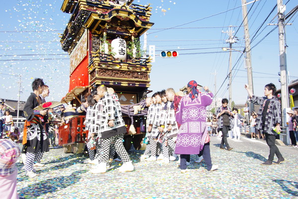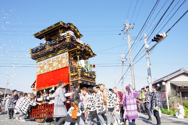 本楽 早朝 荒古の山車が 旧山車蔵の近くを通過して行く。