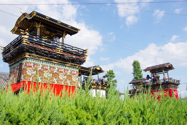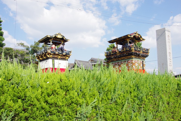 毘沙門寺に向けて出発します。 山車の位置を変えるところを生垣越しに撮ってみました。