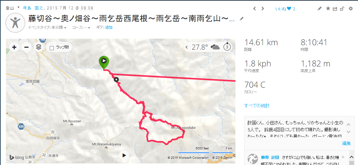 2015年7月12日 藤切谷〜奥ノ畑谷〜雨乞岳西尾根〜雨乞岳〜南雨乞山〜清水ノ頭〜大峠〜藤切谷
