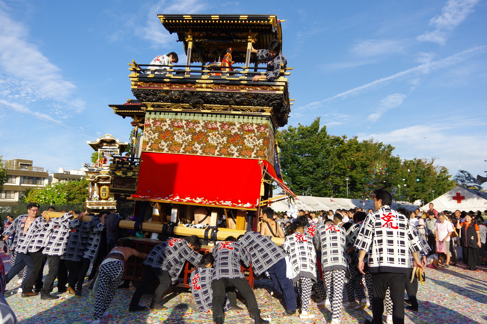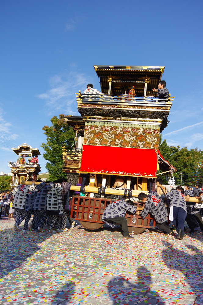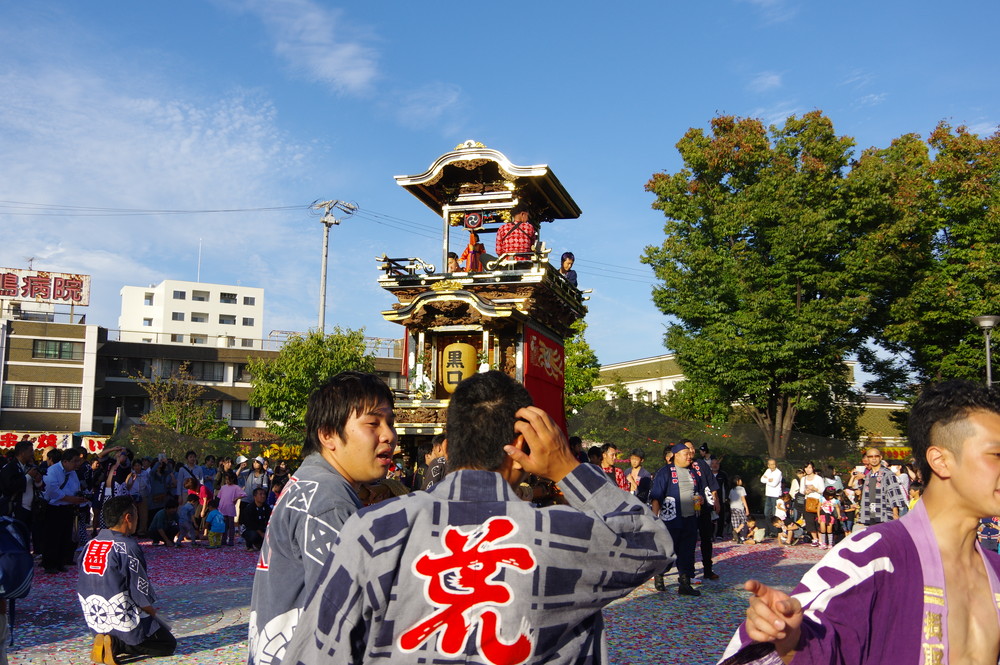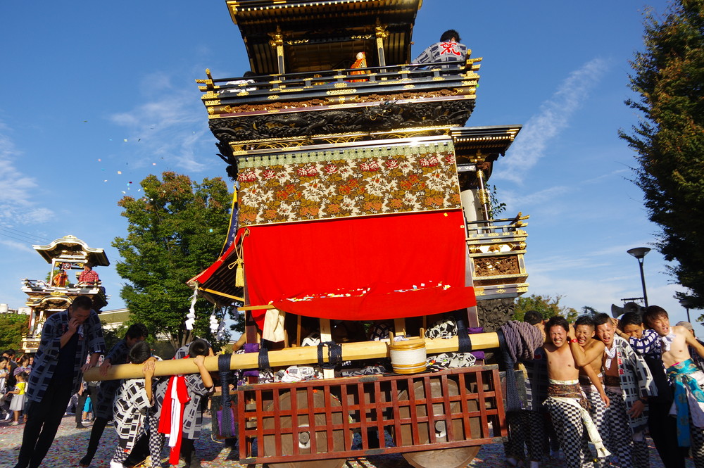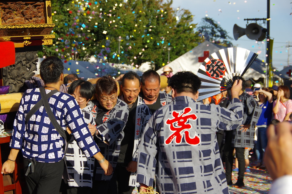 太田川駅前どんでん広場での中老さんが担ぐどんでん。