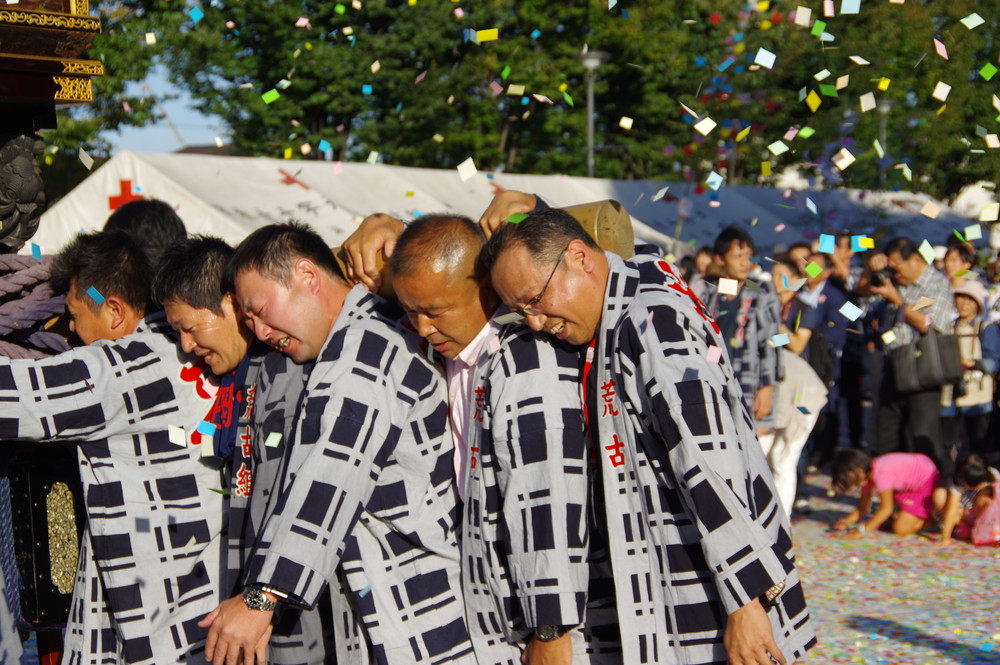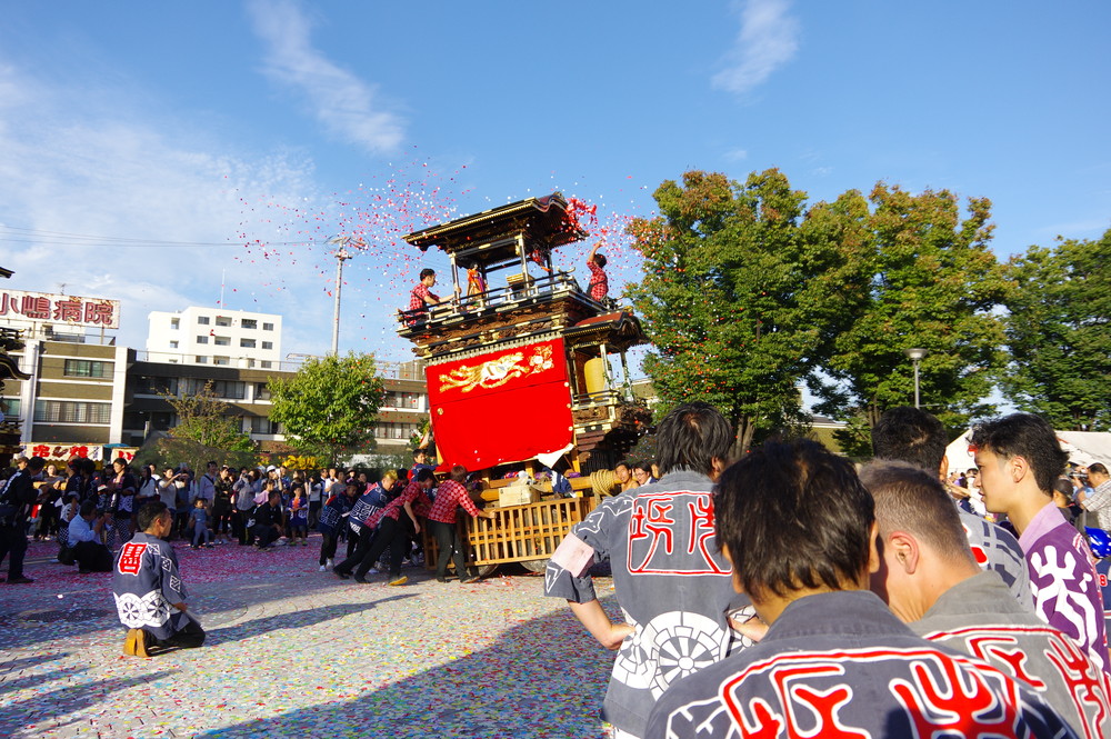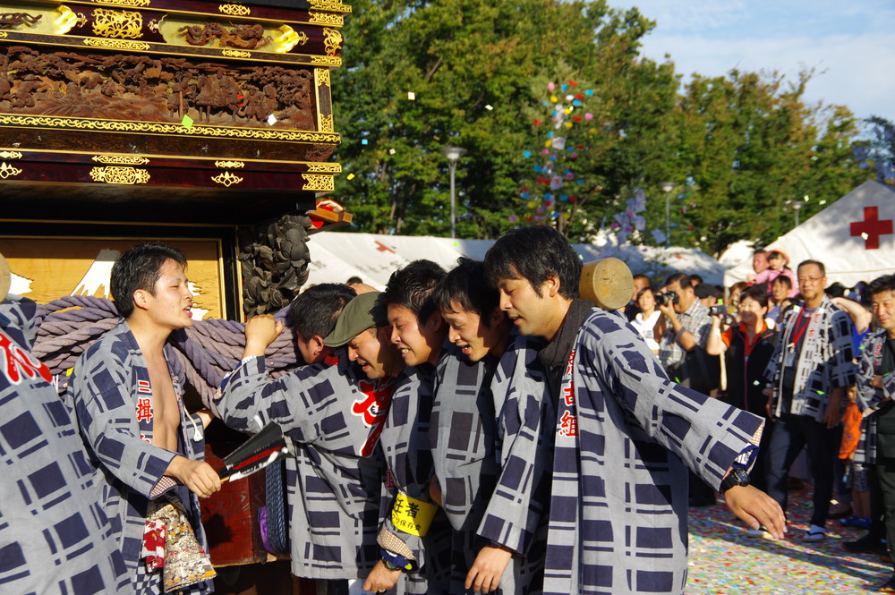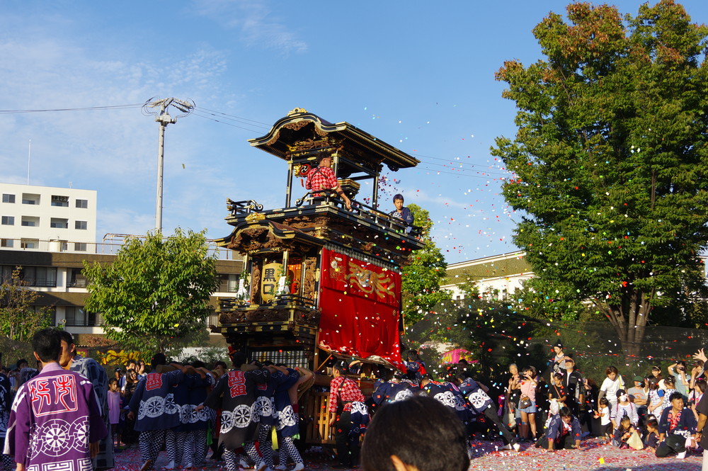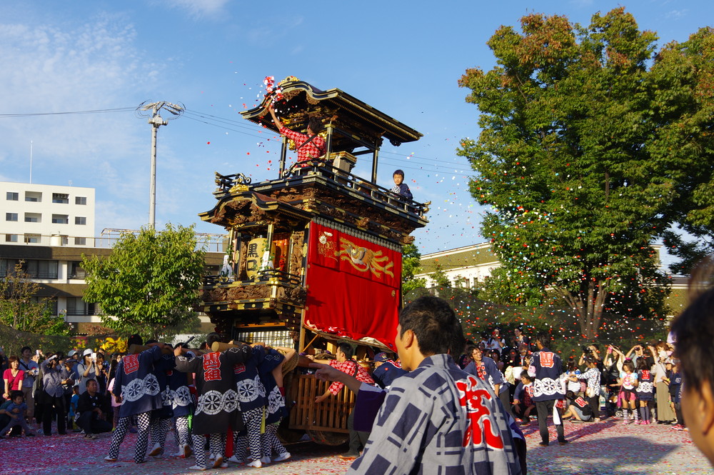 太田川駅前どんでん広場での中老さんが担ぐどんでん。