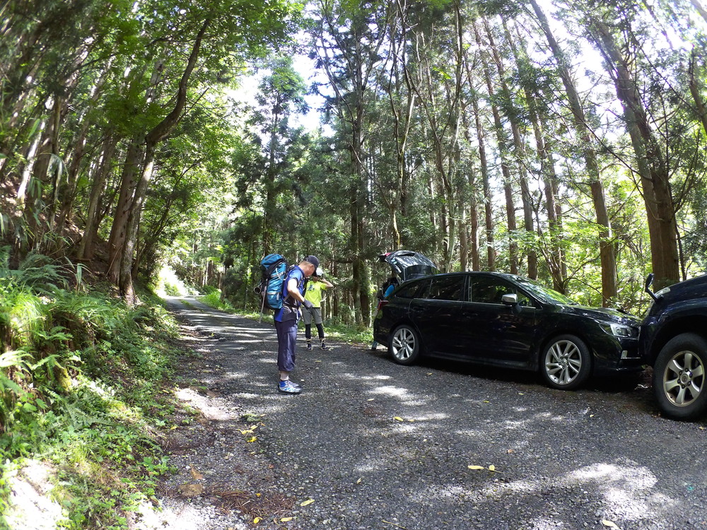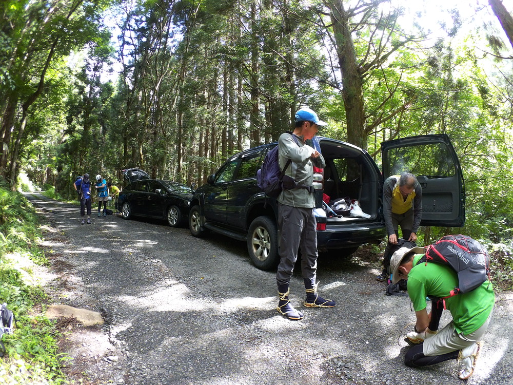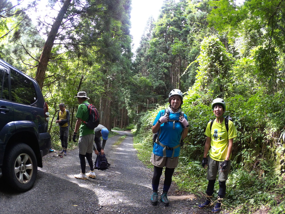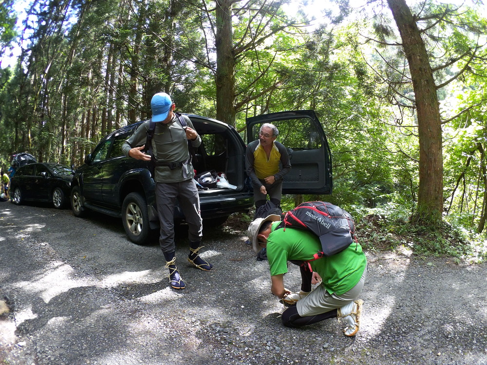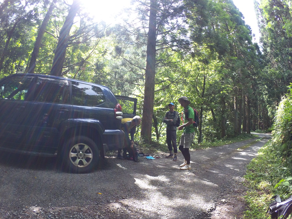 駐車地に車をとめ 沢装束の準備です。