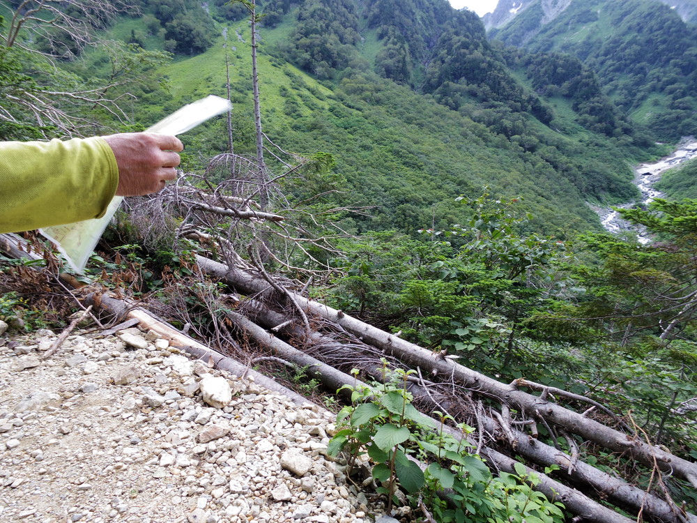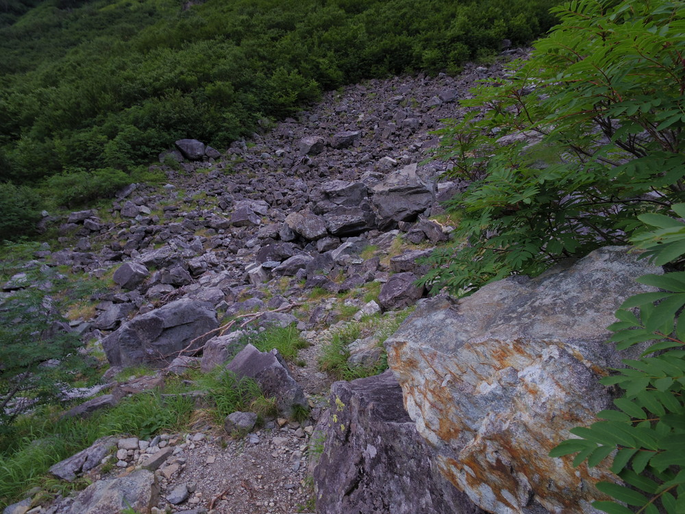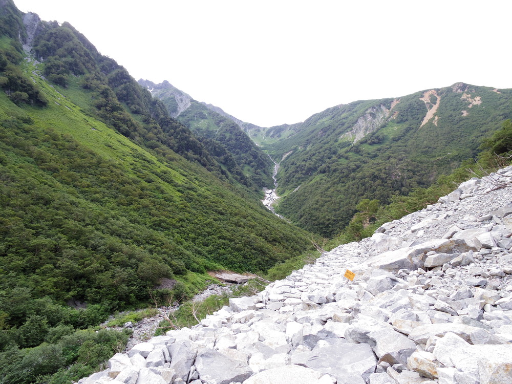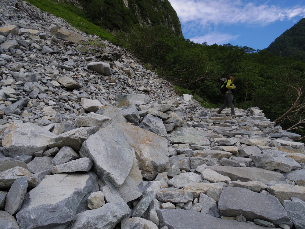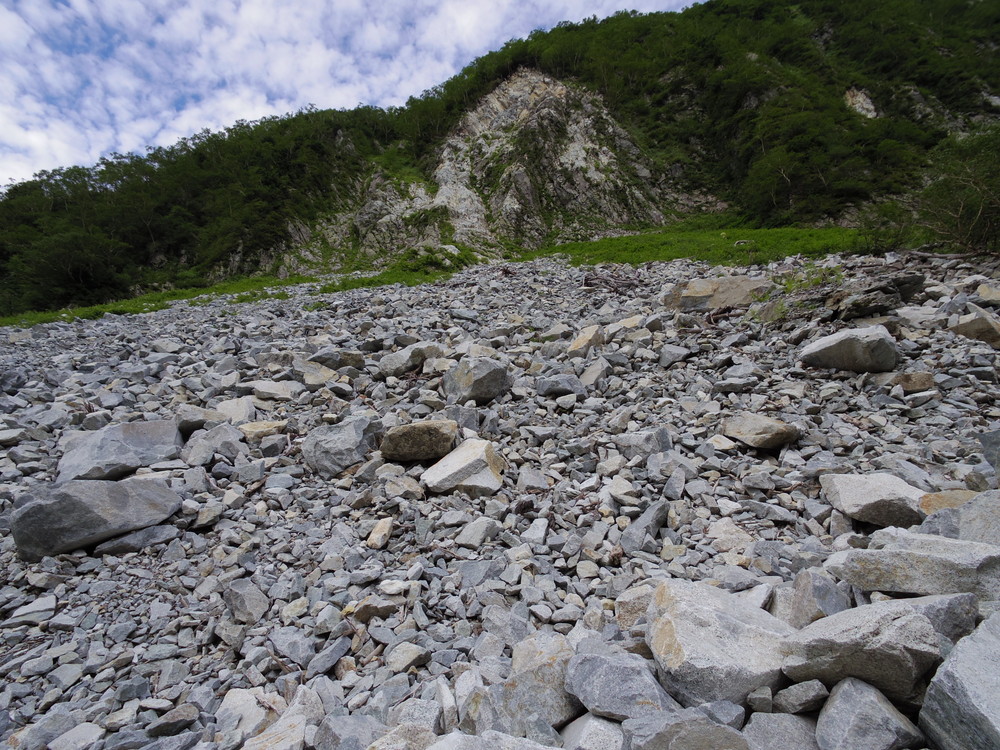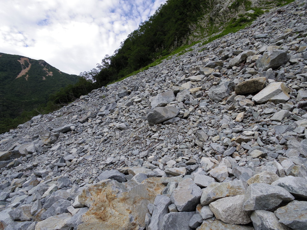落石注意箇所。 立ち止まらずにすばやく通過しましょう。