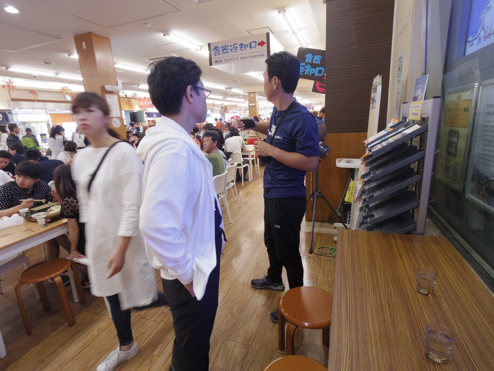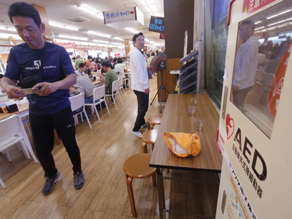 施設内も大混雑、テーブルが開いていないので食事用ではないテーブルで3人ちゃっかりお昼ごはんだ。
