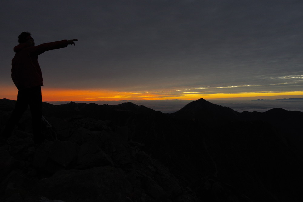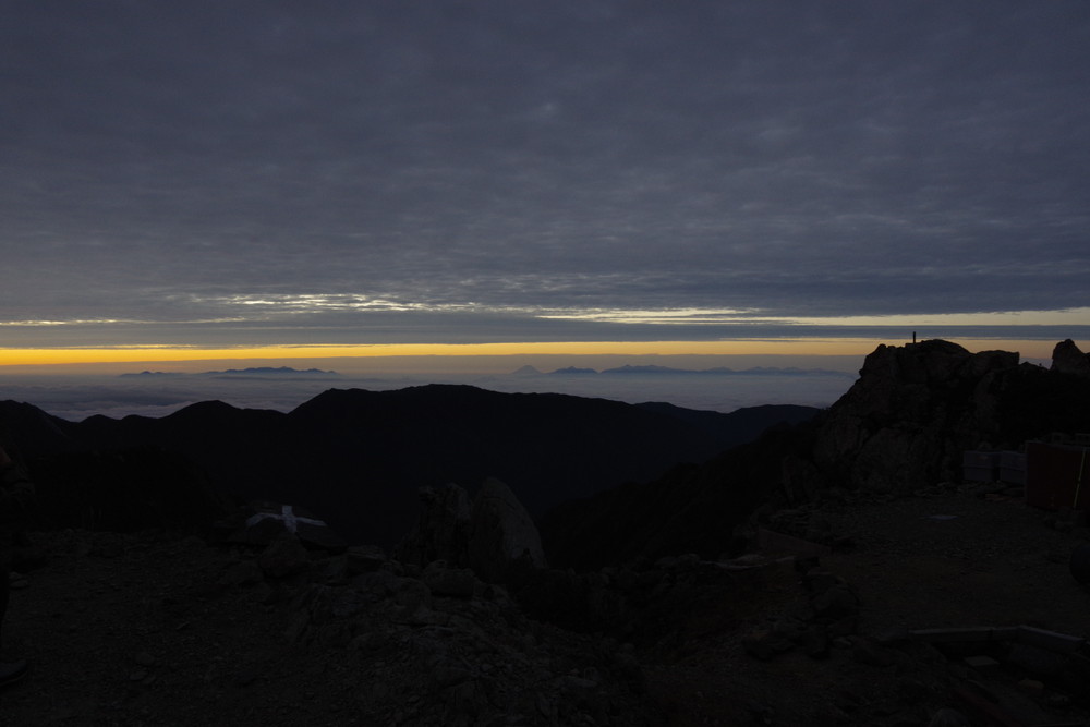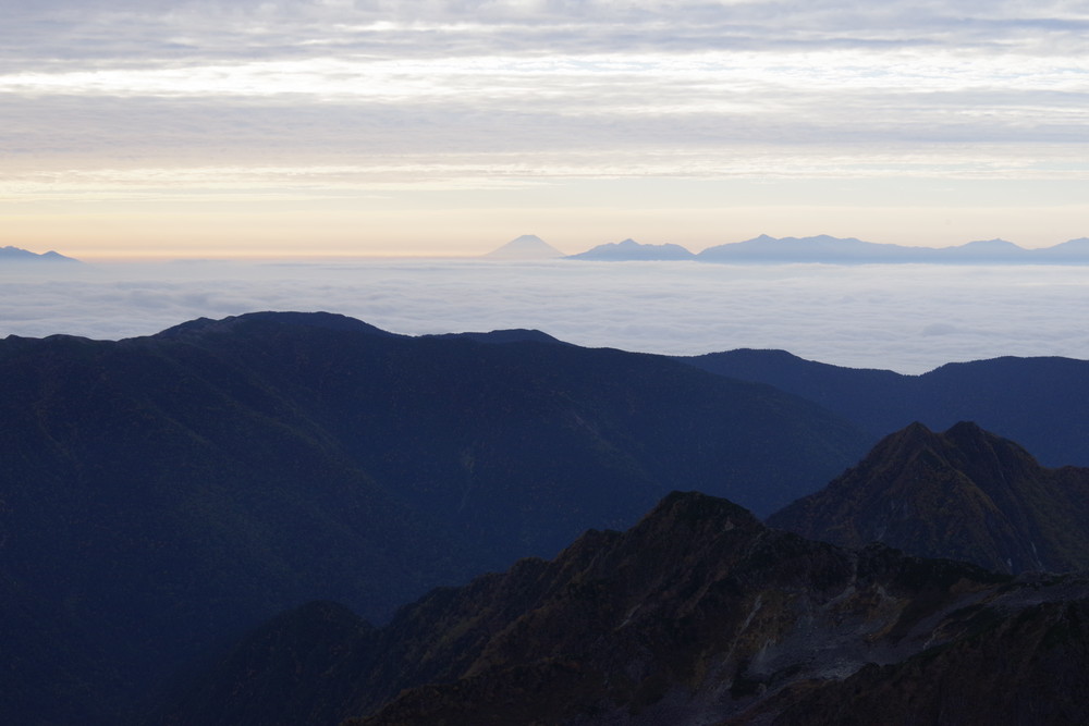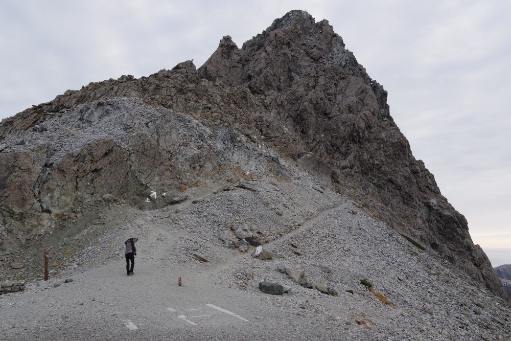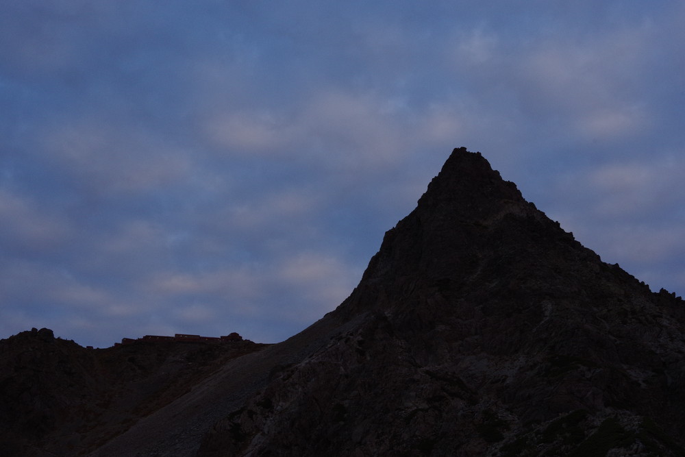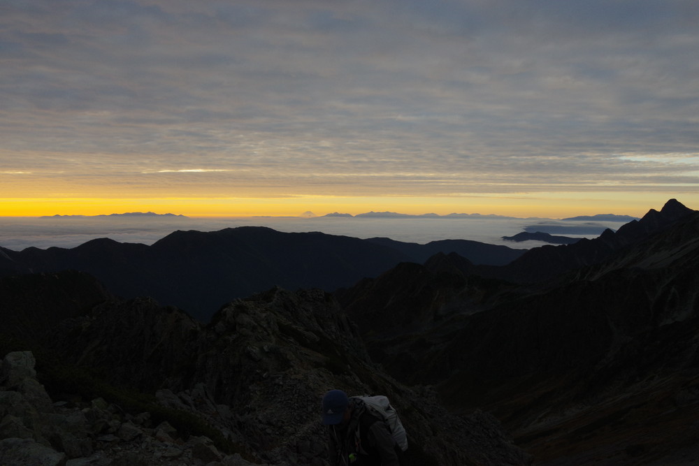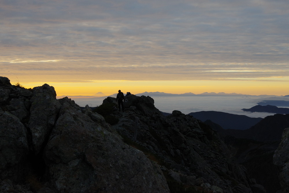 ヒュッテの前から富士山のシルエットを見たり撮ったりした後おもむろに槍ヶ岳に向かいました。