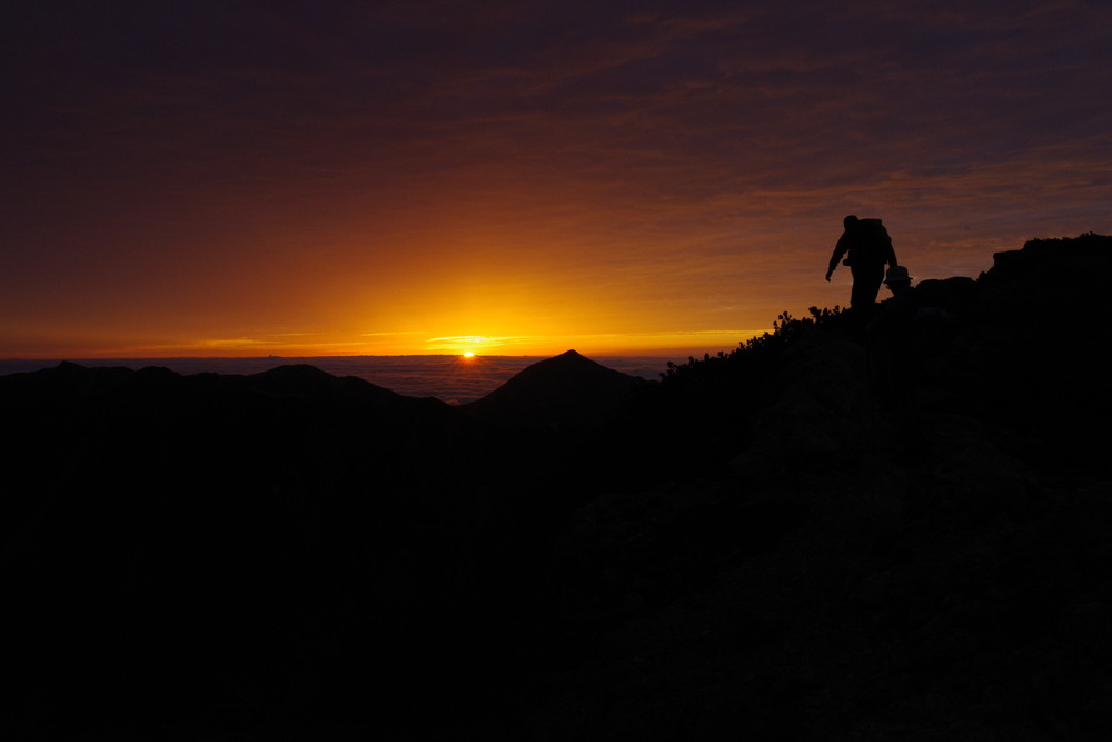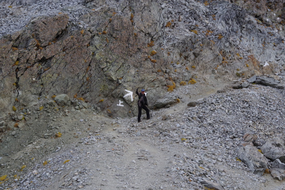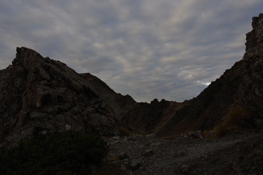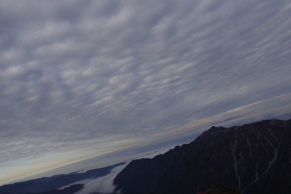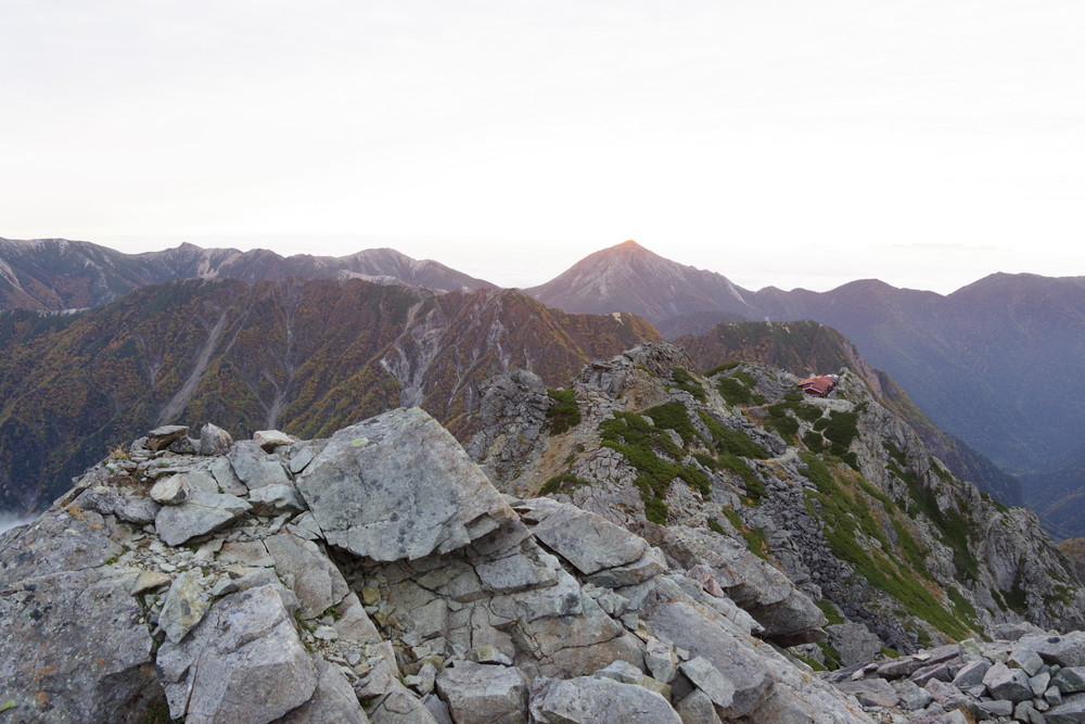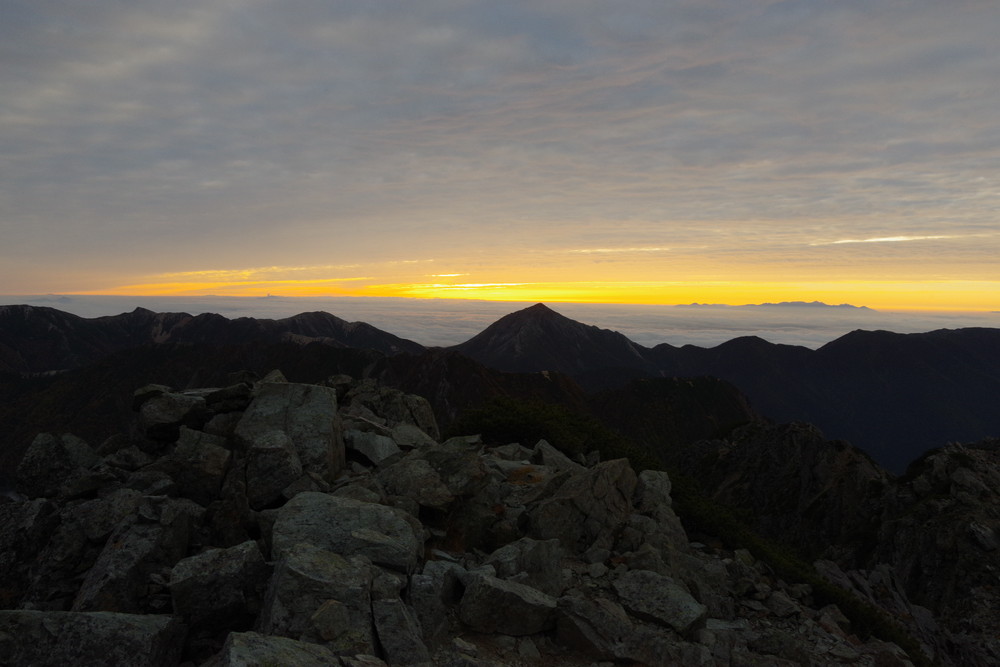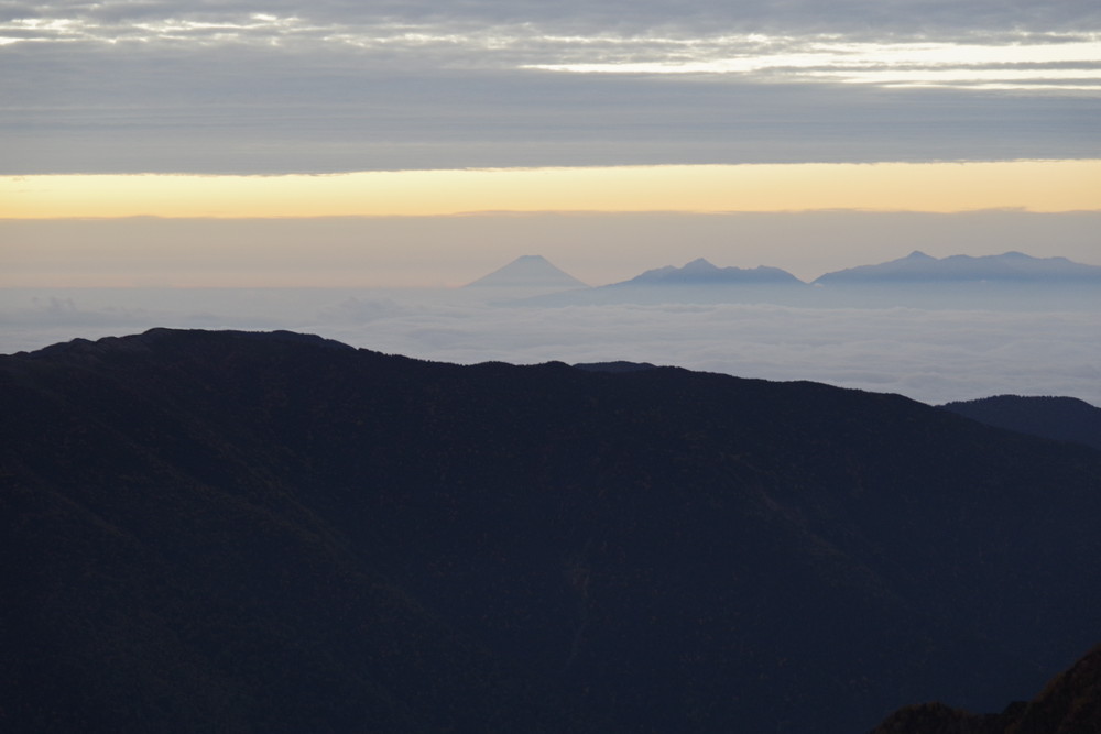 ヒュッテの前から富士山のシルエットを見たり撮ったりした後おもむろに槍ヶ岳に向かいました。