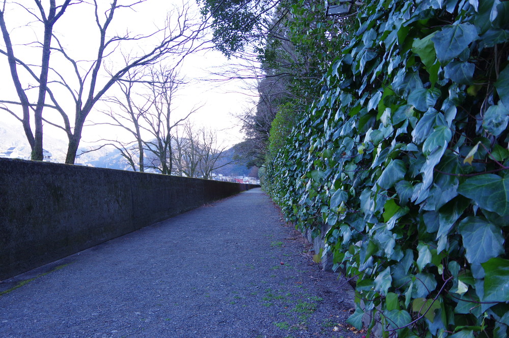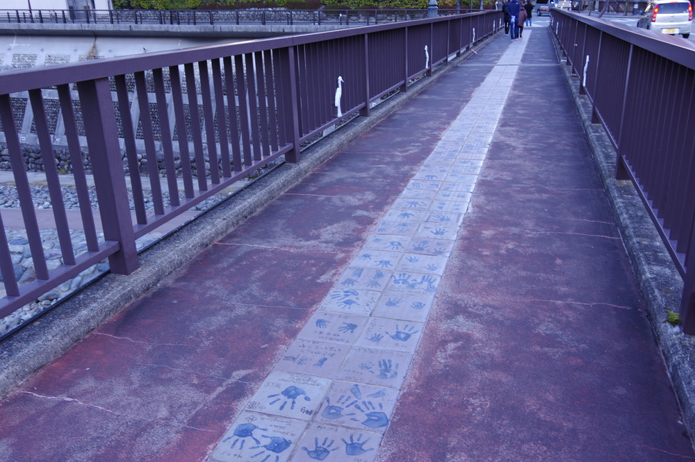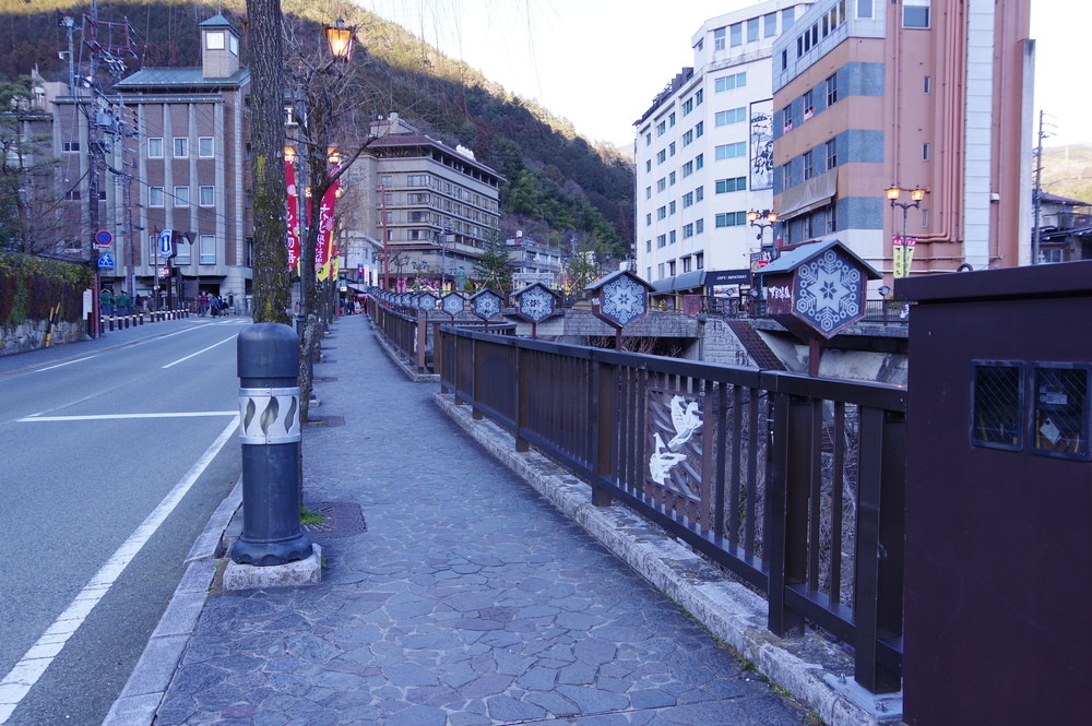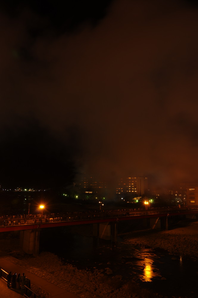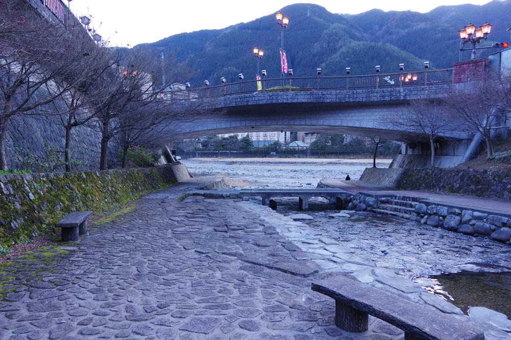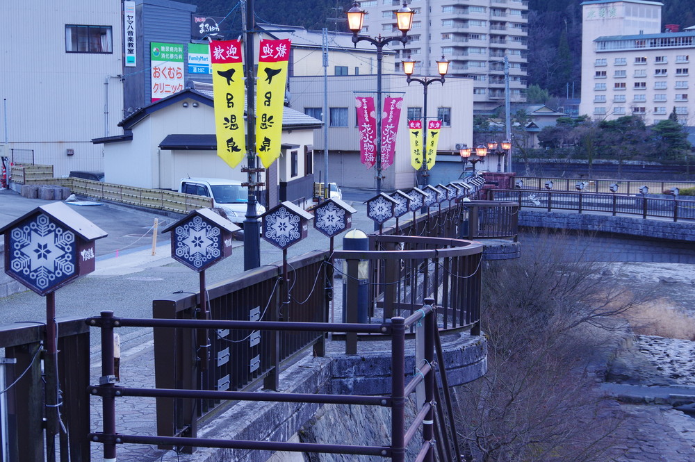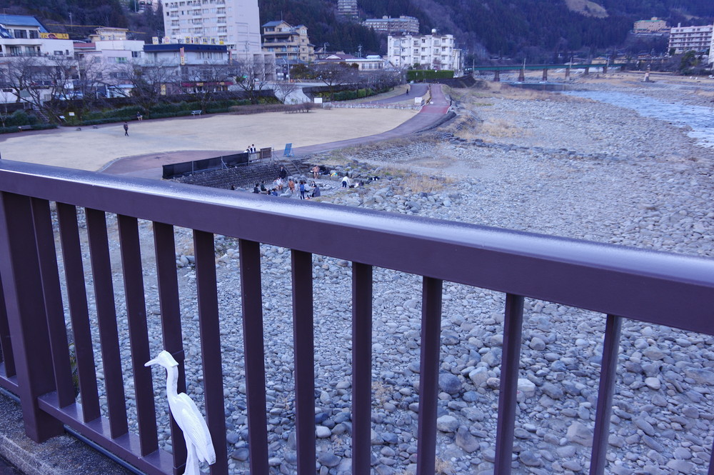 橋の欄干にシラサギ。 その向こうに露天温泉