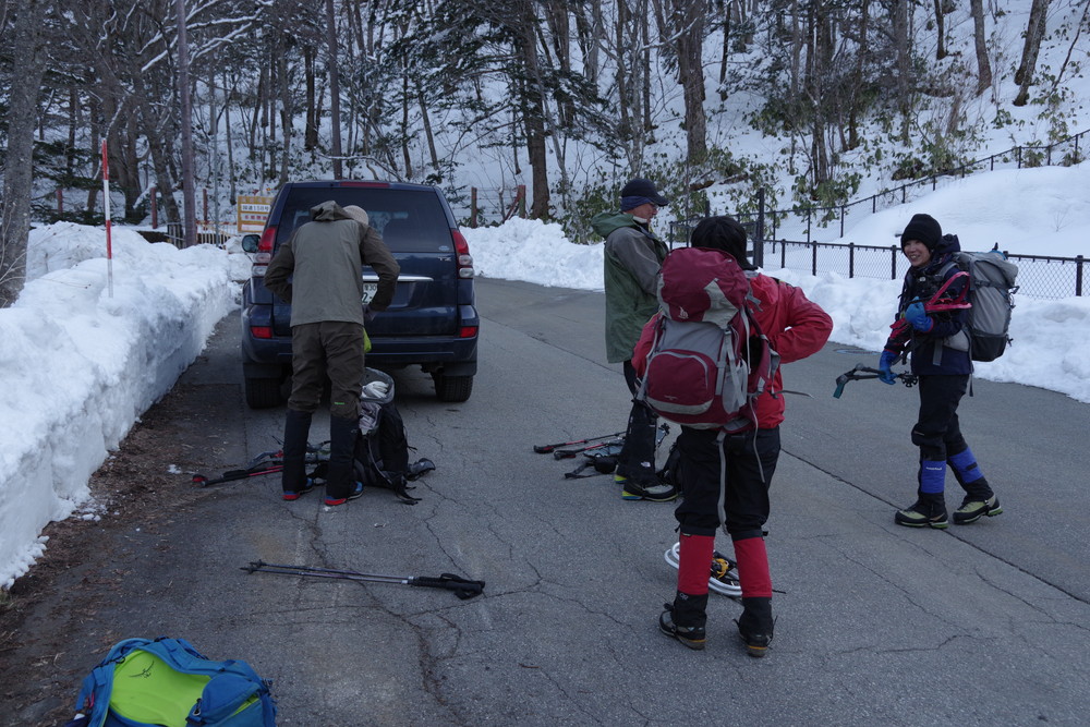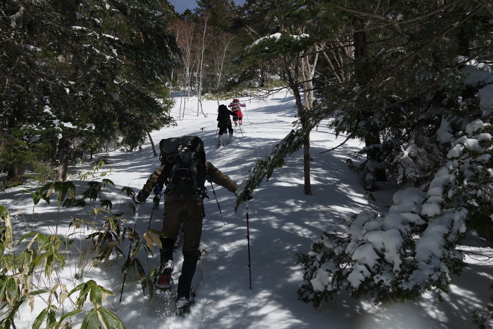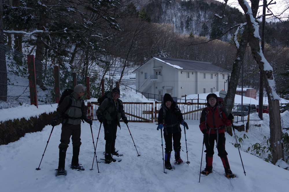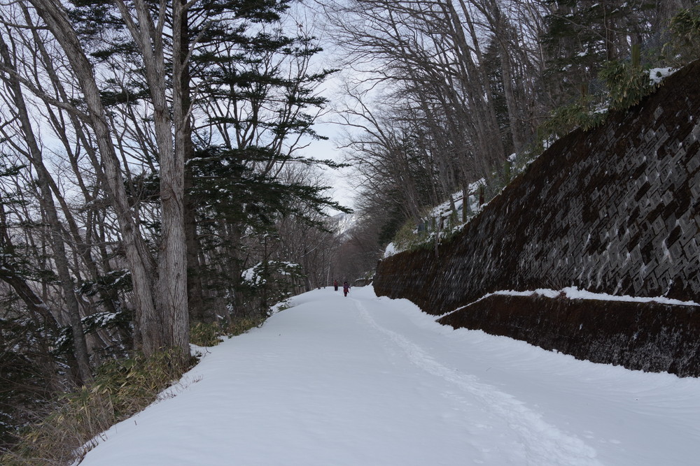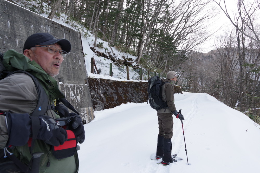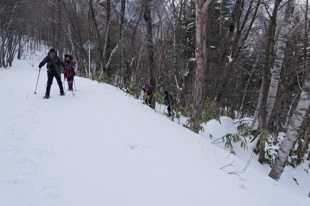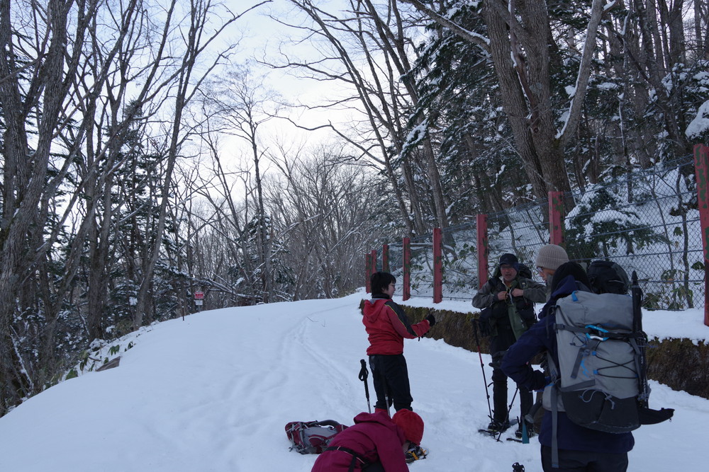 林道入り口まで相乗りで行き、柵を乗り越えたところからスノーシュー装着。林道歩きでした。