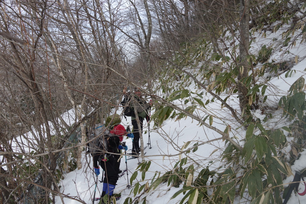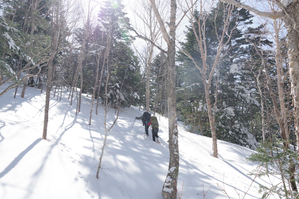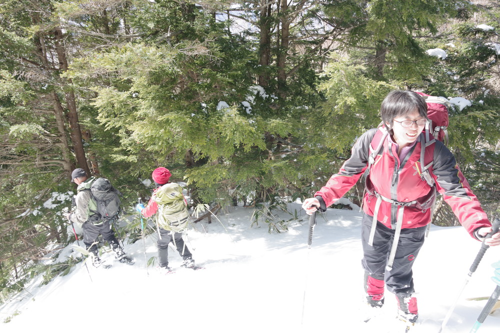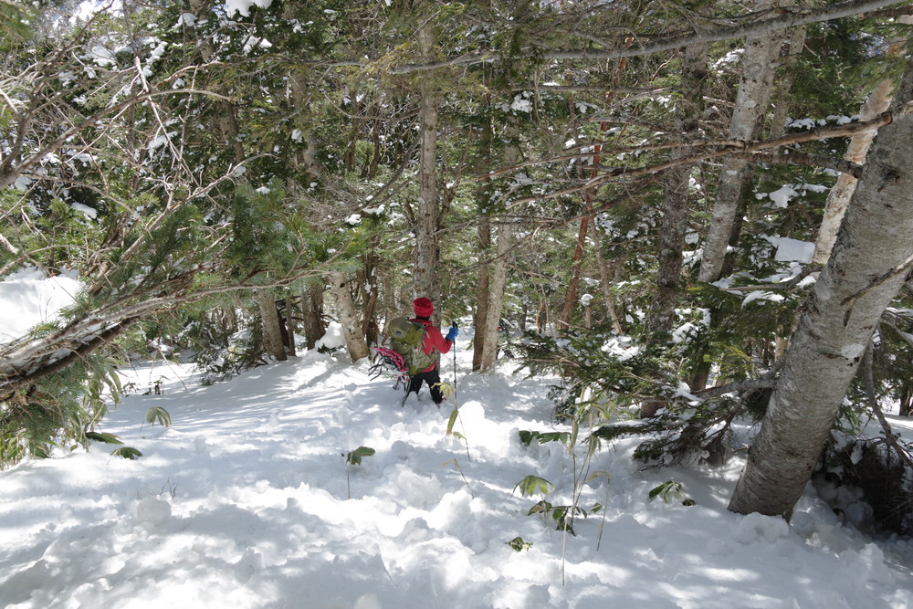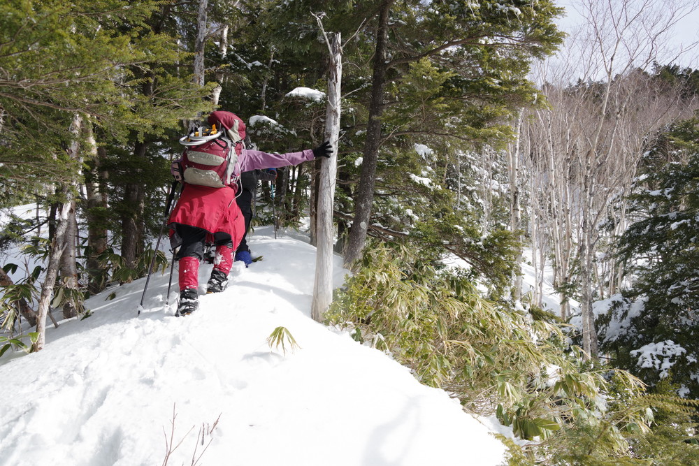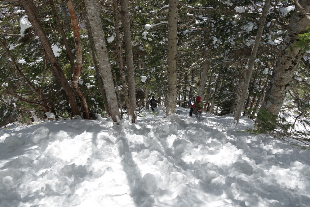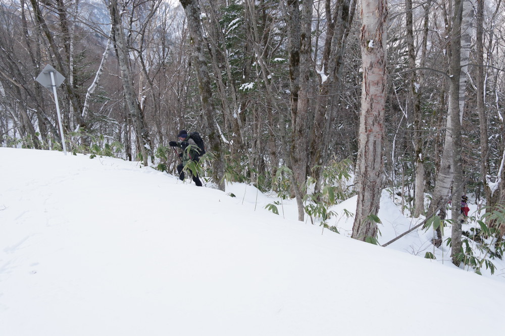 ヨッシーさんと小生は早々とスノーシューをあきらめアイゼンに履き替え。(スノーシューでは滑ってしまって上がれない)