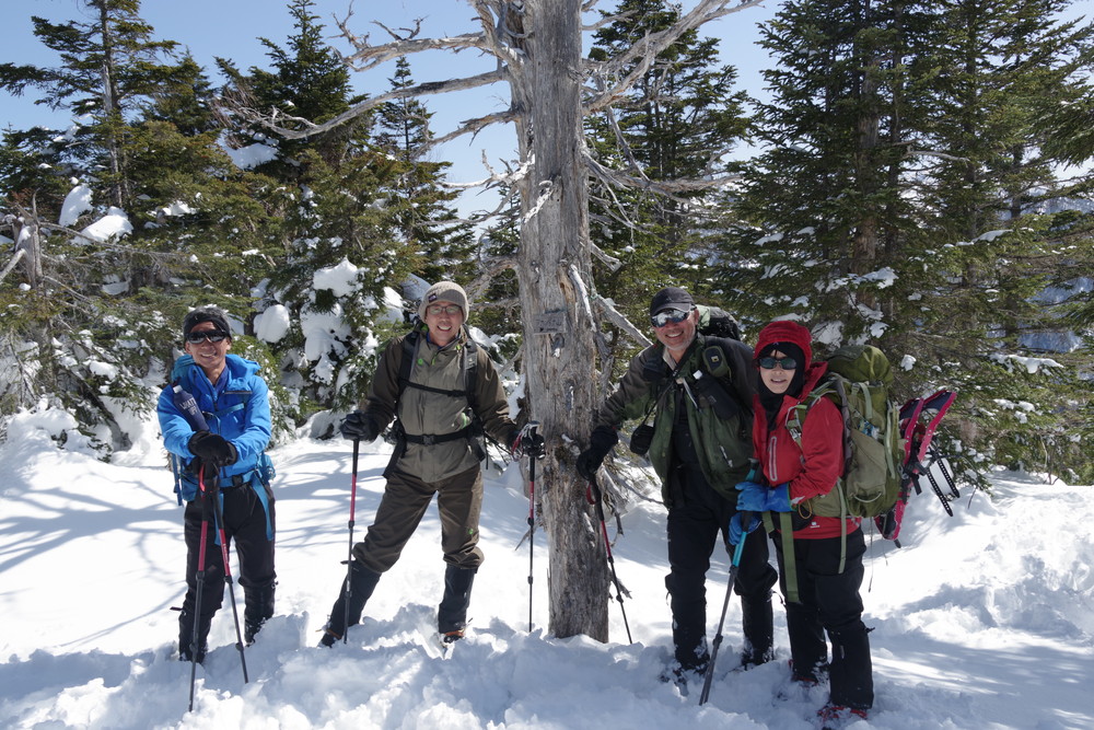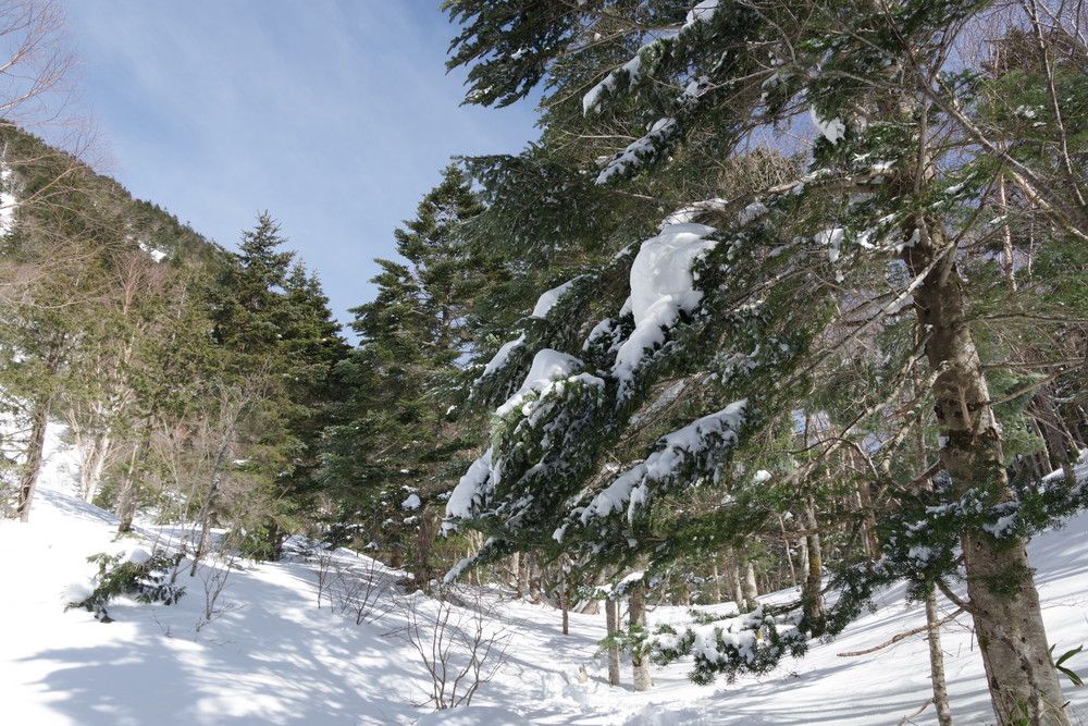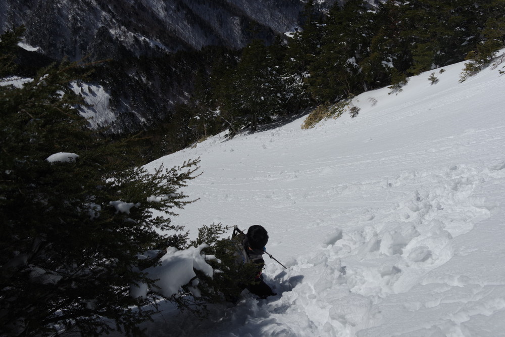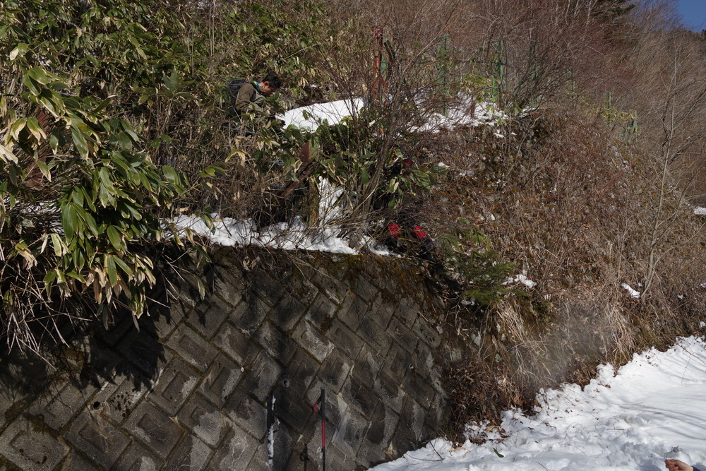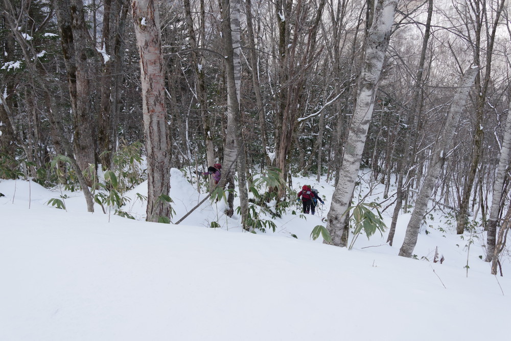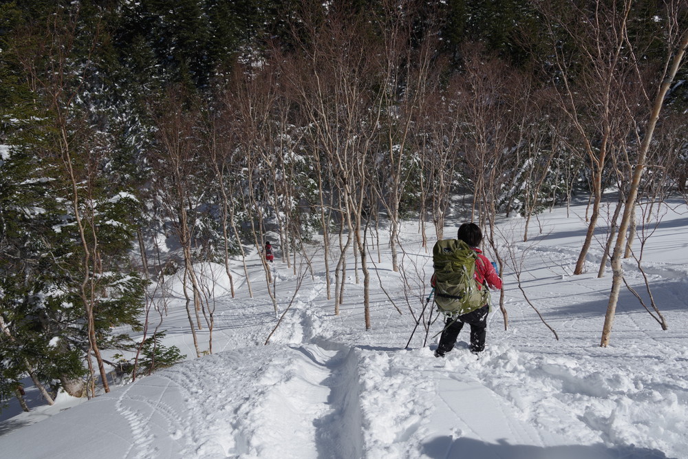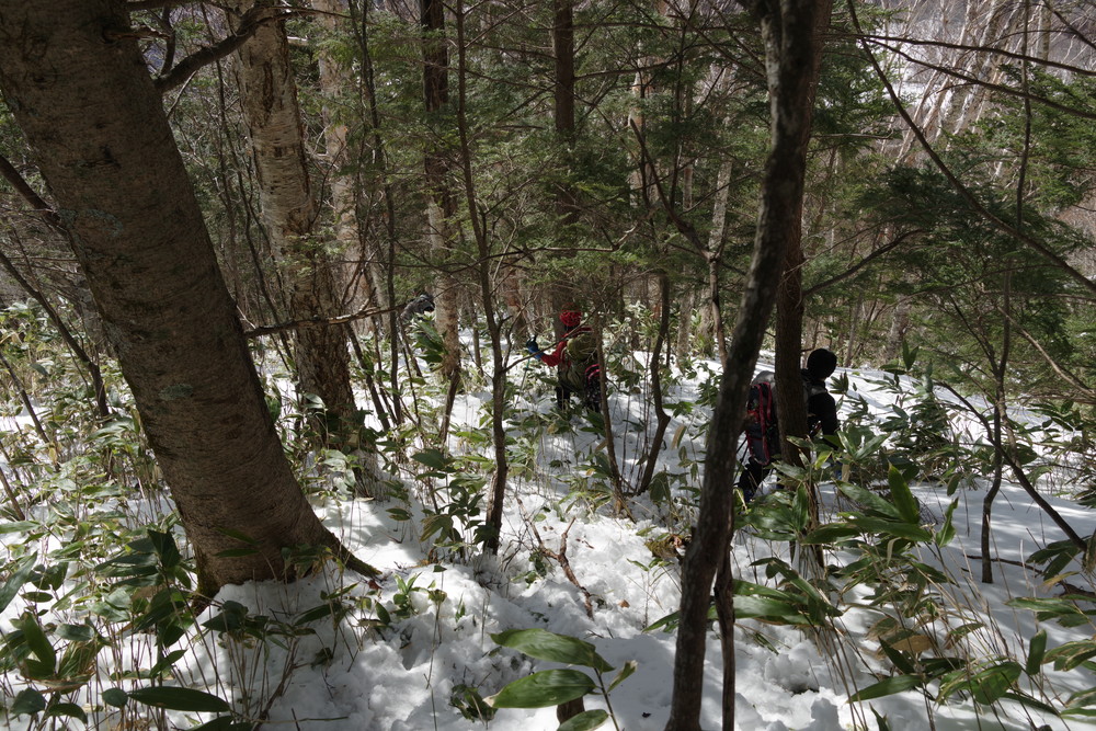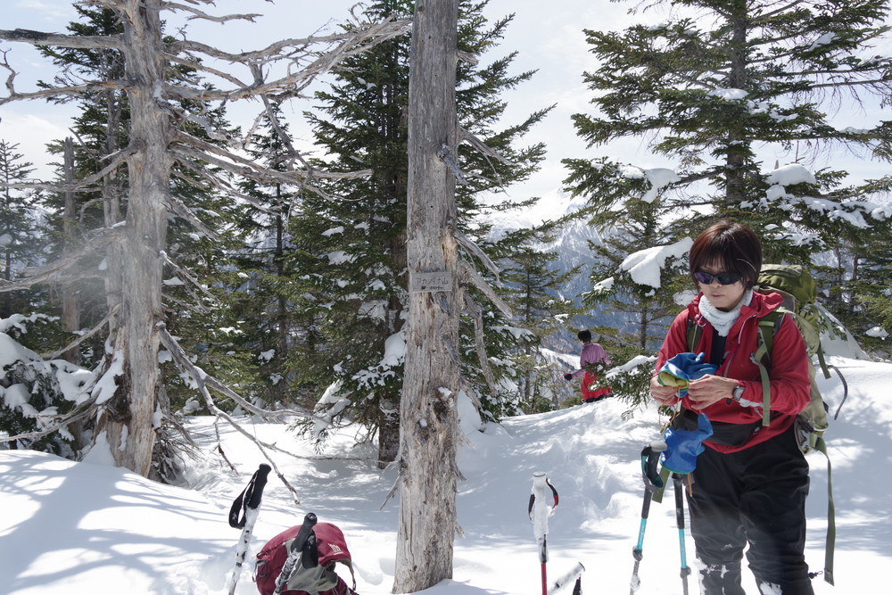 ヨッシーさんと小生は早々とスノーシューをあきらめアイゼンに履き替え。(スノーシューでは滑ってしまって上がれない)