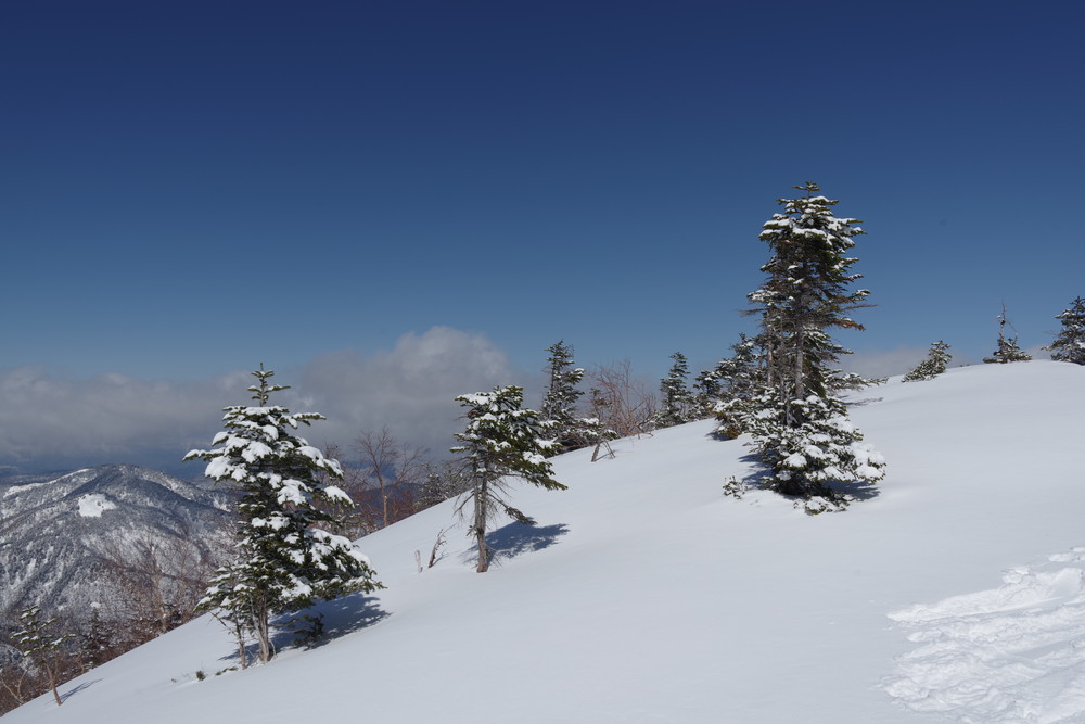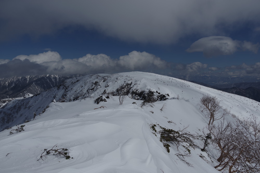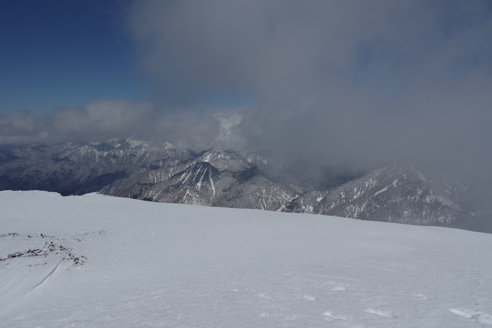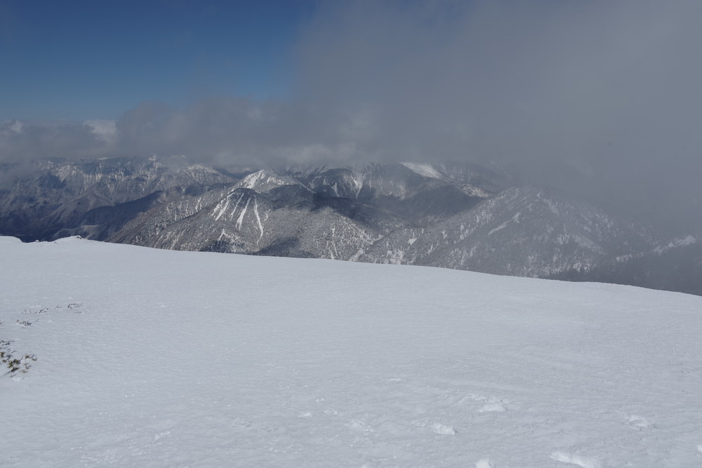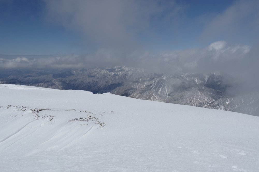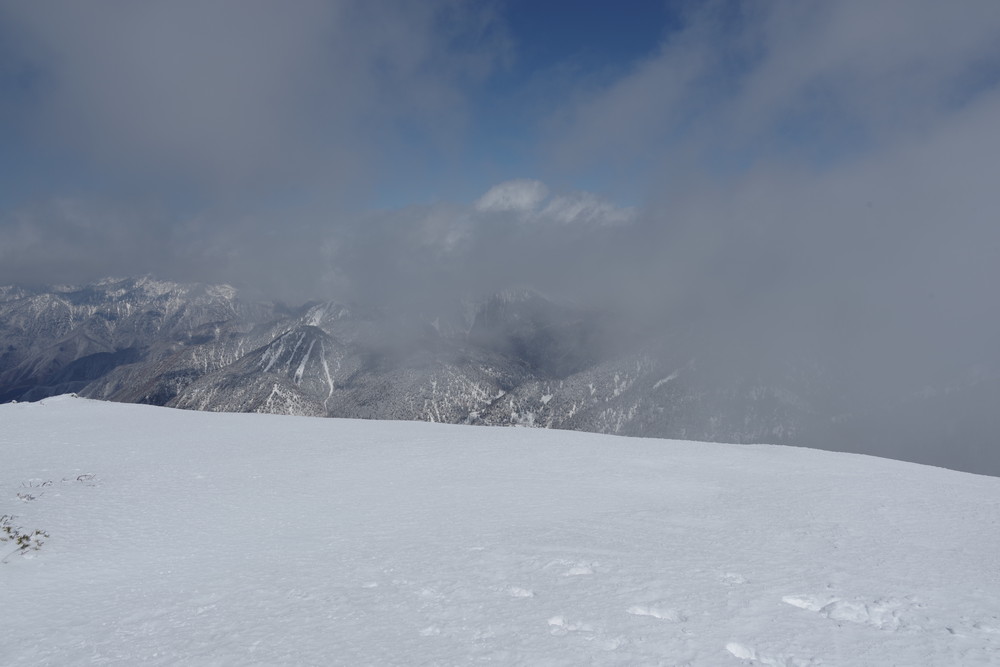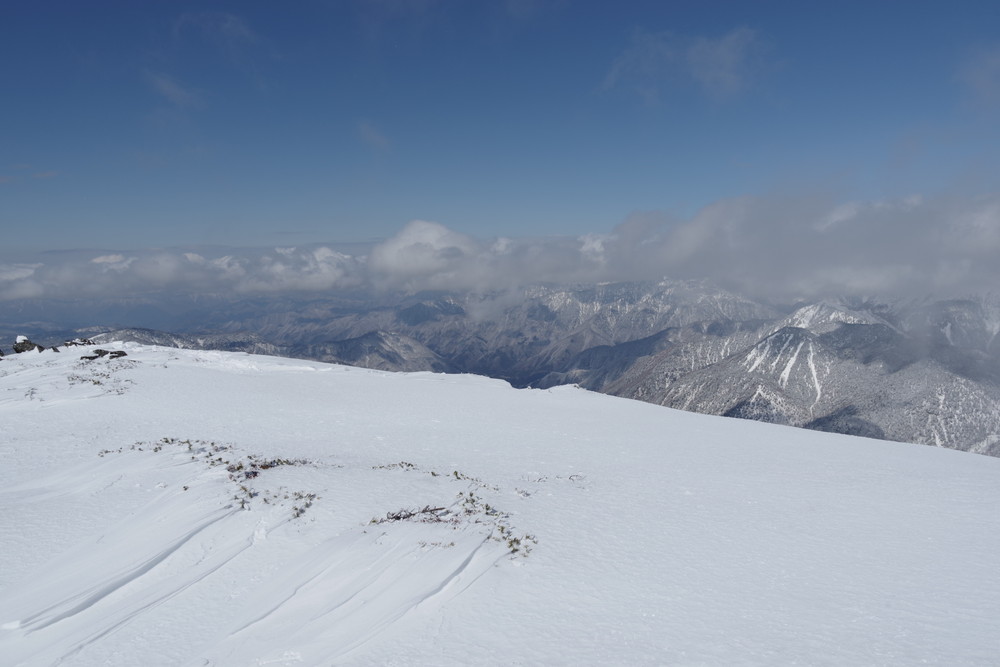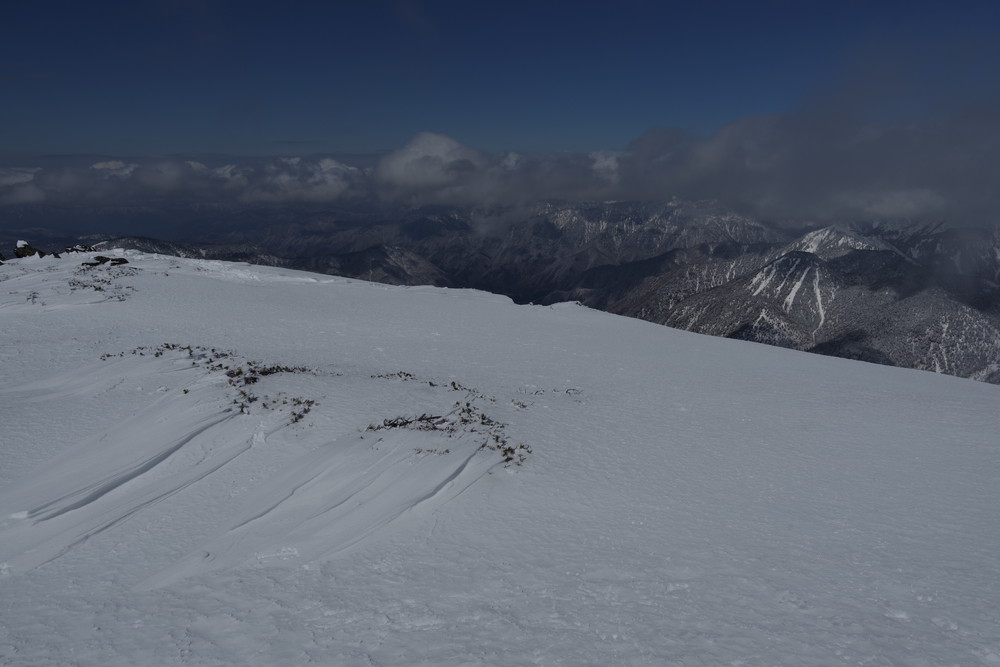 12分30秒で到着したところは2520mのピークで十石山の頂上(2524.9m)までにはまだ同程度の距離がありそうだったので引き返しました。
