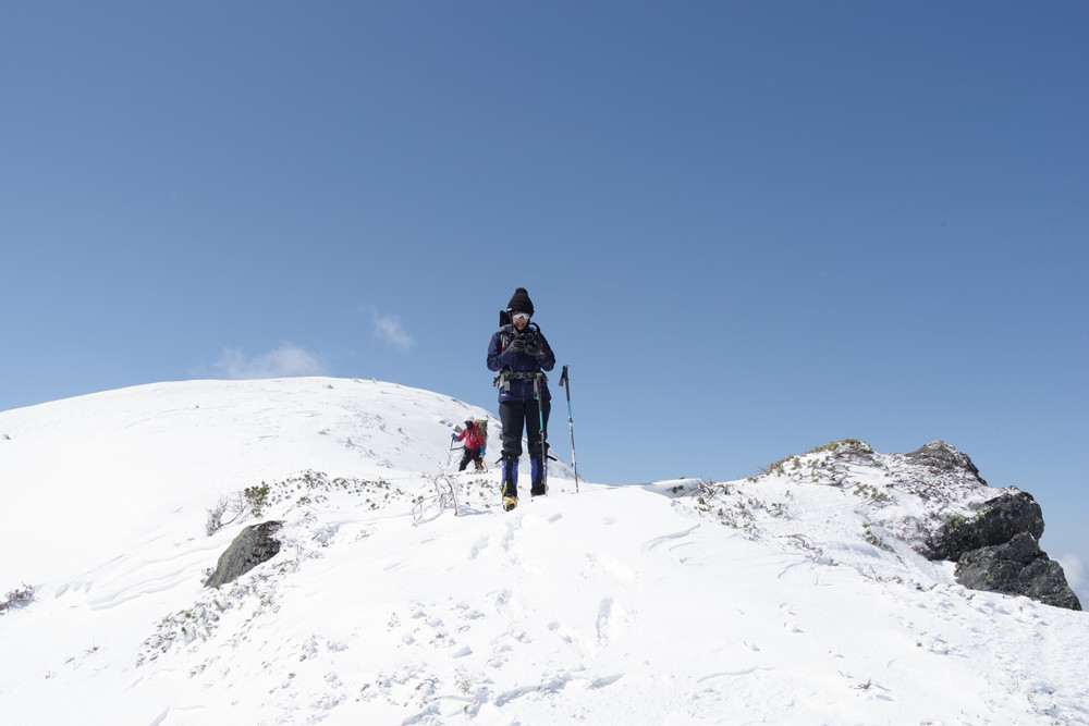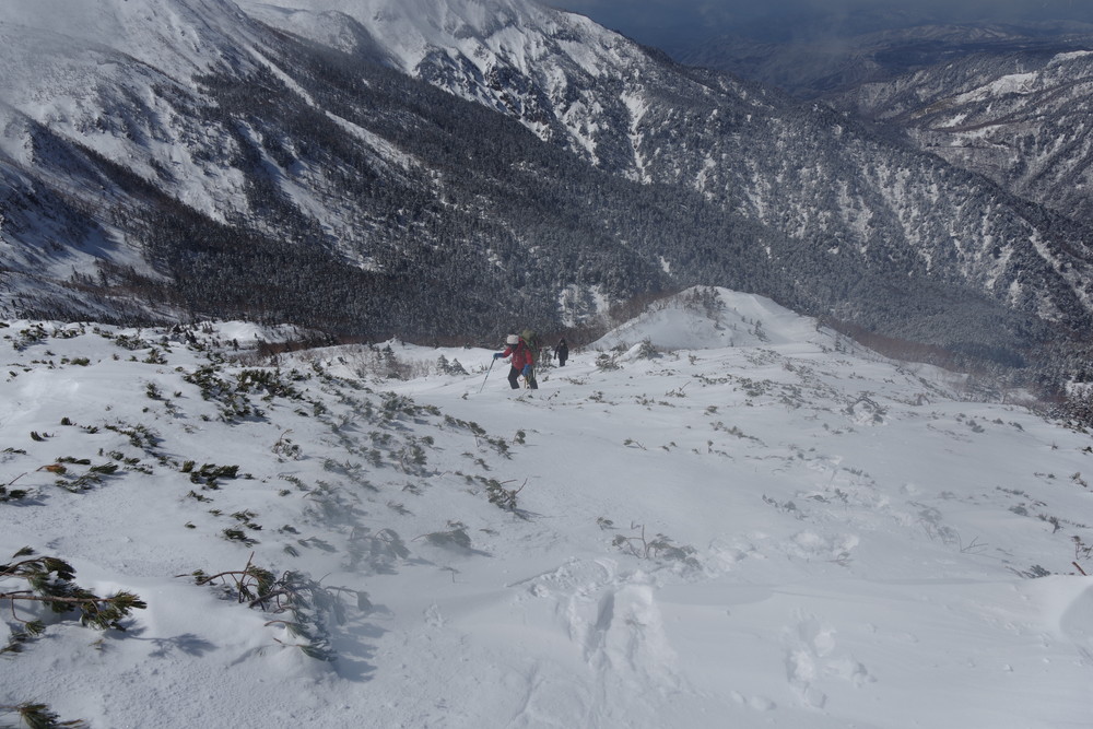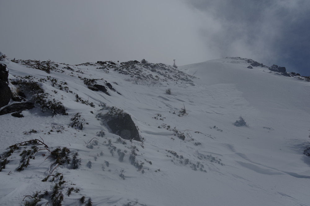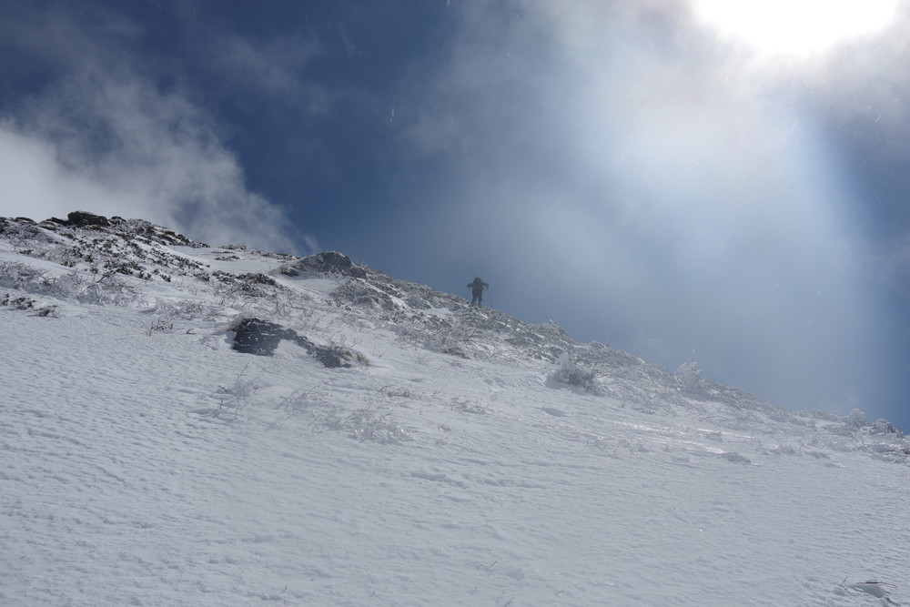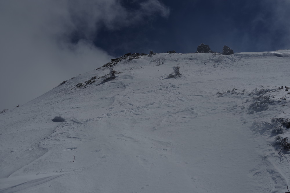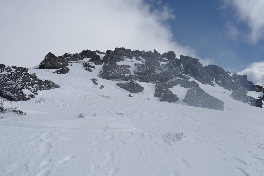 2435m地点でスノーシューからアイゼンに履き替えところどころ露出した岩を避けながらほぼ直登。