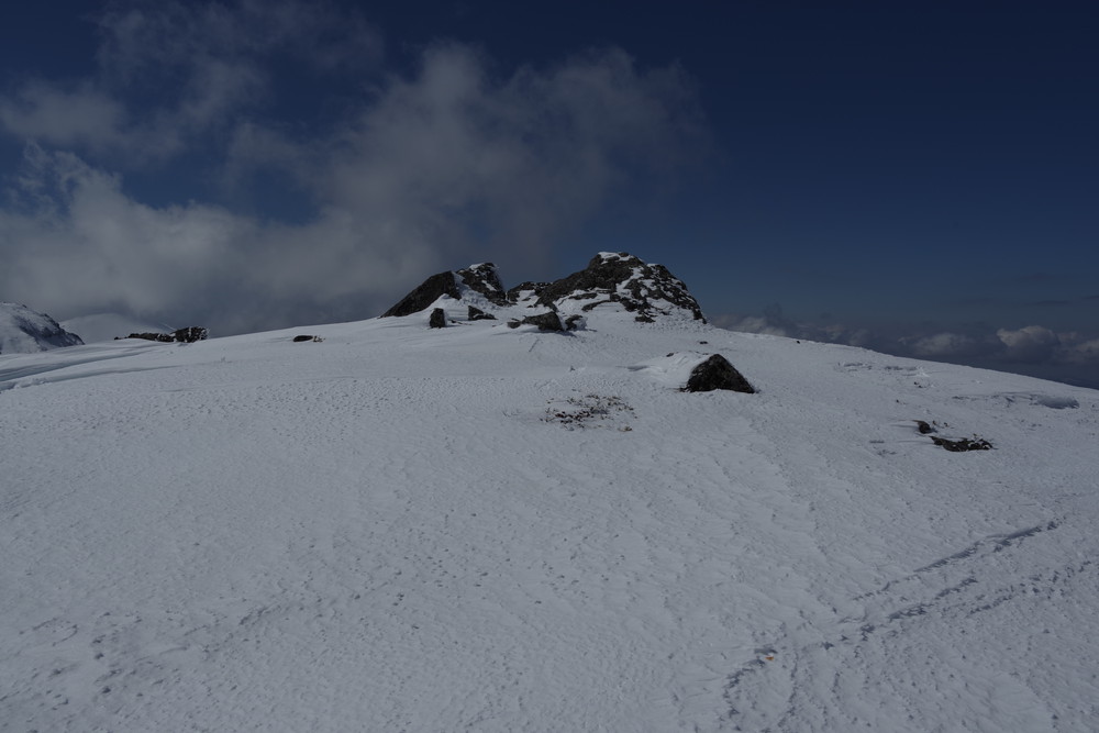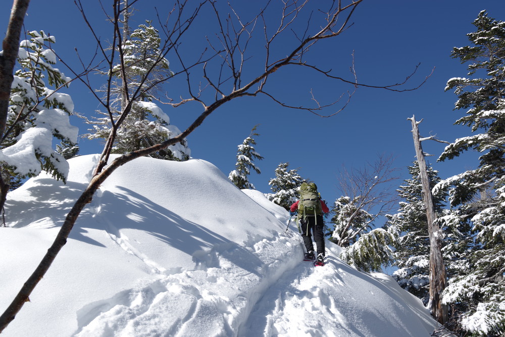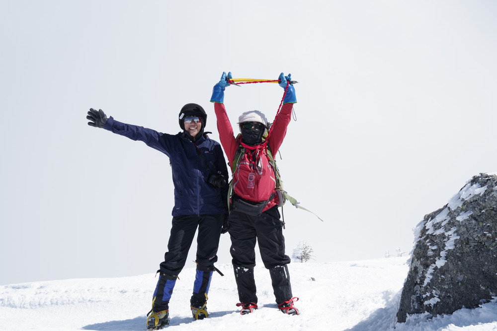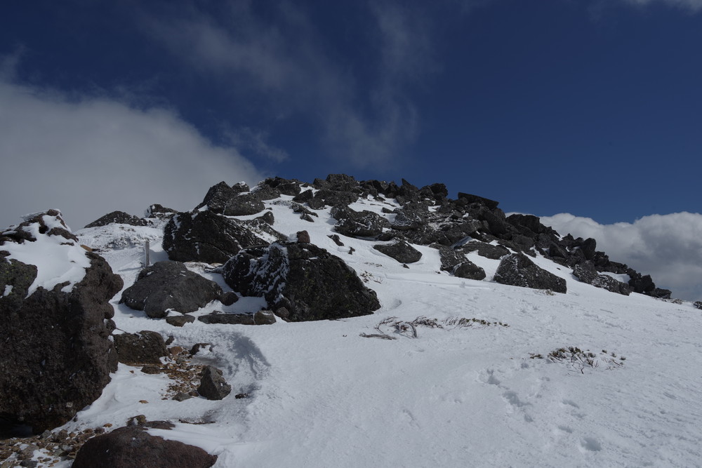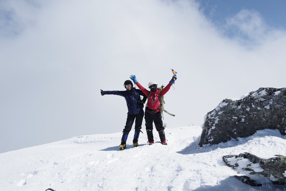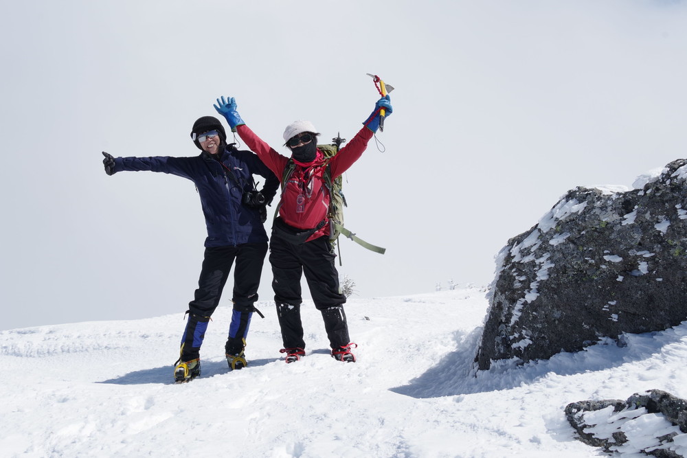2435m地点でスノーシューからアイゼンに履き替えところどころ露出した岩を避けながらほぼ直登。
