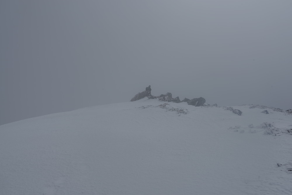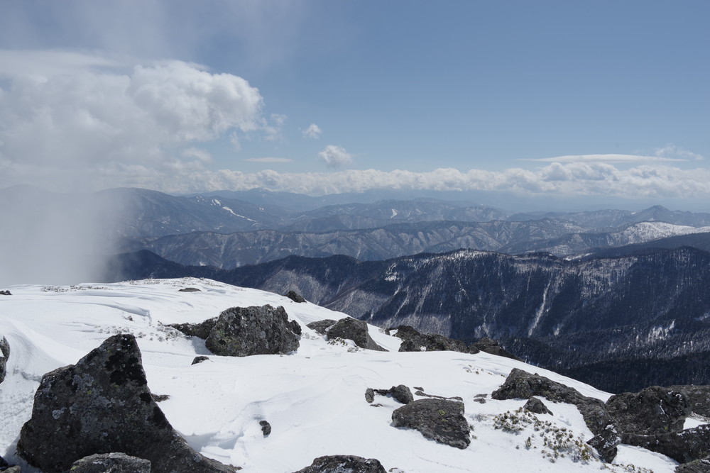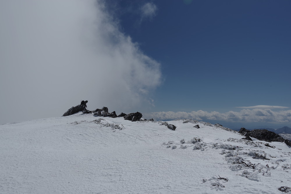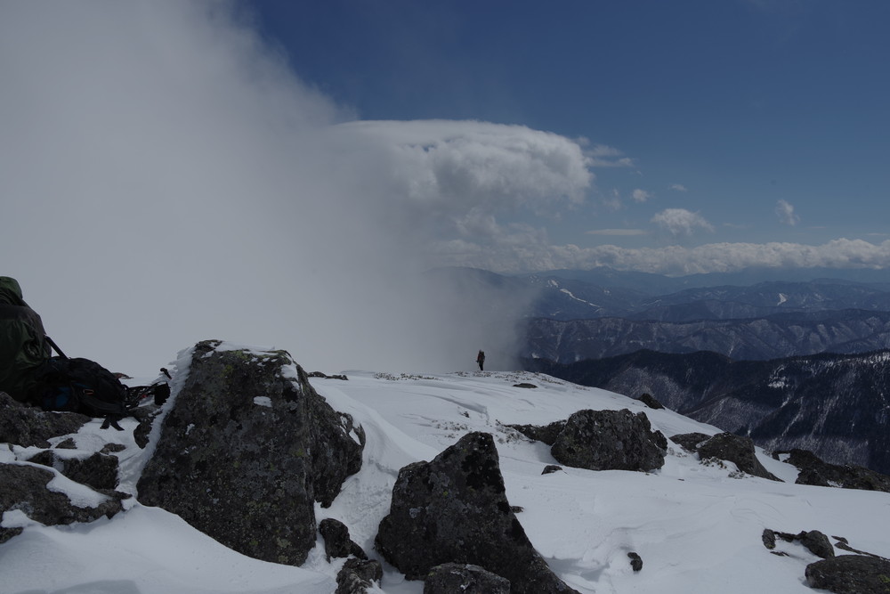 岩・岩の山頂は360度の絶景のはずでしたがガスが激しく流されてくるので穂高も見えたり見えなかったり。