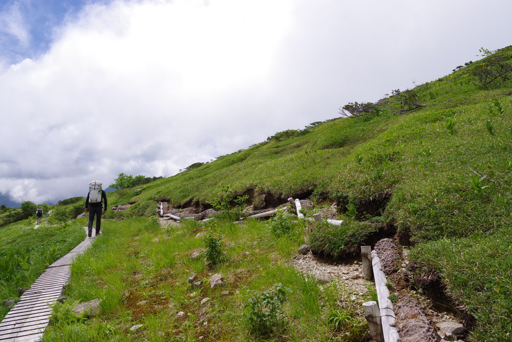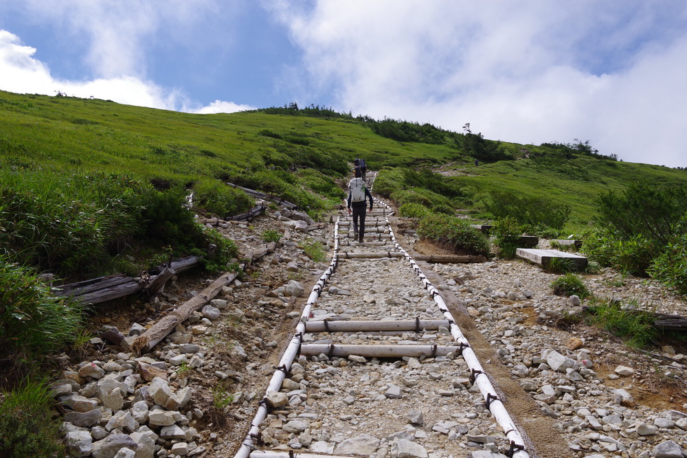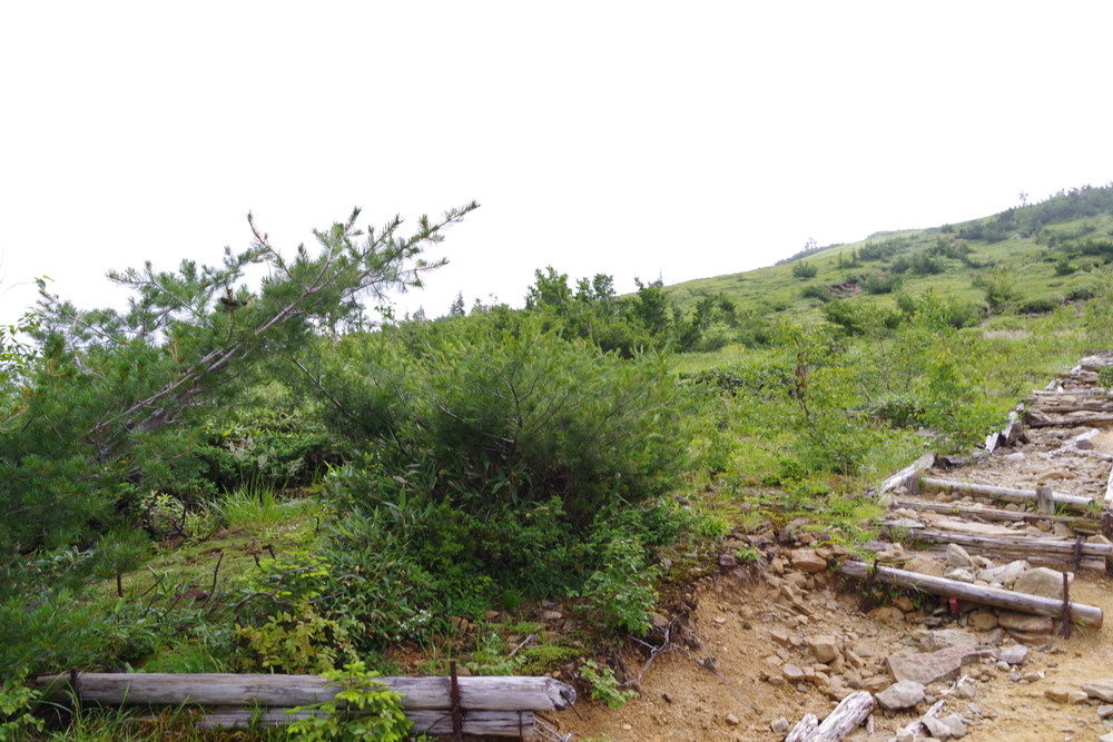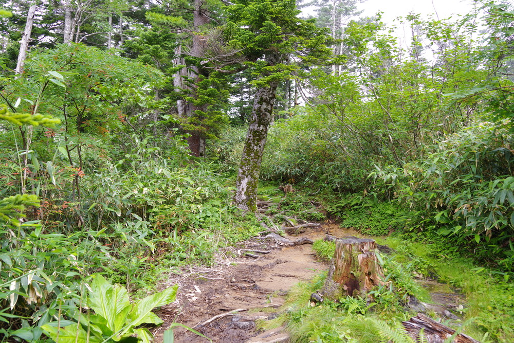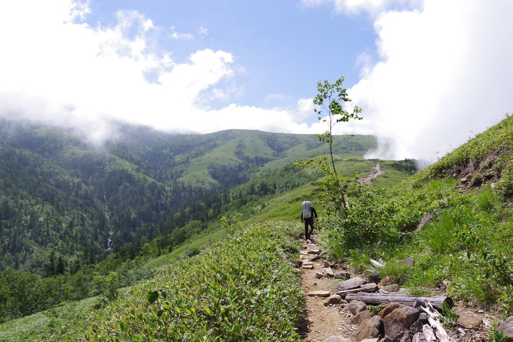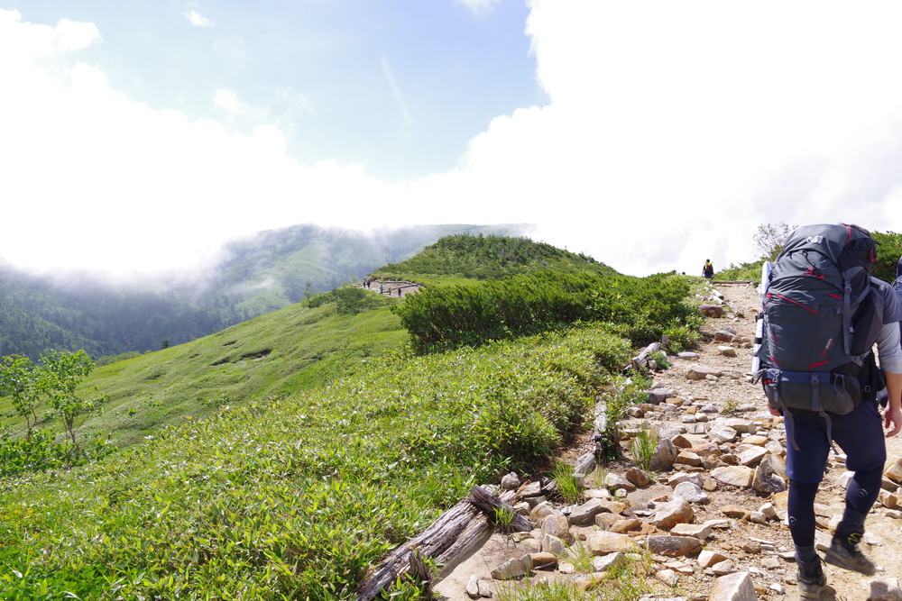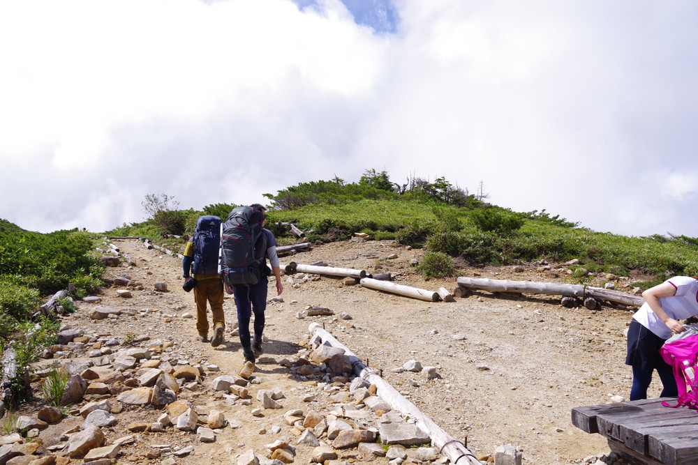 登山道を登り始めてすぐ重いザックに心が折られました。これは足腰よりも先に肩がやられそうだ・・・。
