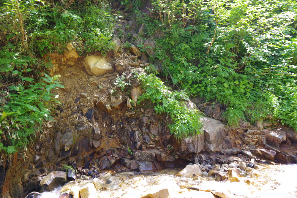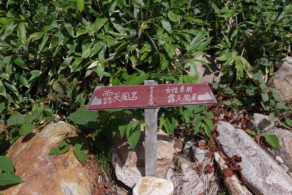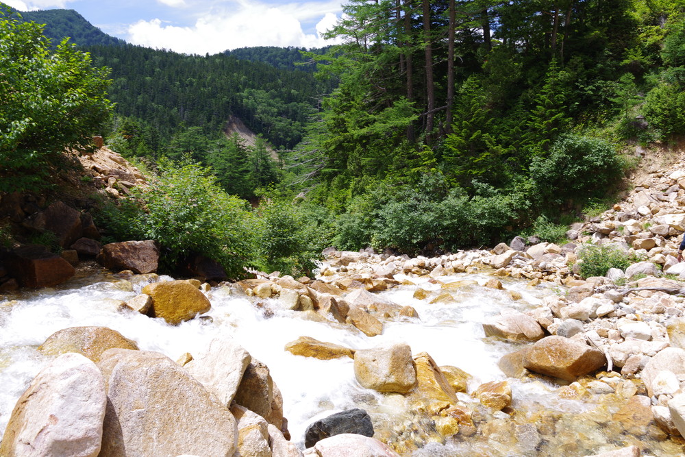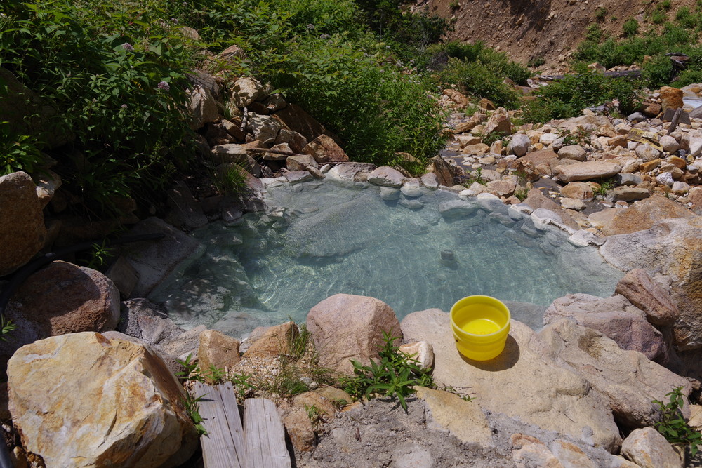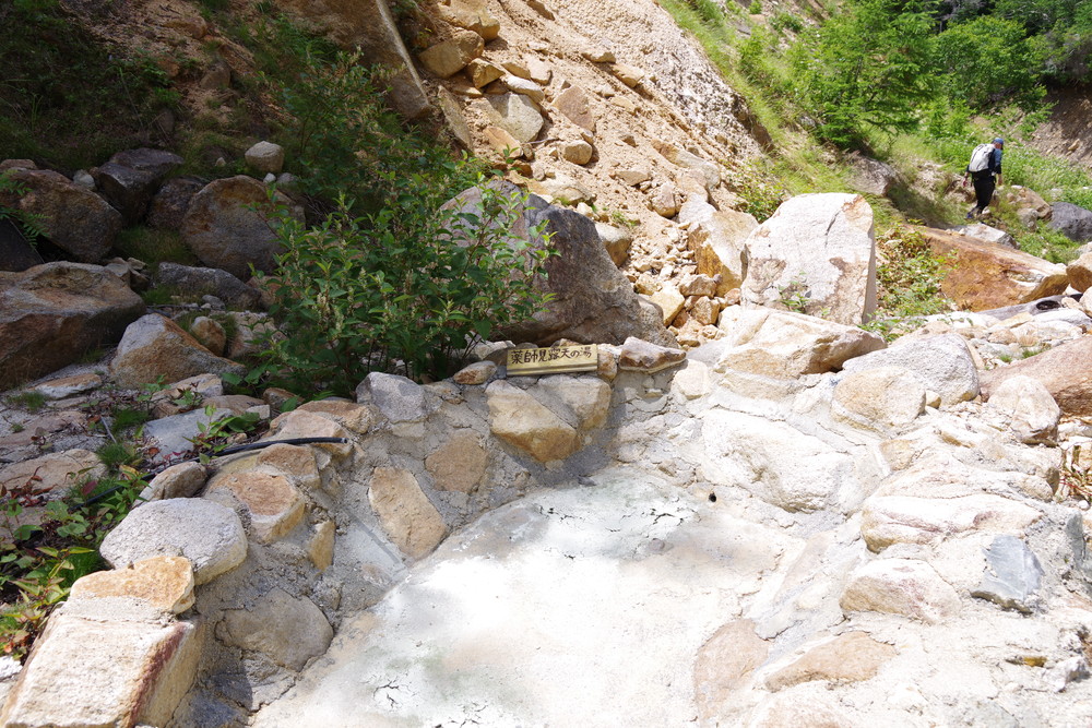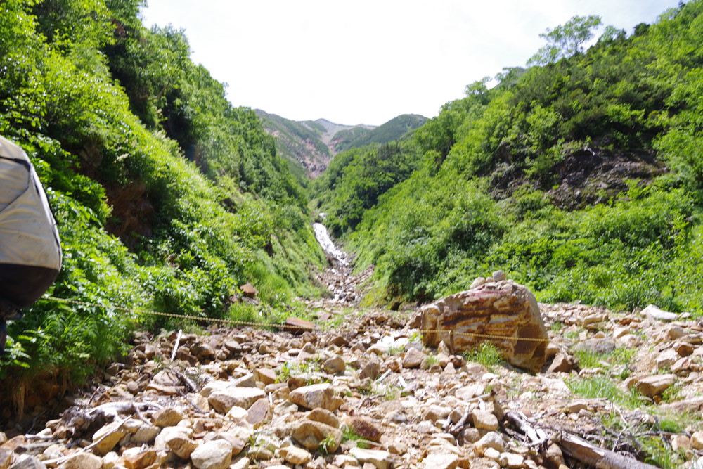 そこからなんと温泉沢に降り、沢靴に履き替え水の中をチャプチャプと高天原温泉まで歩きます。