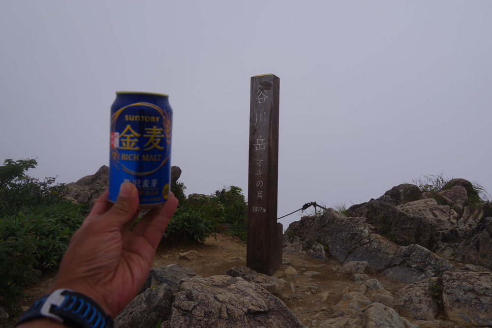 なんとか無事山頂にたどり着き竹輪をつまみに金麦飲んで引き返しました。