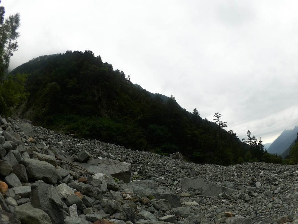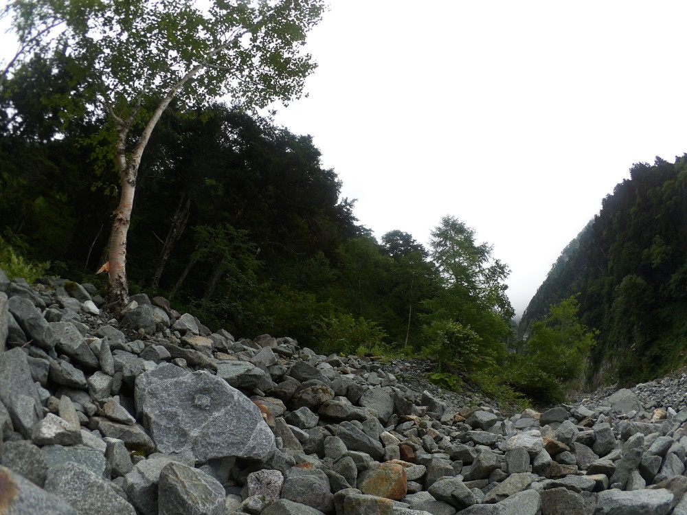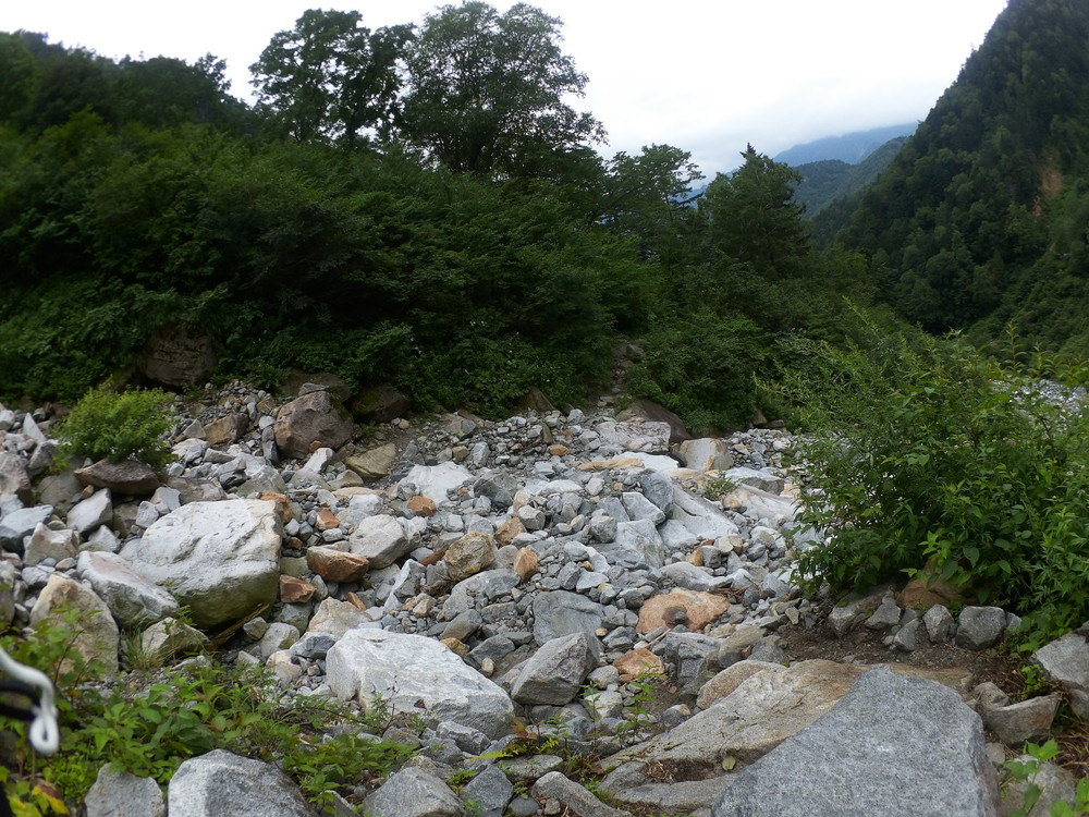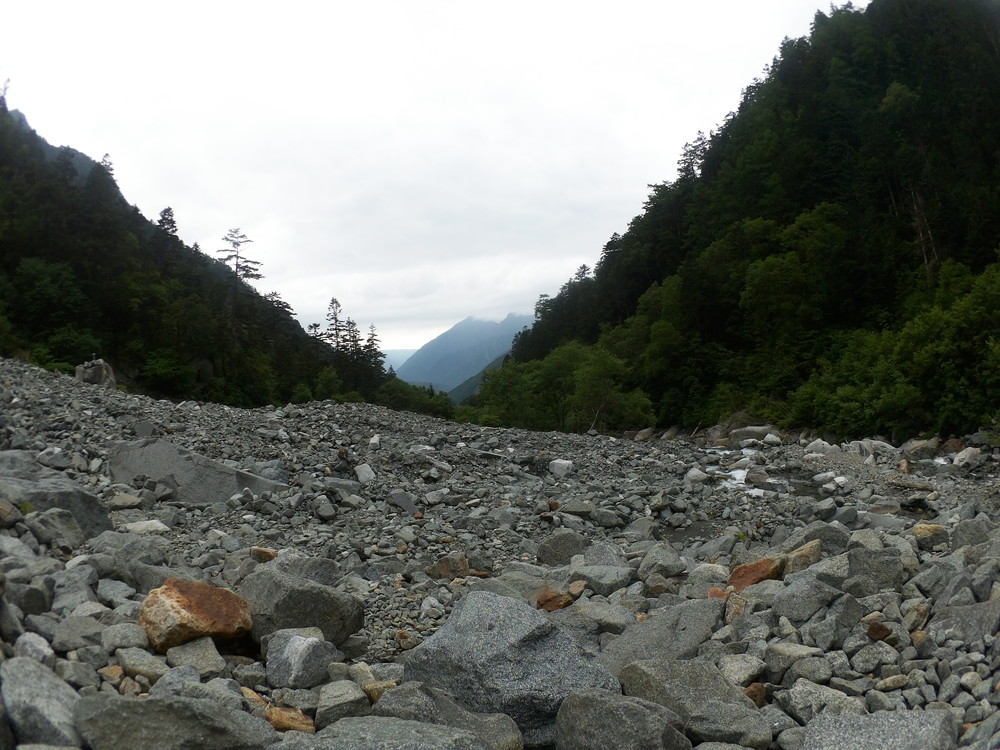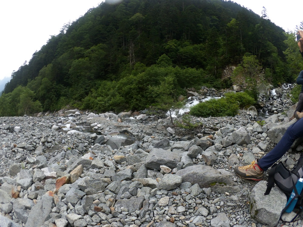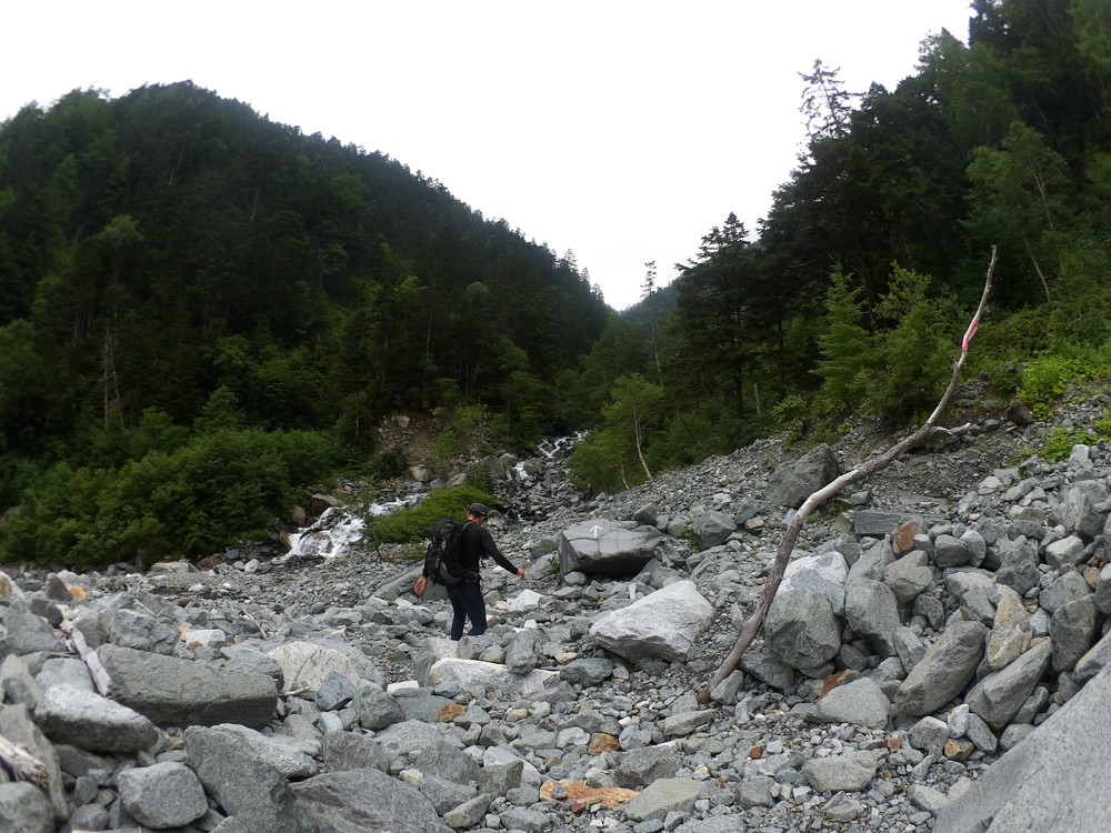 トコトコ歩いて滝谷出会で下山者が「槍平小屋の人が今日は天狗沢と滝谷出会いの橋が流されるほどになるので今から登ってくる人に伝えてと言われた」とのこと。