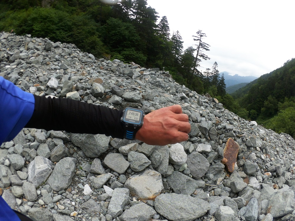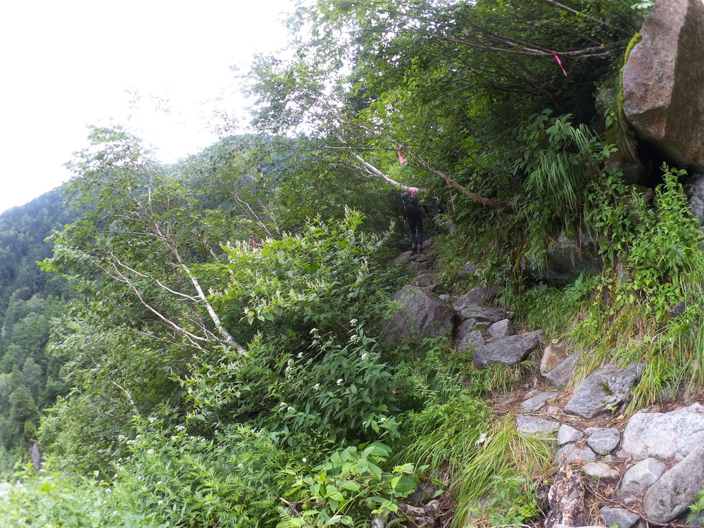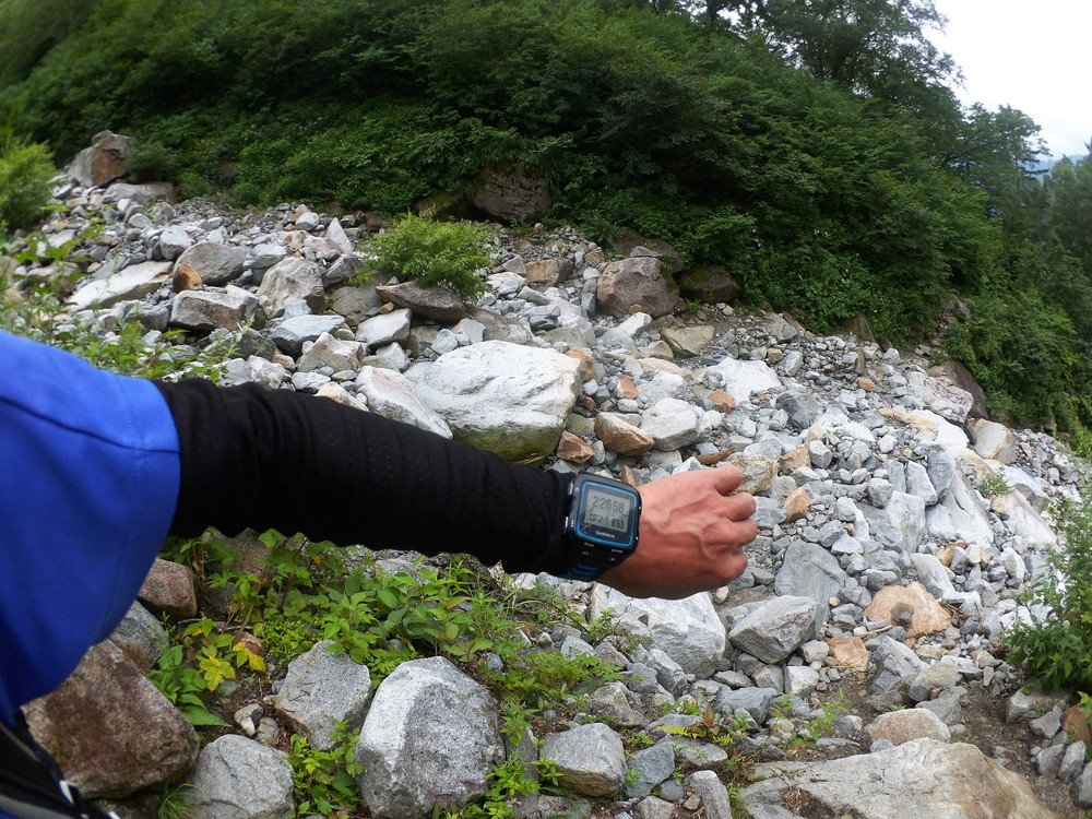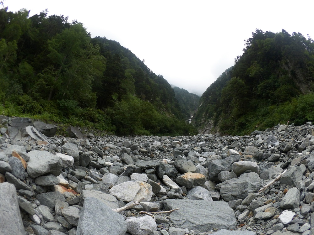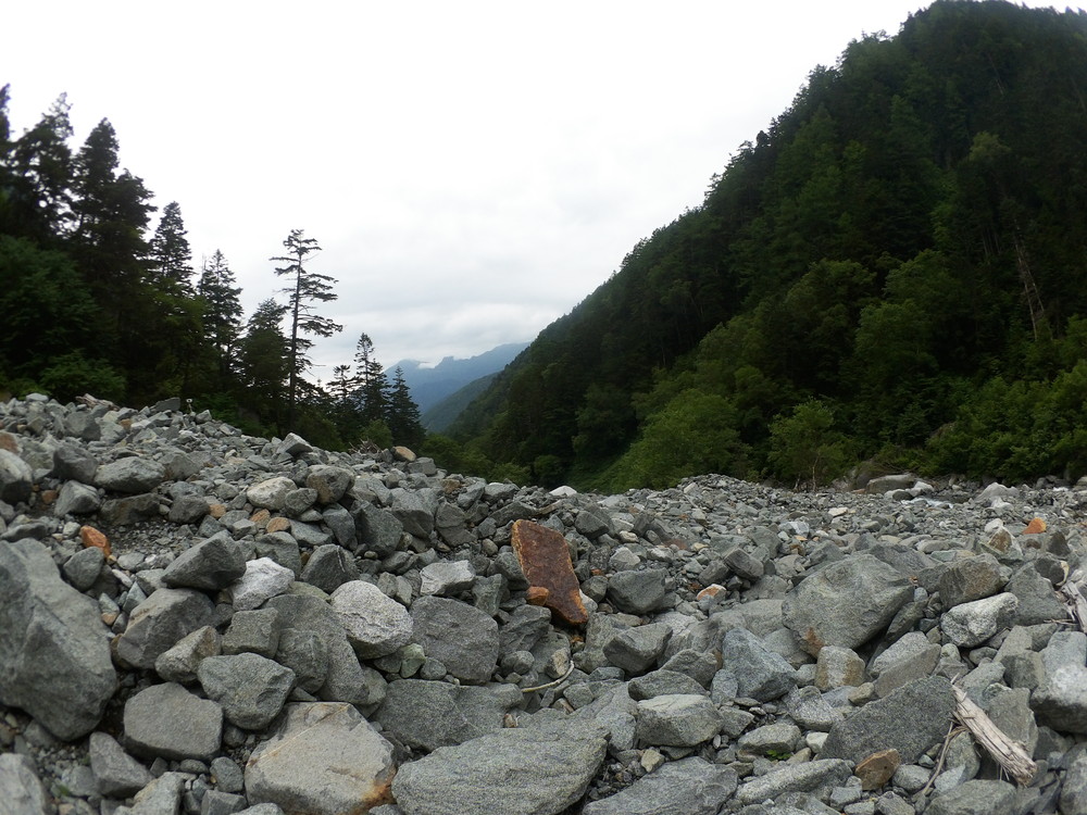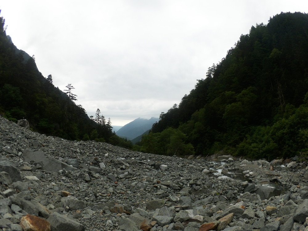 トコトコ歩いて滝谷出会で下山者が「槍平小屋の人が今日は天狗沢と滝谷出会いの橋が流されるほどになるので今から登ってくる人に伝えてと言われた」とのこと。