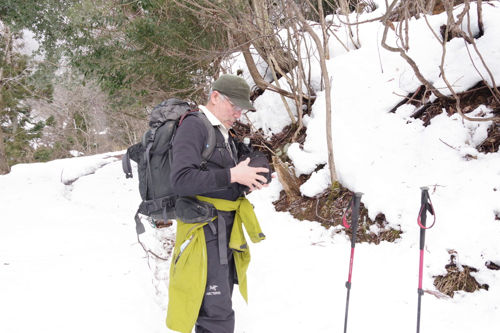 登り始めて(とりつき地点から)2時間後、840m地点でテーブルを作って伊串君と二人でランチを始める。