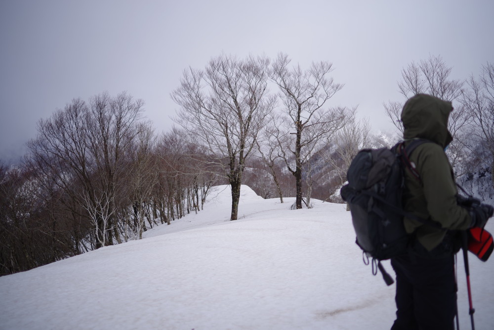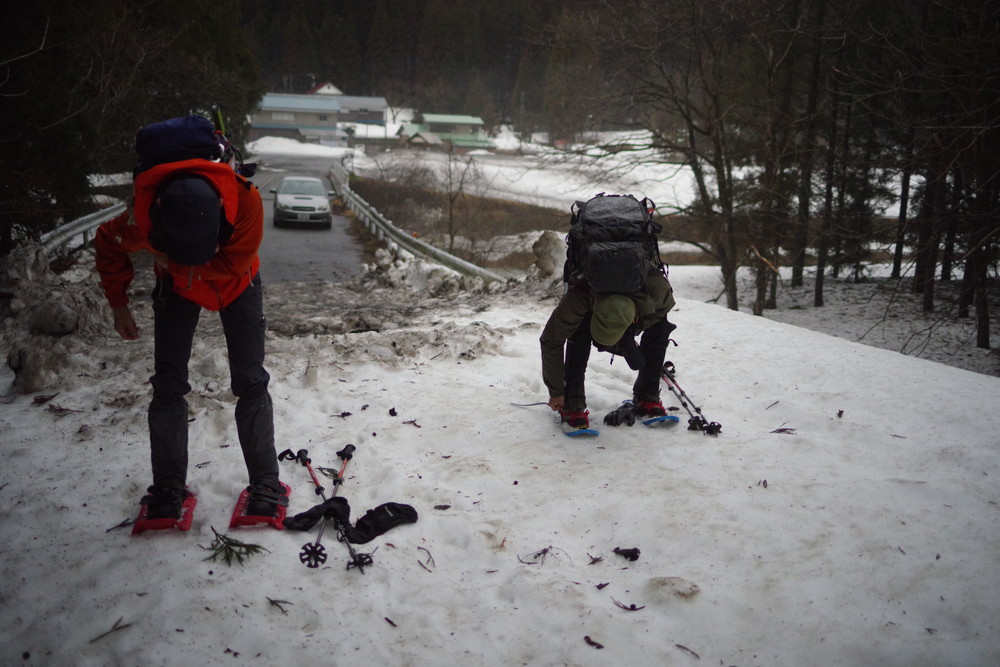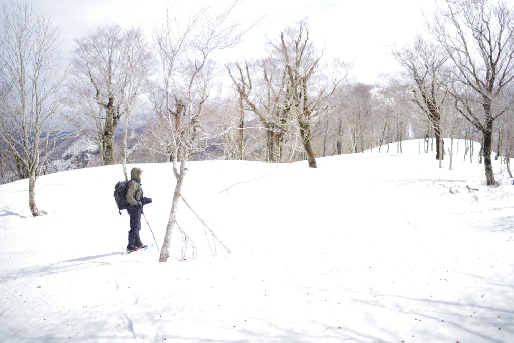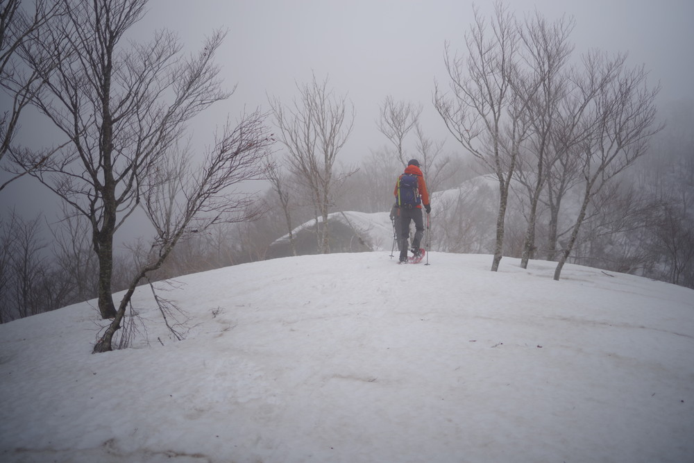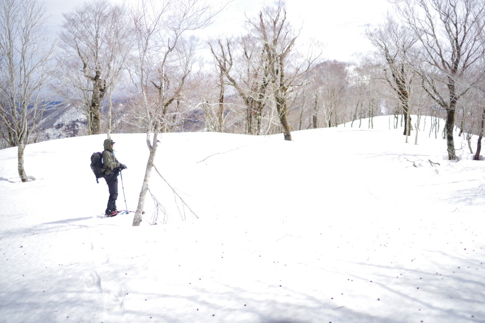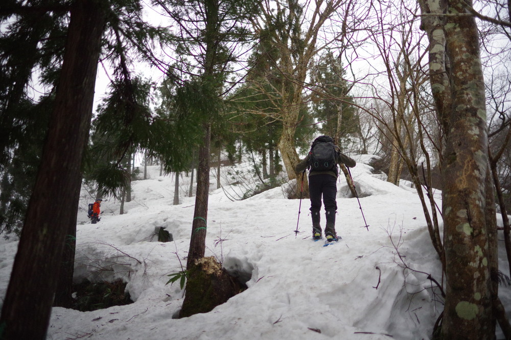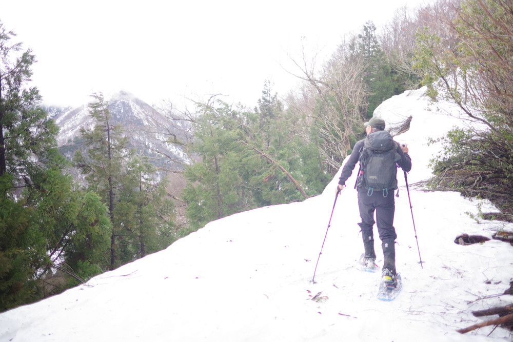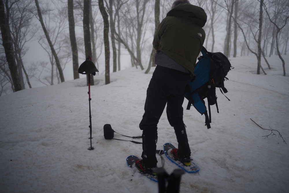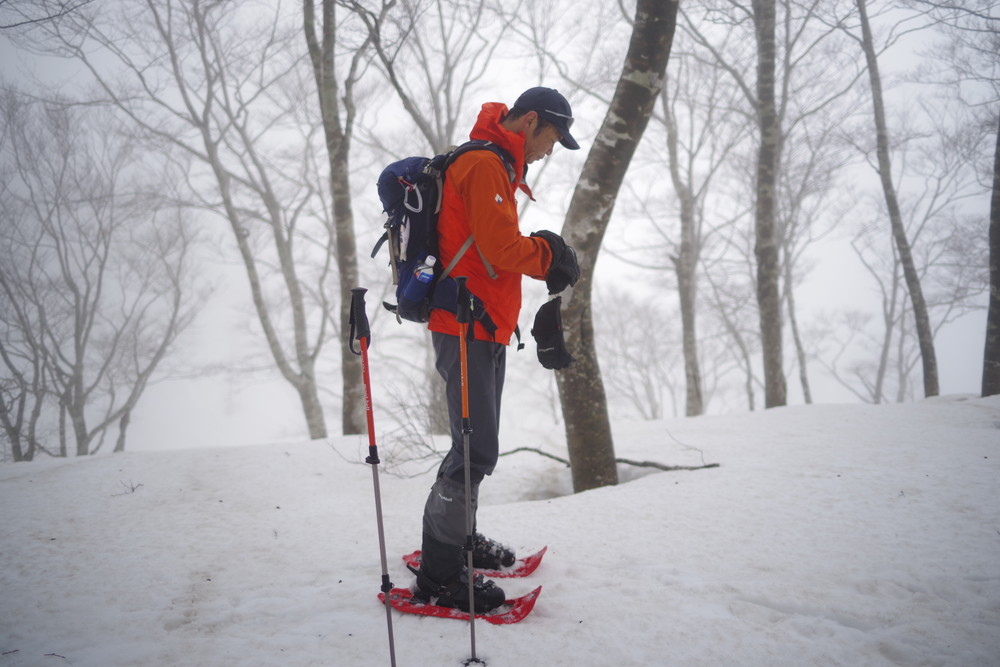 途中雪が切れていて藪の中をスノーシューのまま歩く個所もあったりして前途多難な感じ。