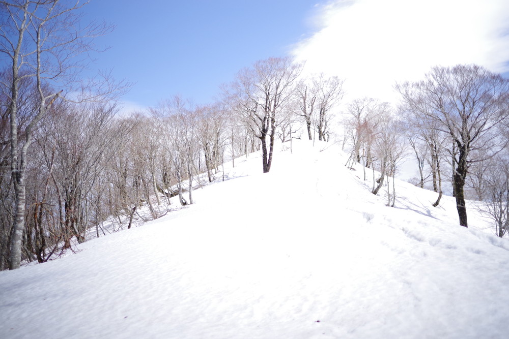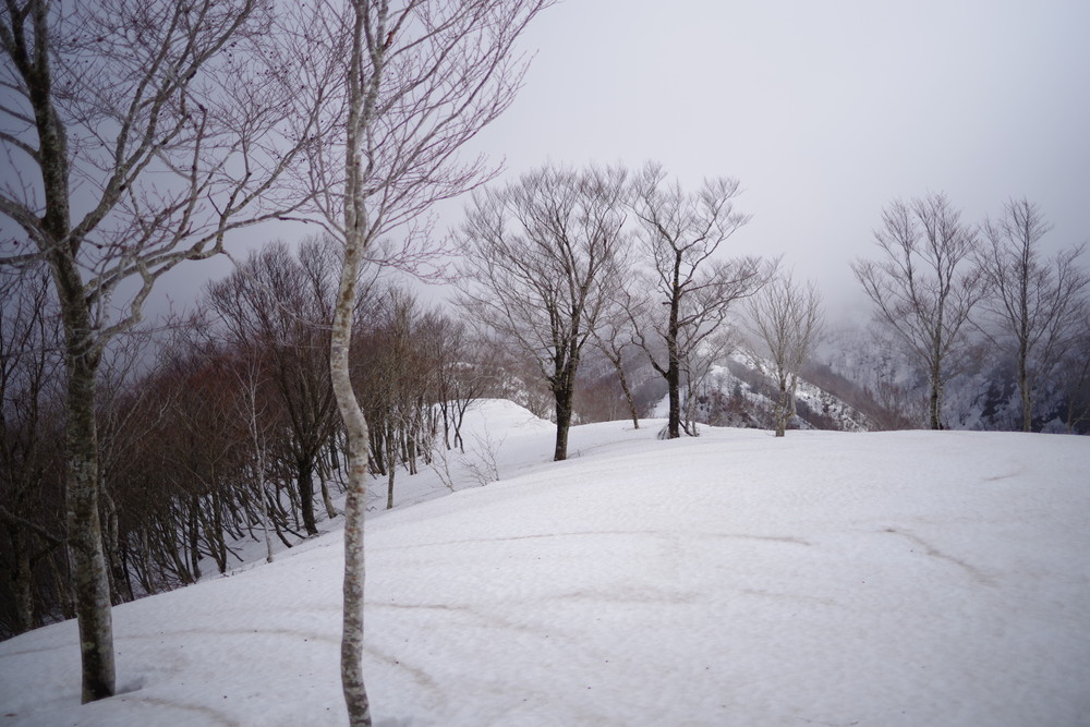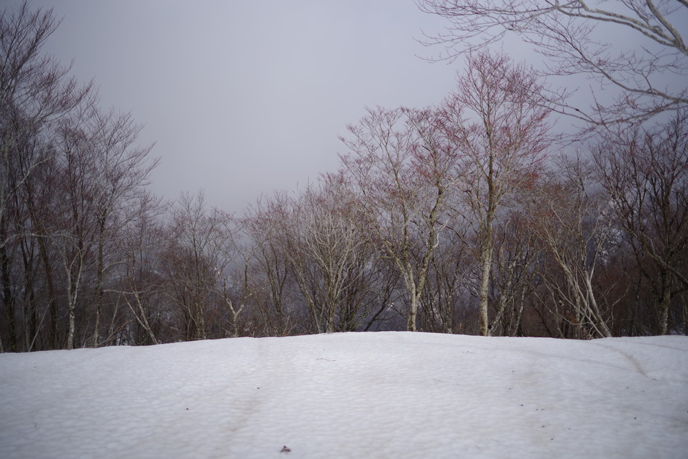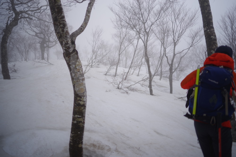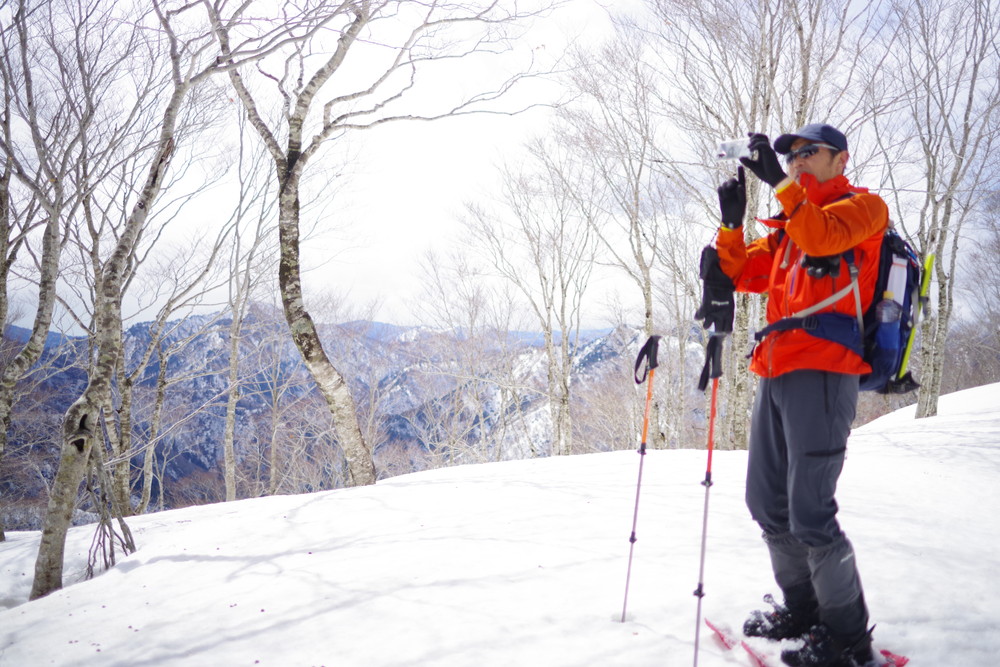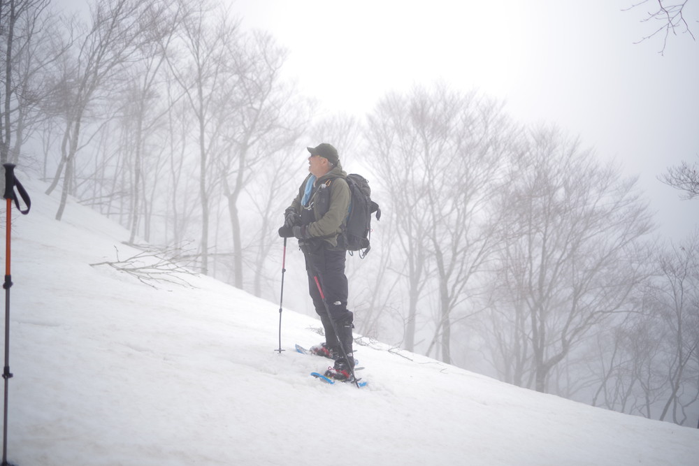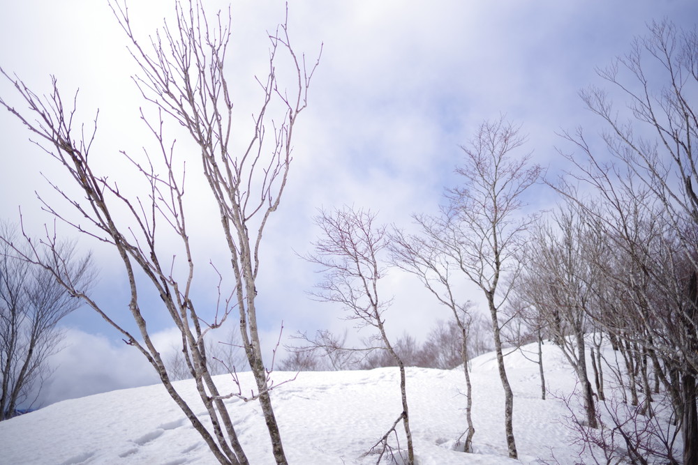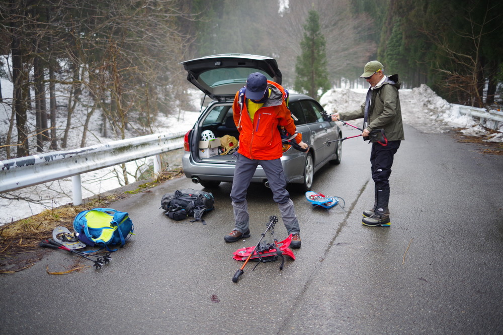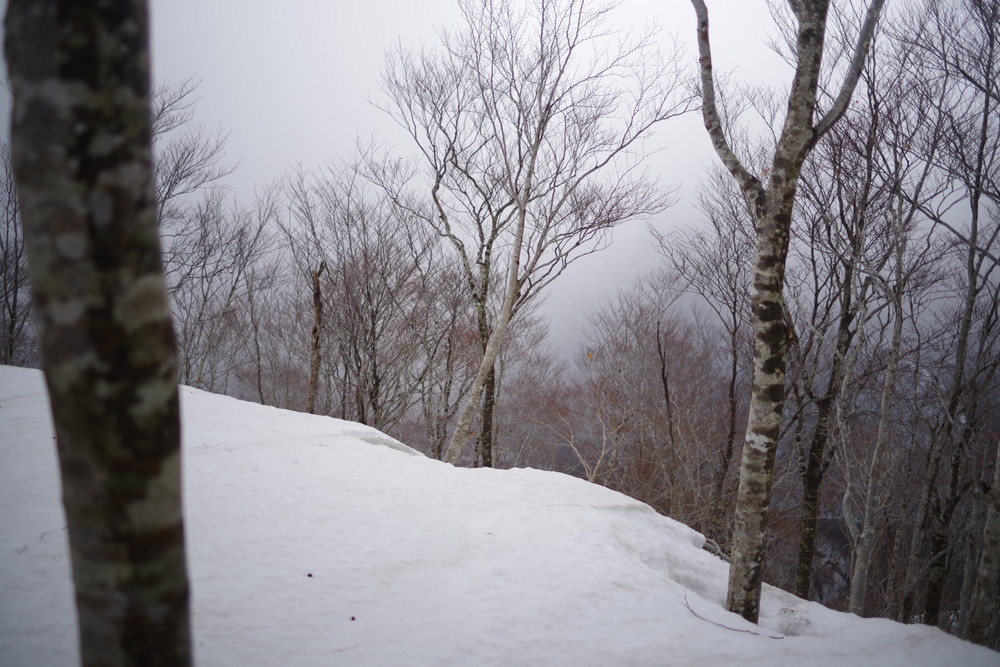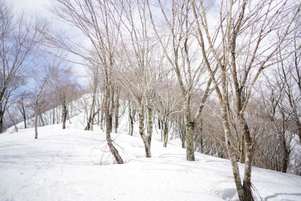 途中雪が切れていて藪の中をスノーシューのまま歩く個所もあったりして前途多難な感じ。