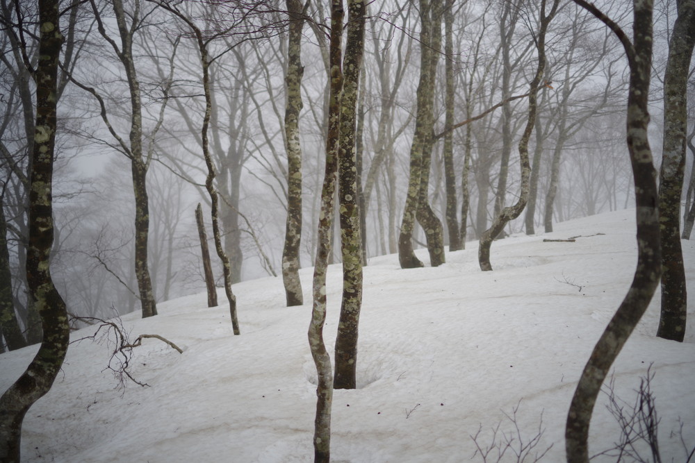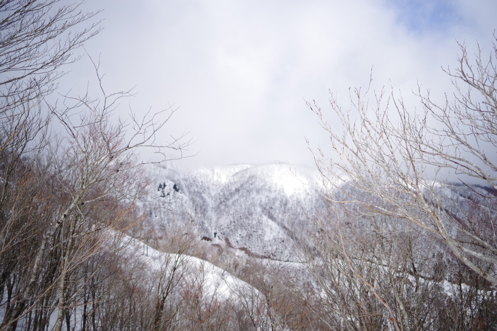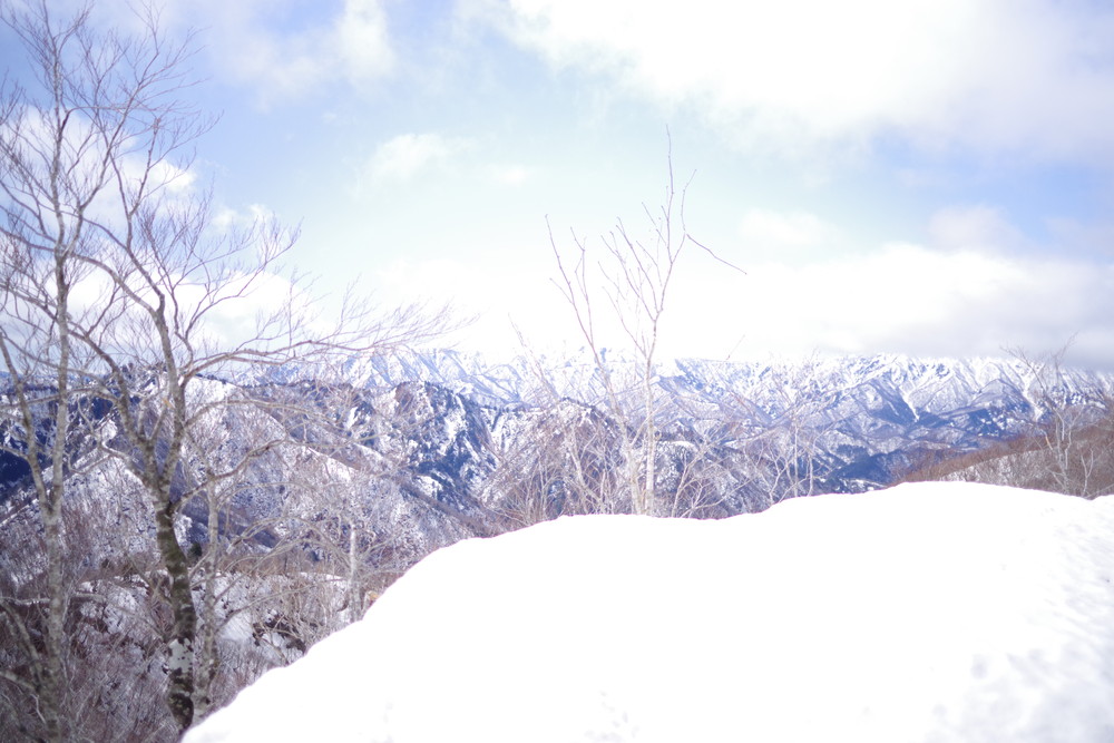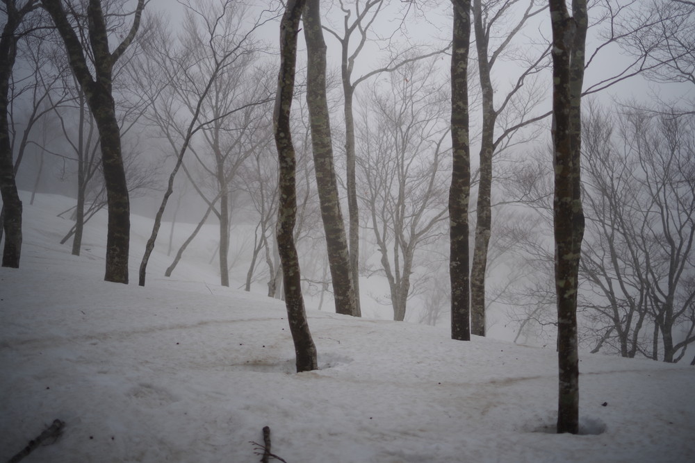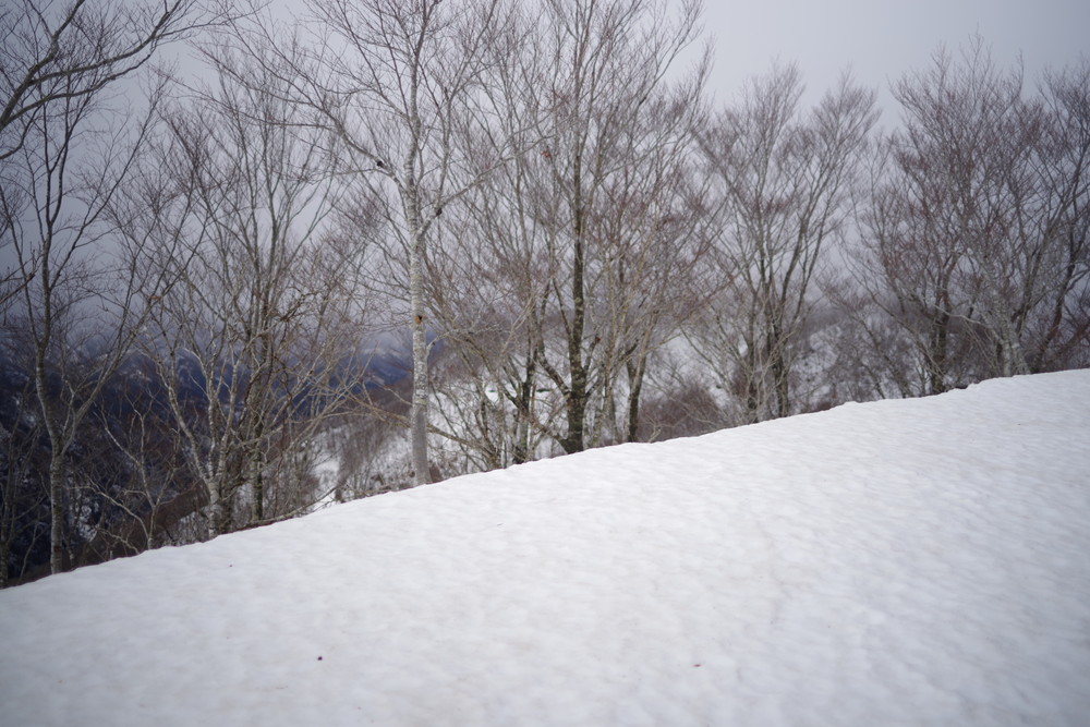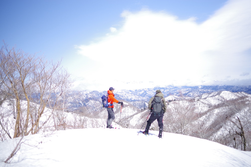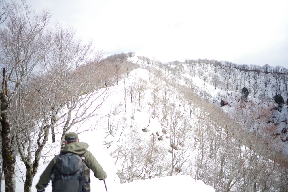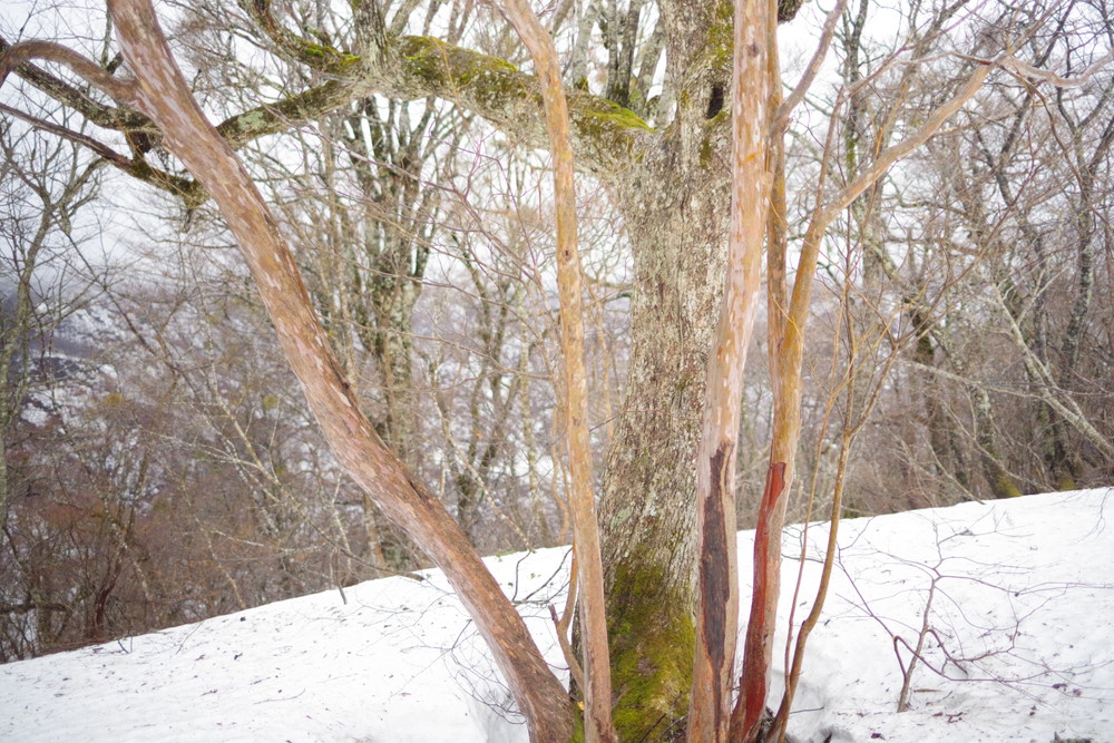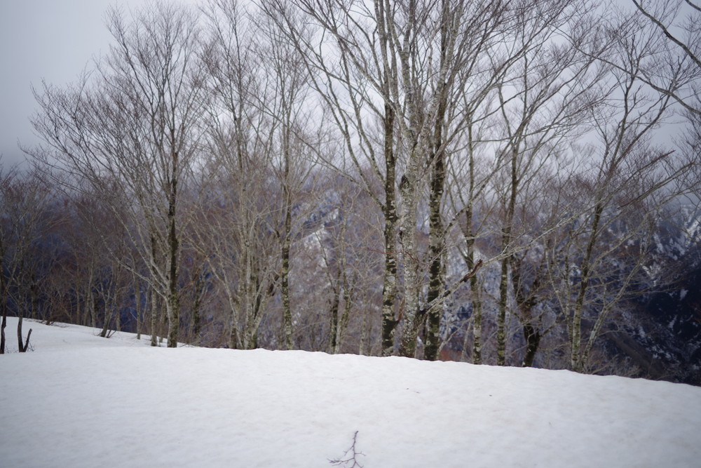 途中雪が切れていて藪の中をスノーシューのまま歩く個所もあったりして前途多難な感じ。
