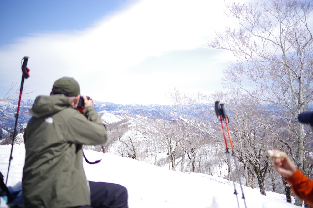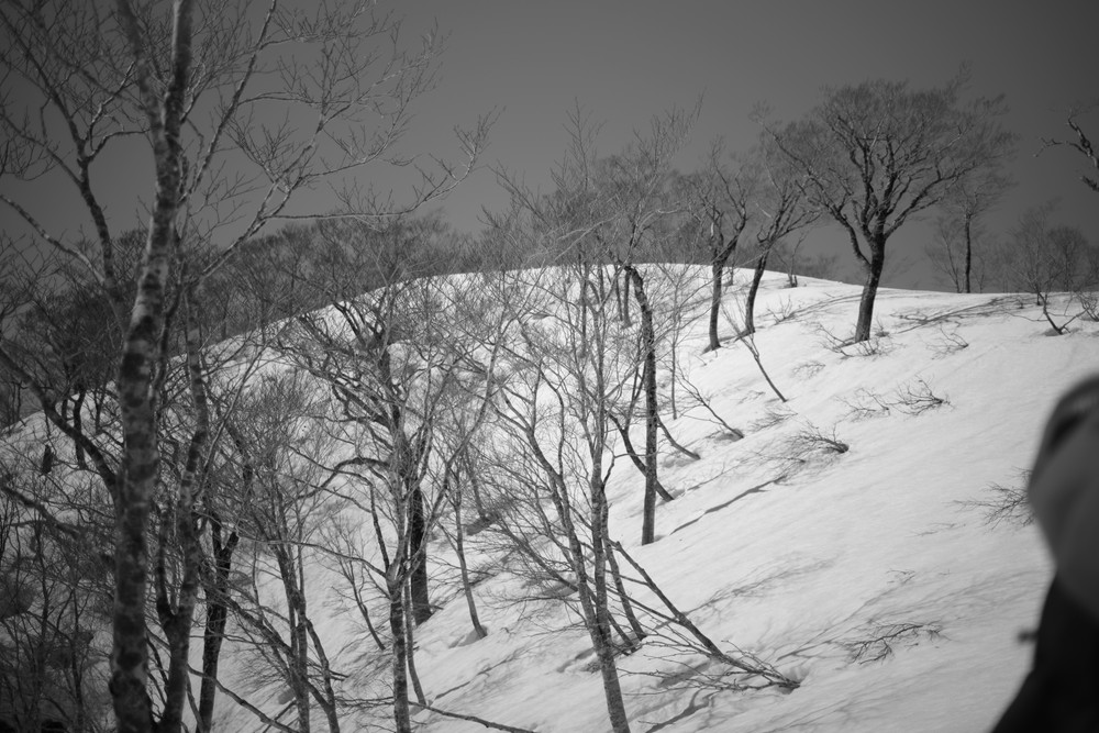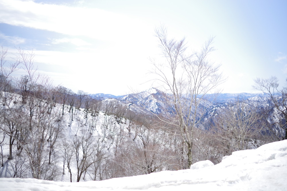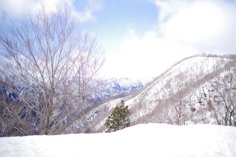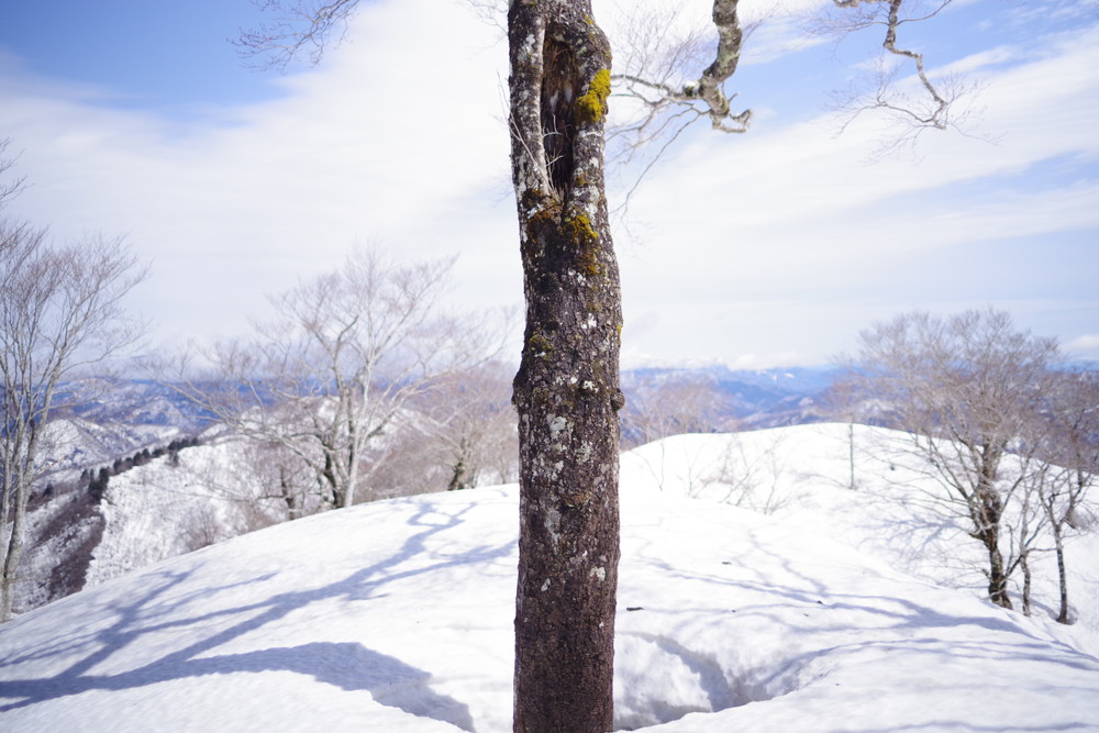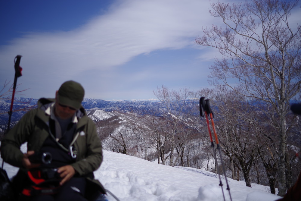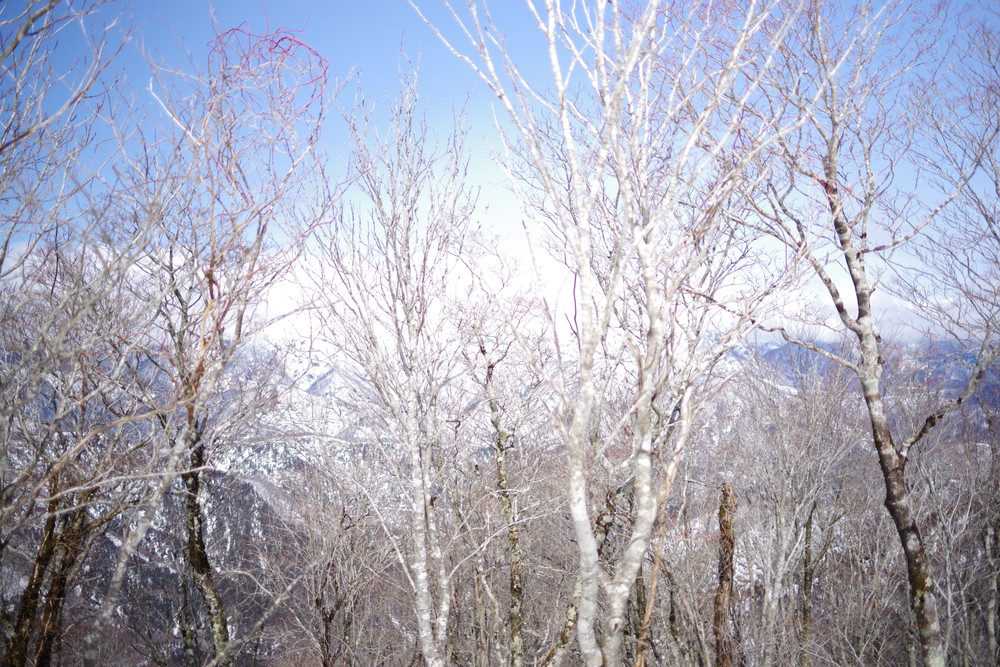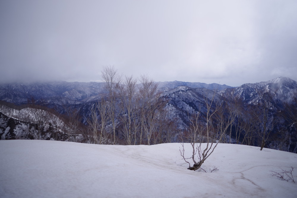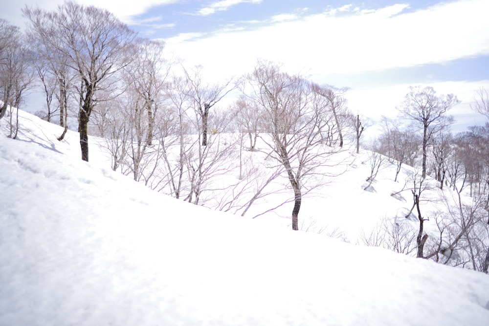 途中雪が切れていて藪の中をスノーシューのまま歩く個所もあったりして前途多難な感じ。