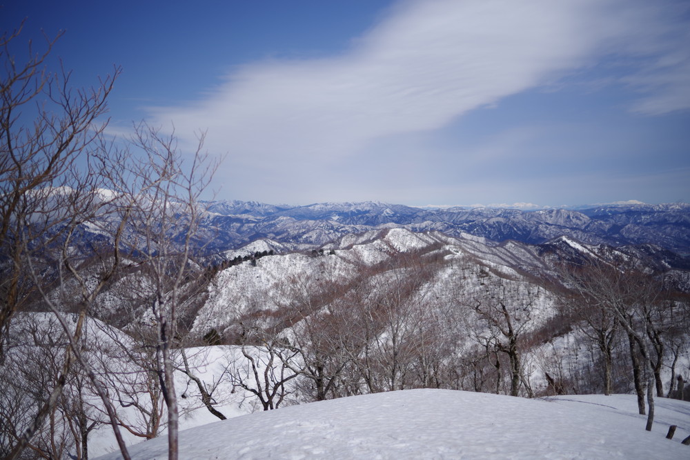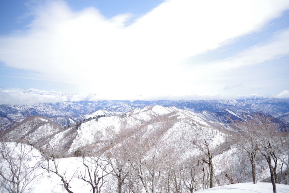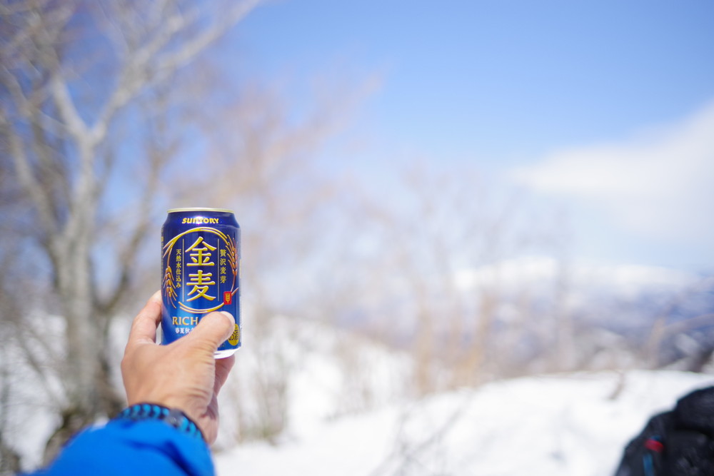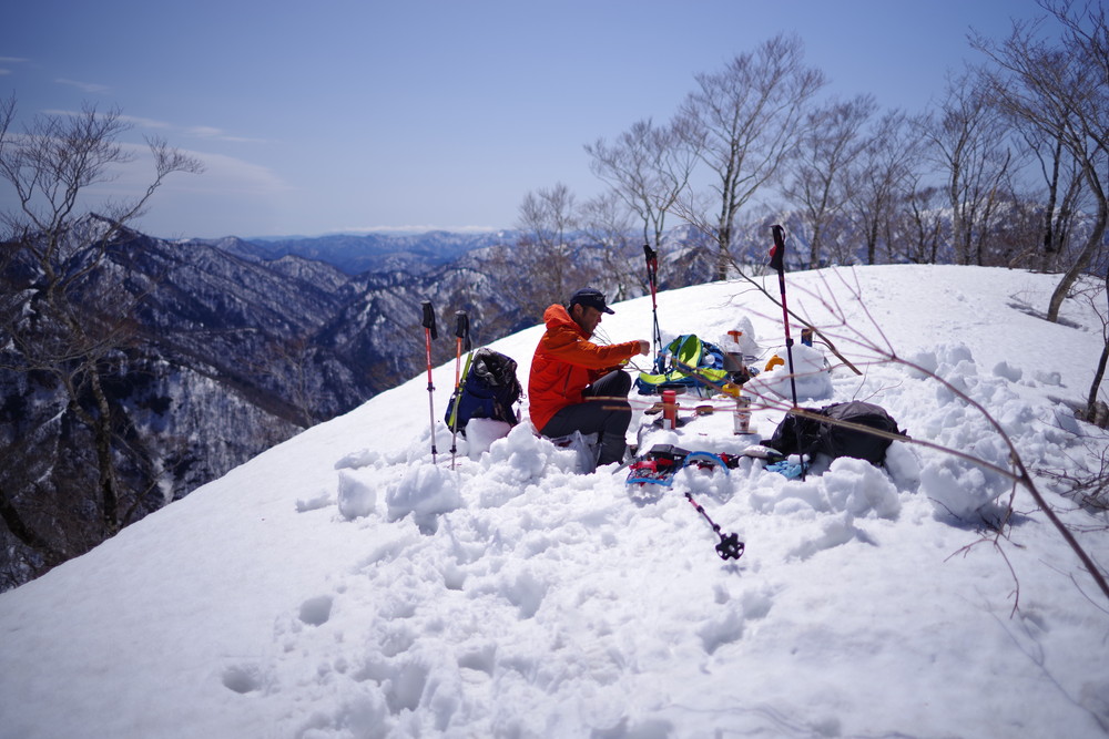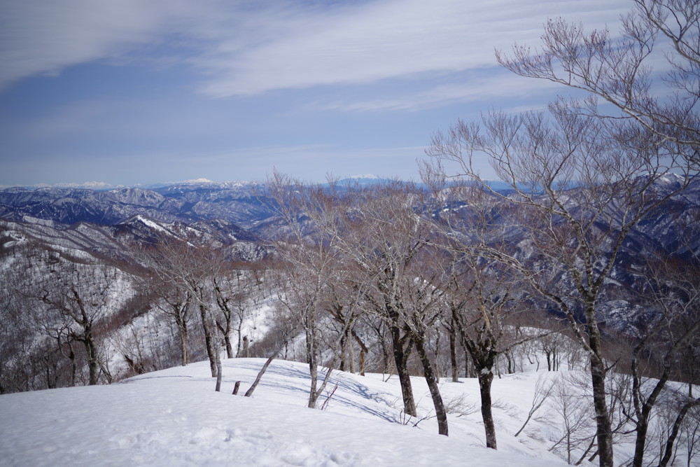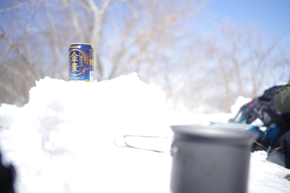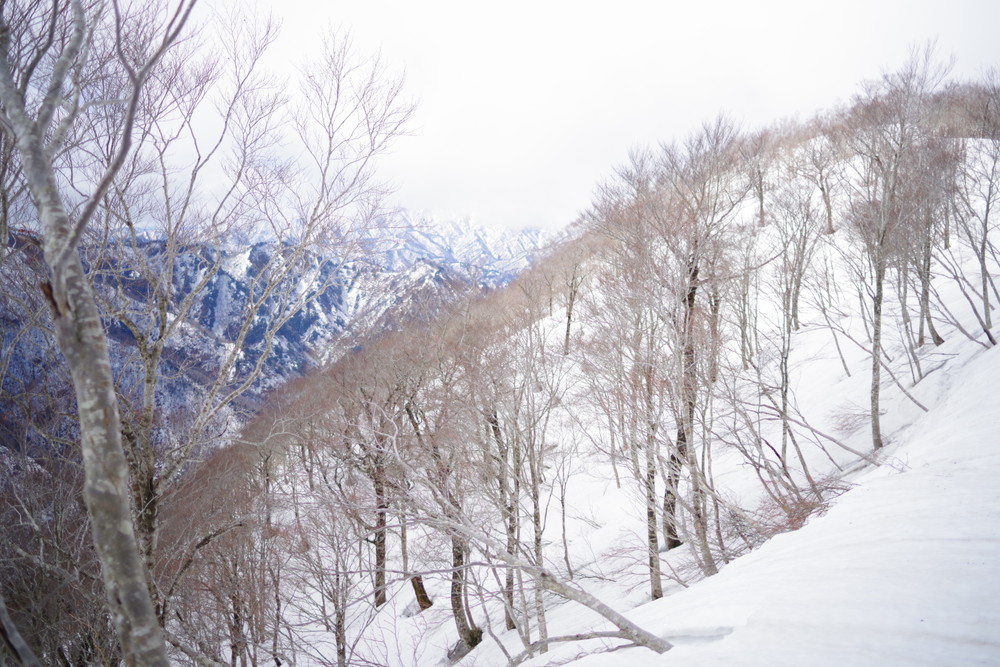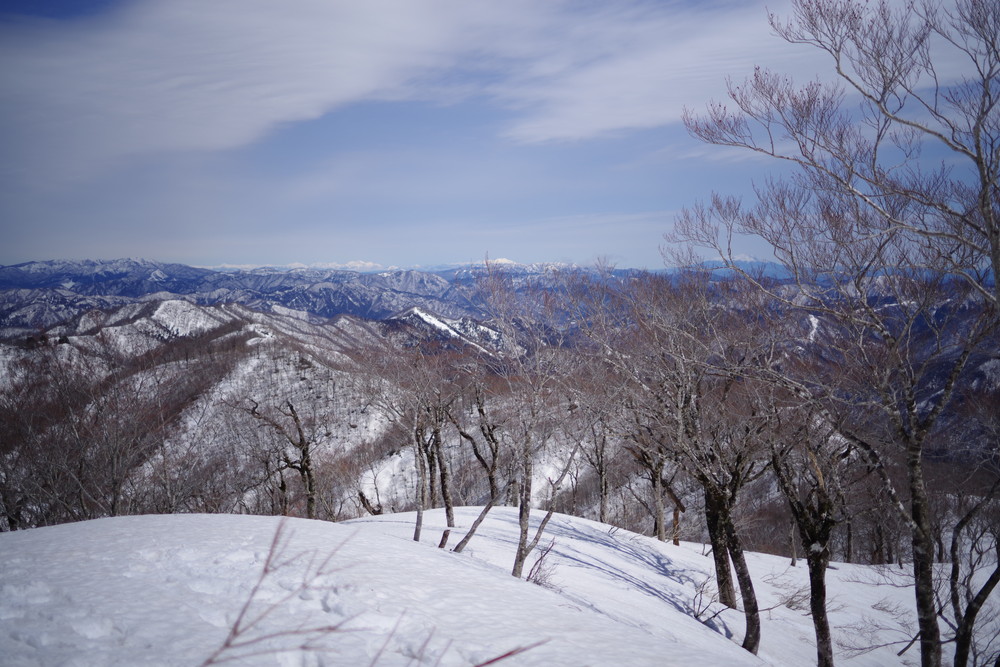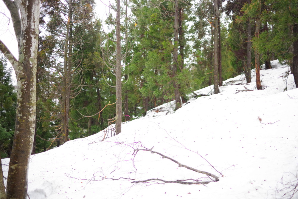 途中雪が切れていて藪の中をスノーシューのまま歩く個所もあったりして前途多難な感じ。