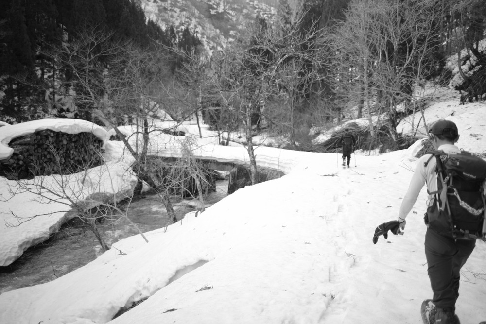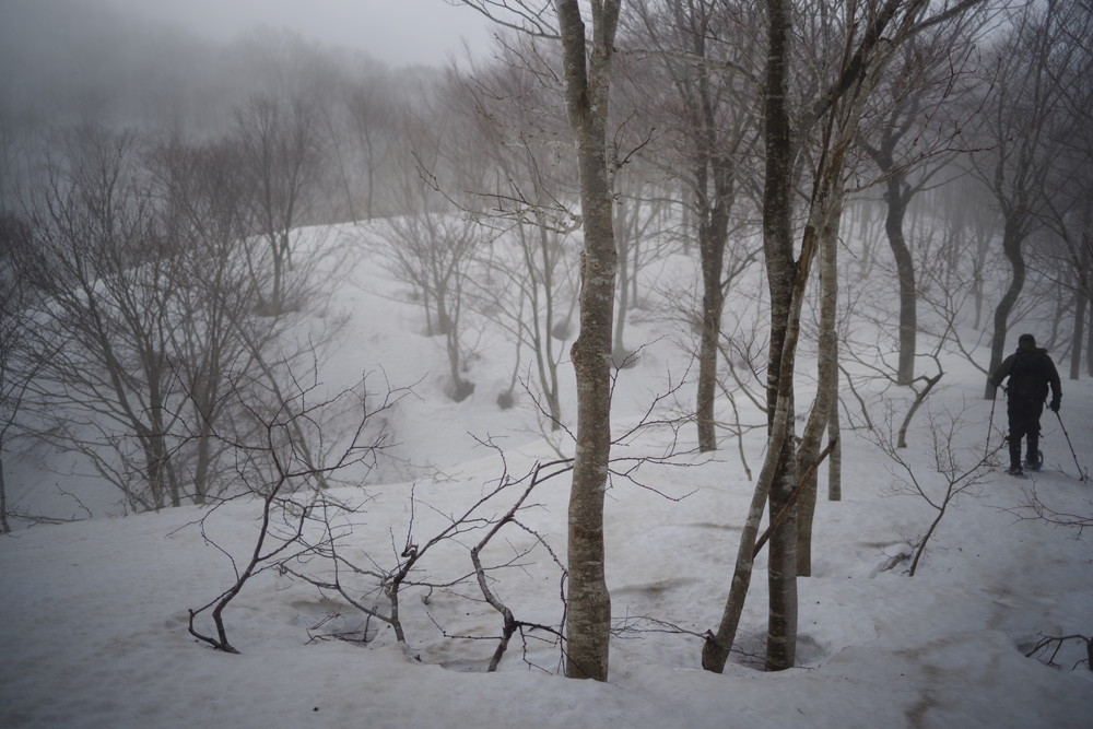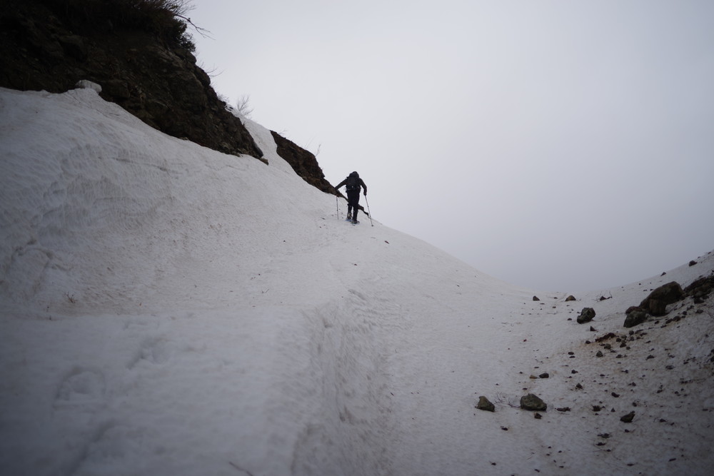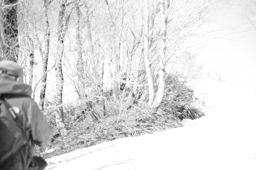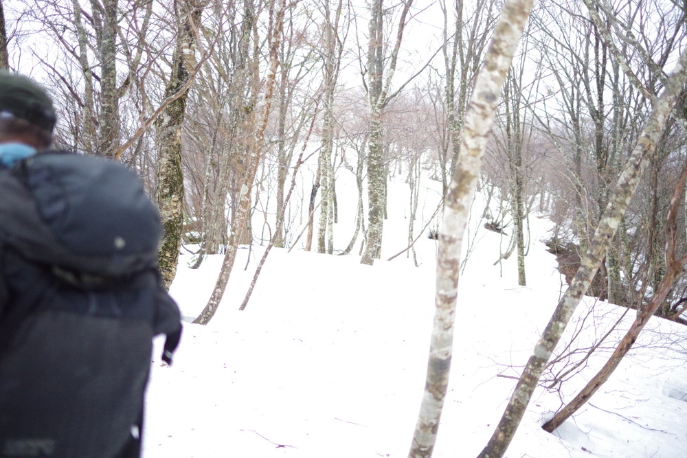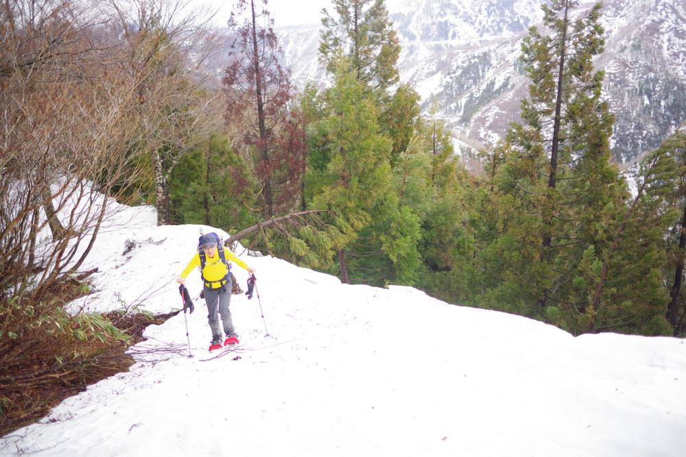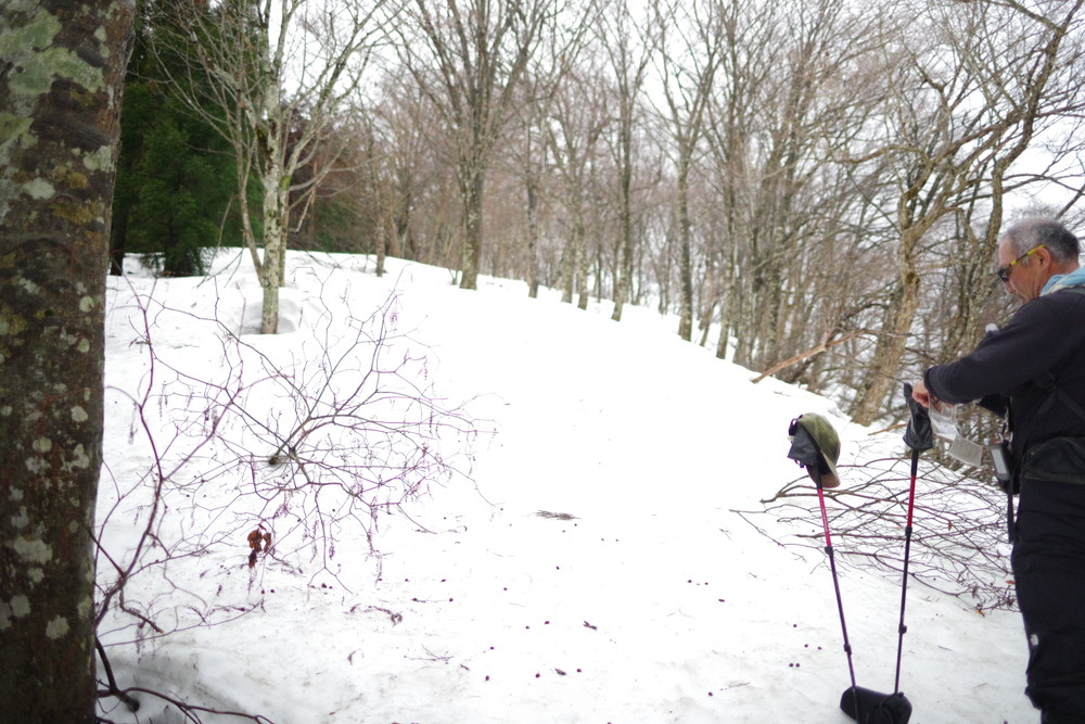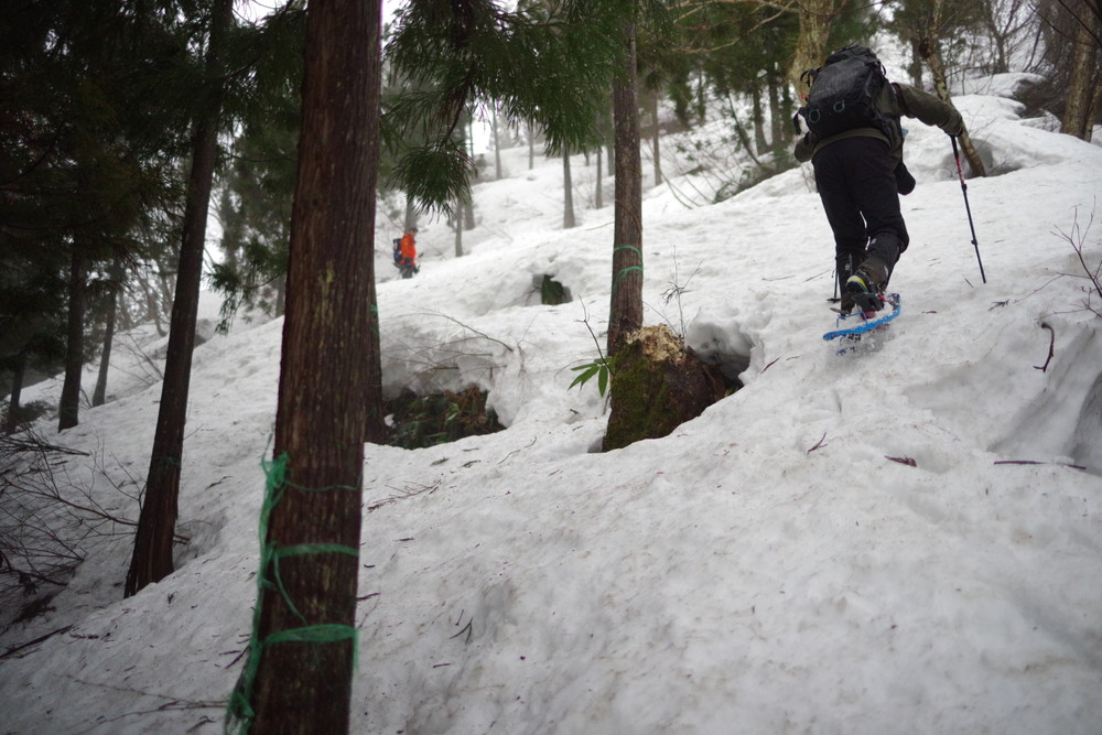 おいおい、結構な崖になってるぞ、スノーシュー一旦脱ぐのか?