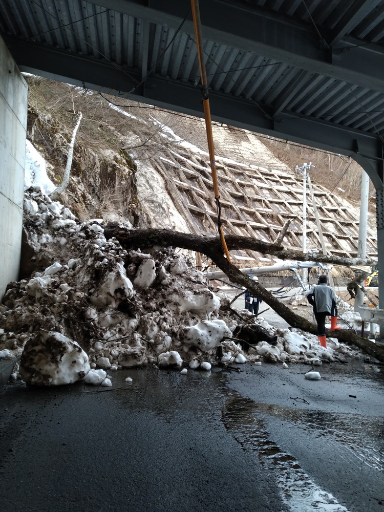 着替えて達成感いっぱいで帰路についたら雪崩れて落ちてきた気が電線を引っ掛けて通行止めに。