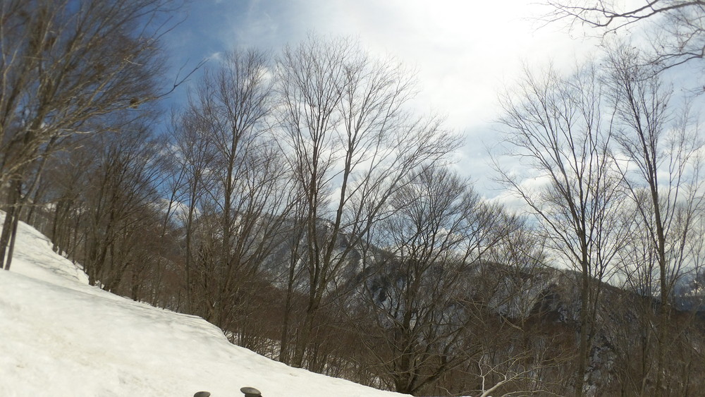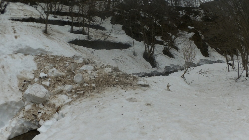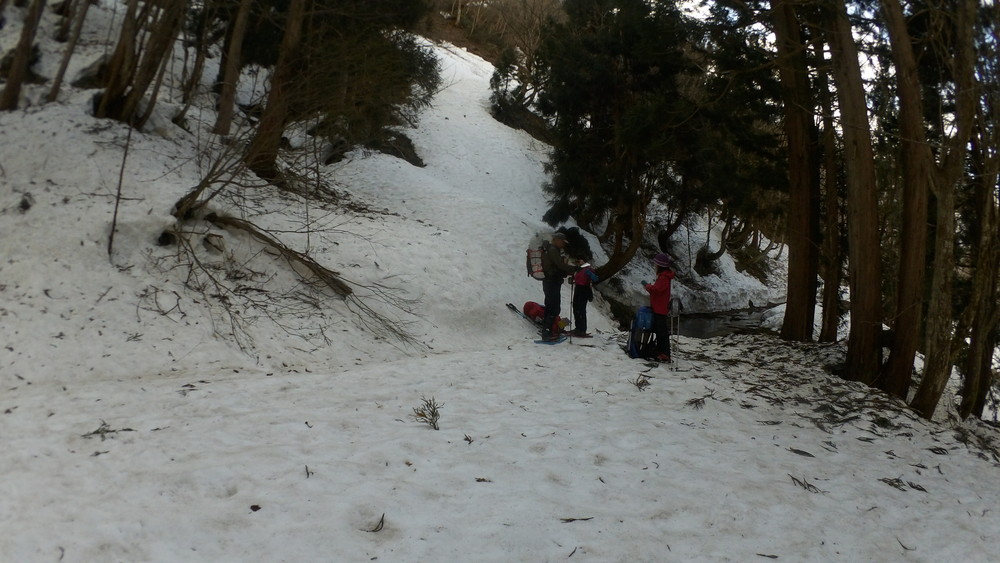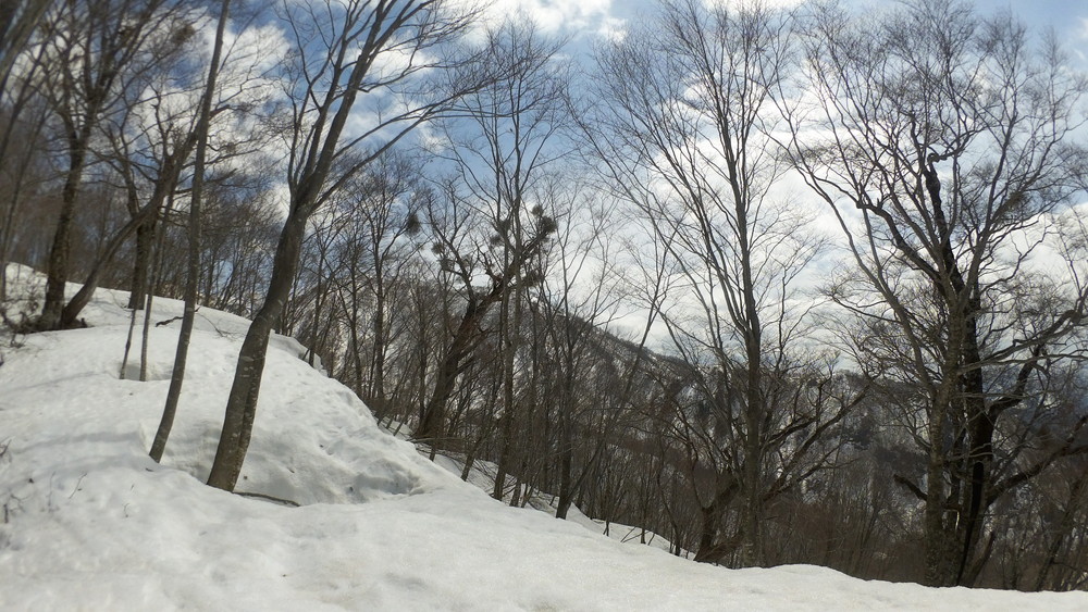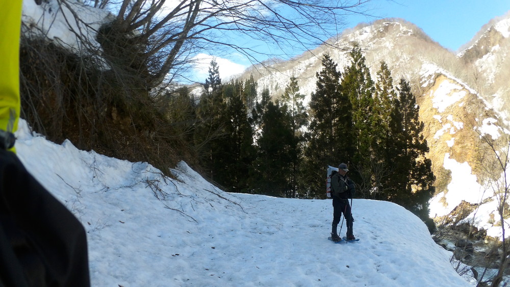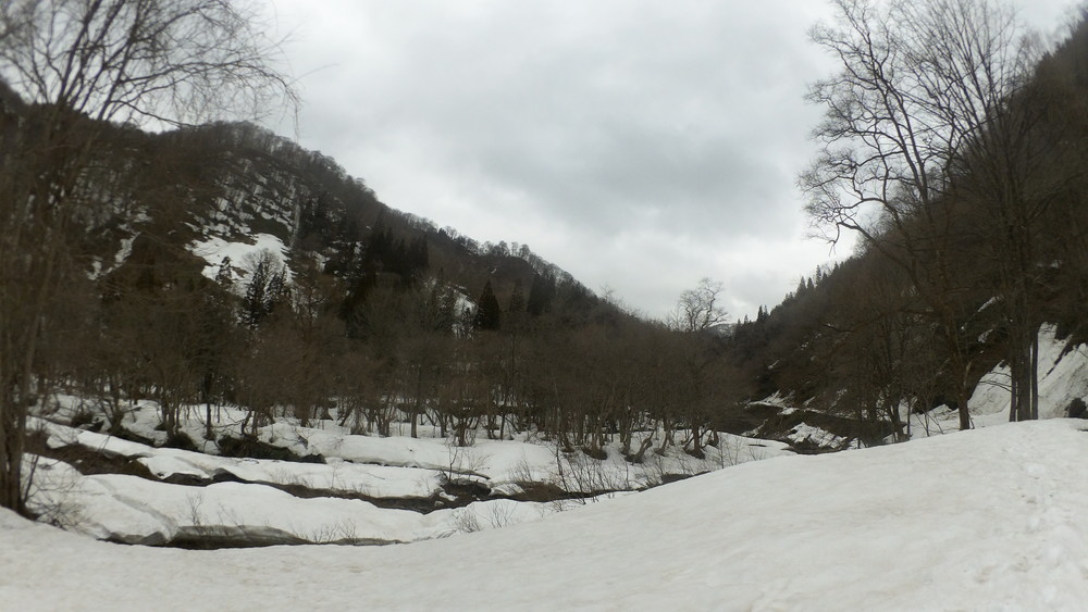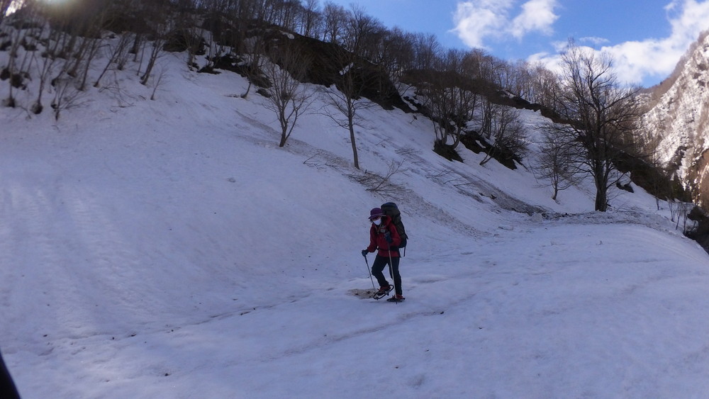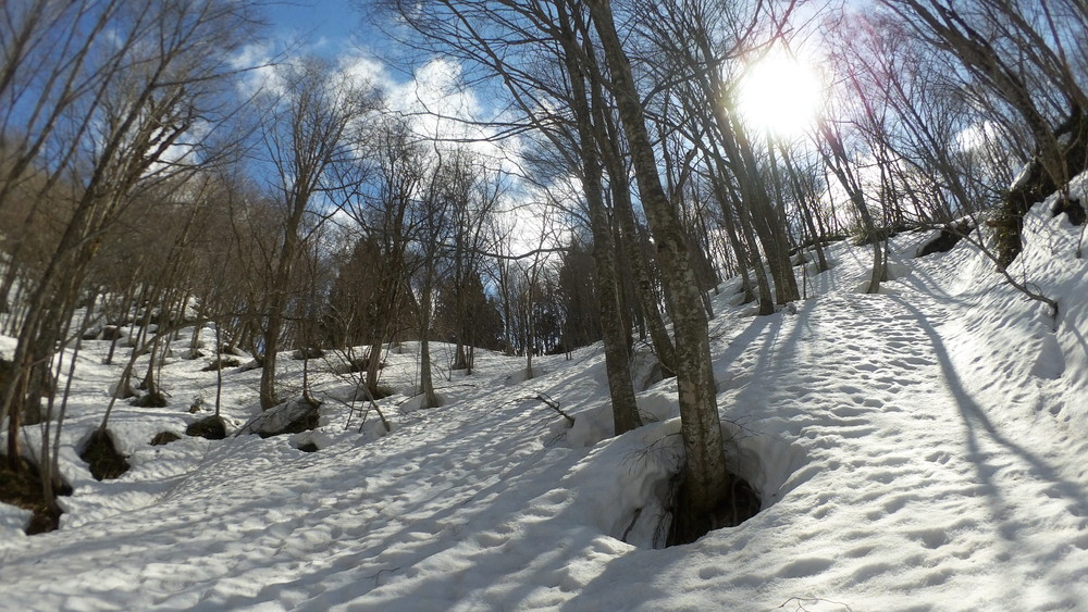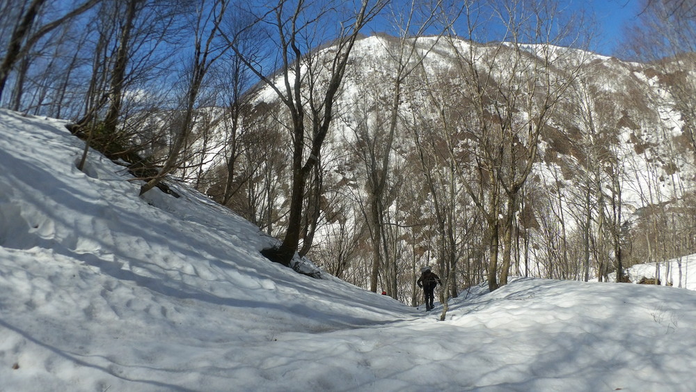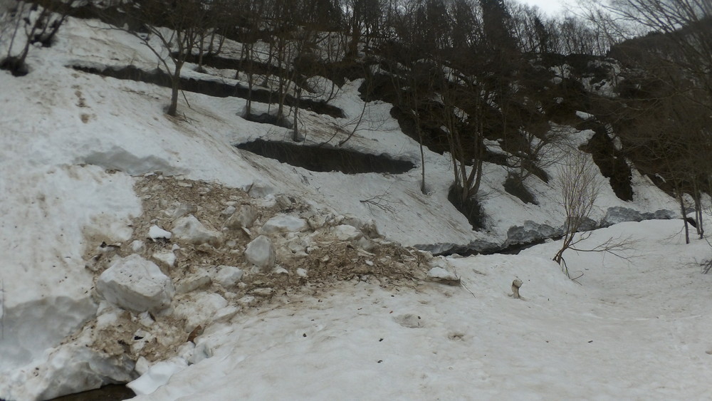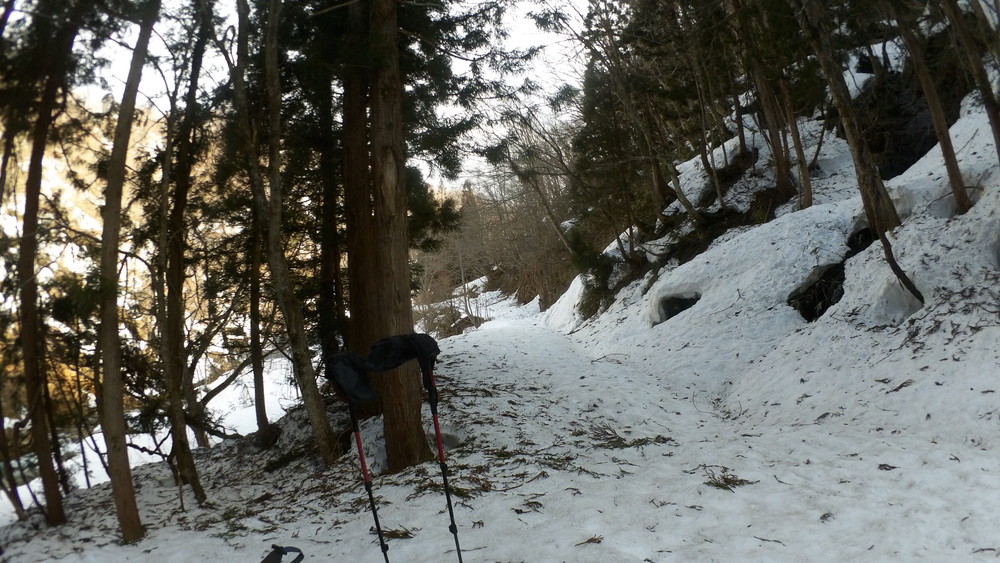 林道は何か所も雪崩ており、2.8km付近ではザラメ雪に加え足を置く幅のない斜面をトラバースするところがあり落ちれば段差8mほどの川にはまりそうな危険個所。かなり緊張しました。復路ではアイゼンにした方がよさそうだな。