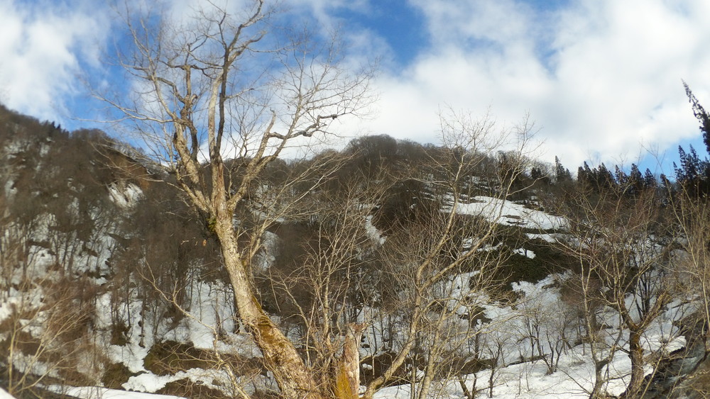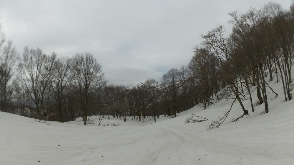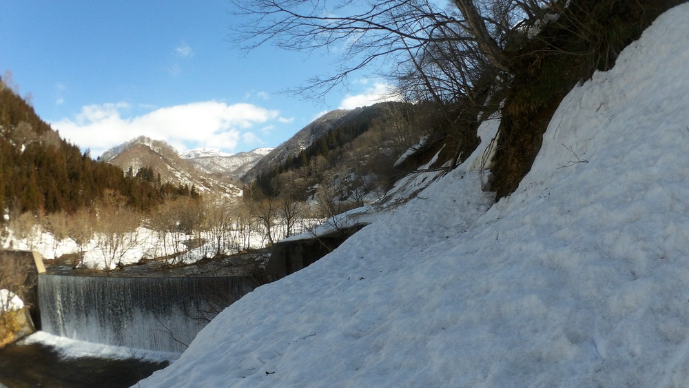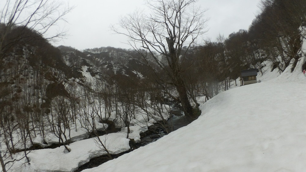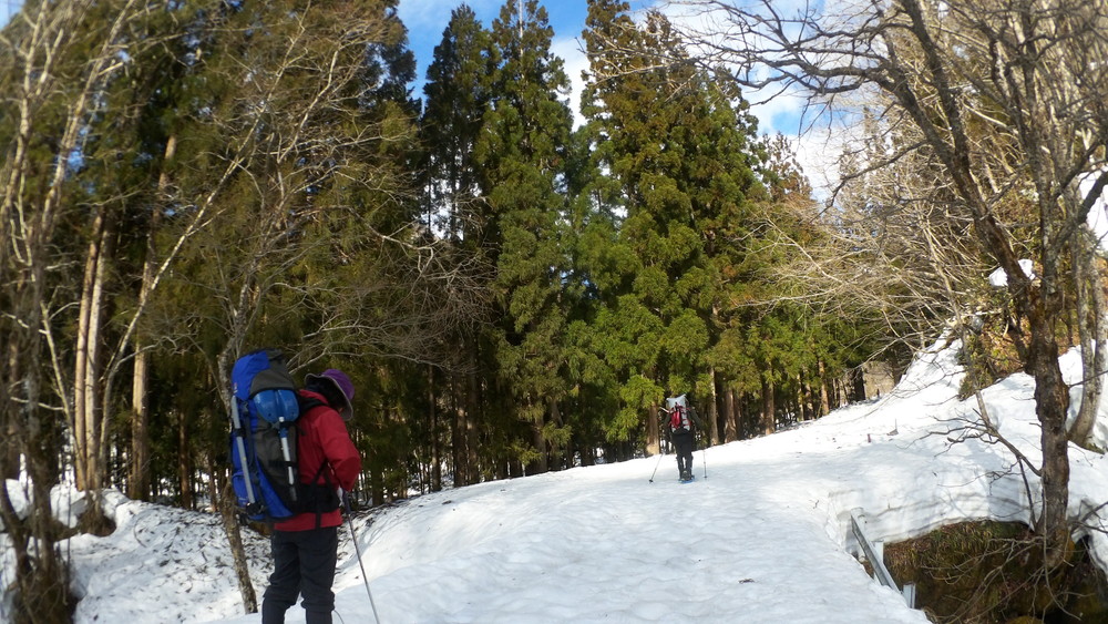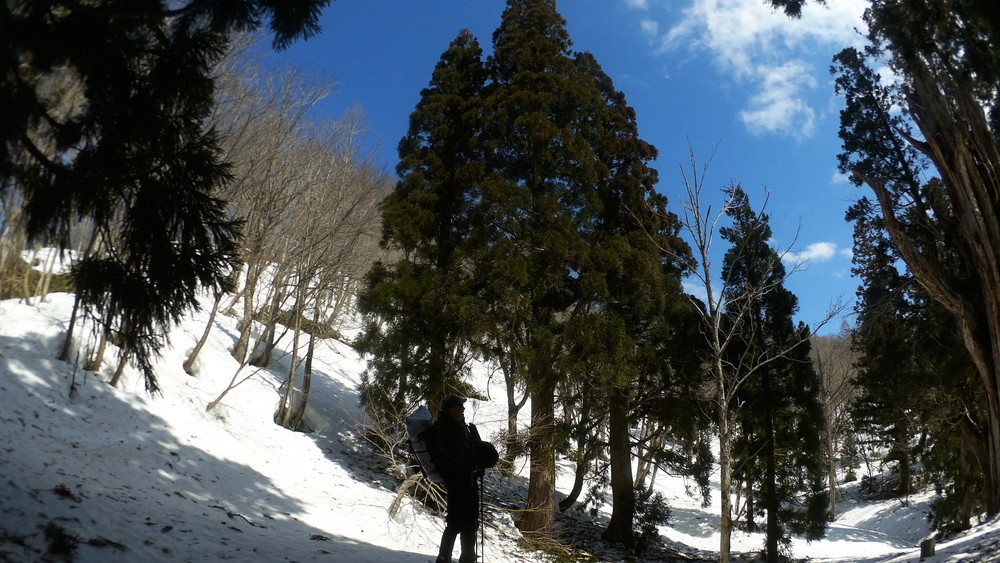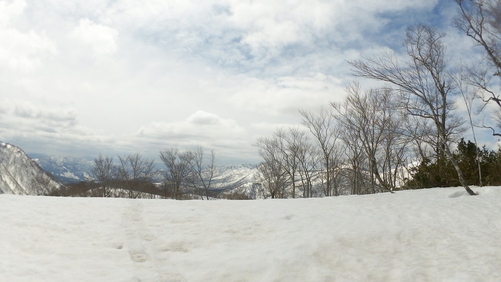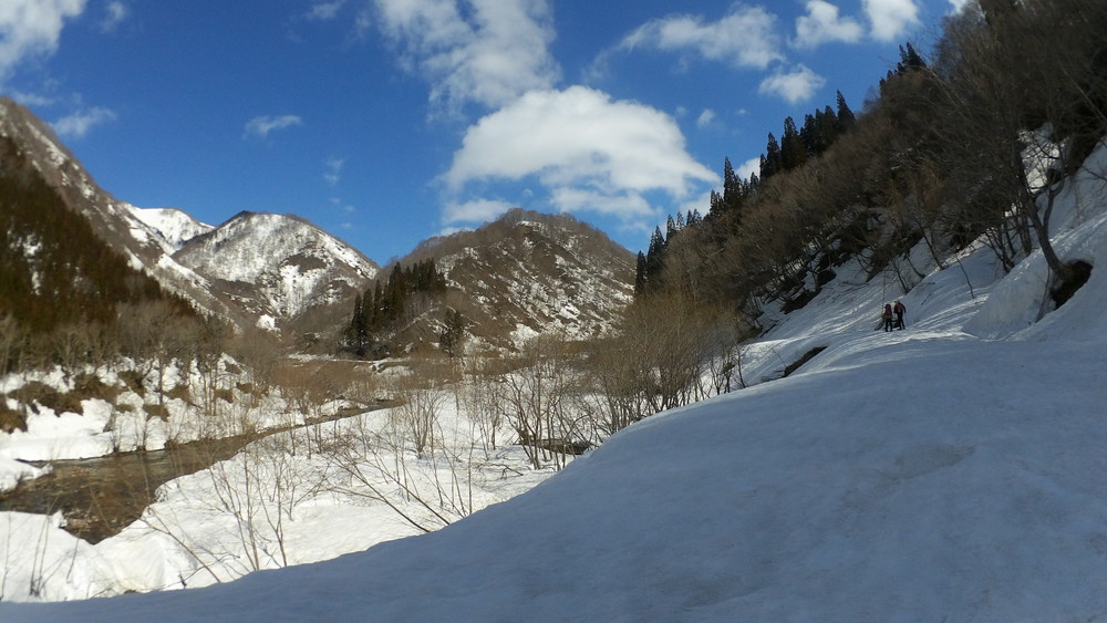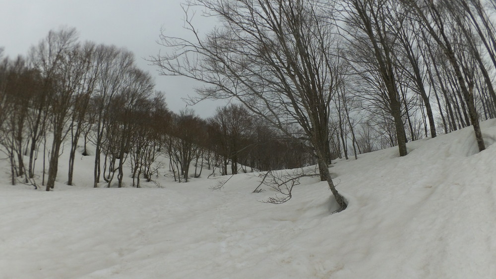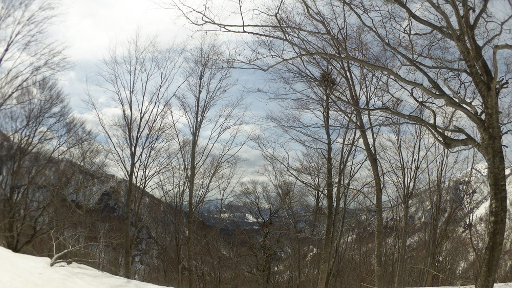 林道は何か所も雪崩ており、2.8km付近ではザラメ雪に加え足を置く幅のない斜面をトラバースするところがあり落ちれば段差8mほどの川にはまりそうな危険個所。かなり緊張しました。復路ではアイゼンにした方がよさそうだな。