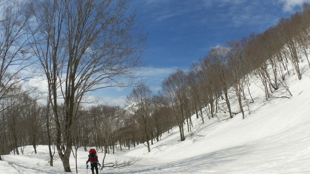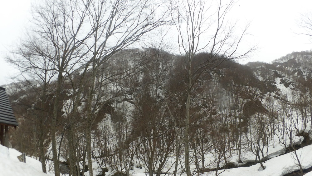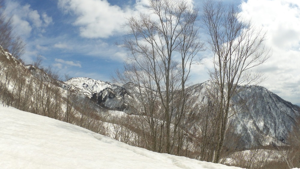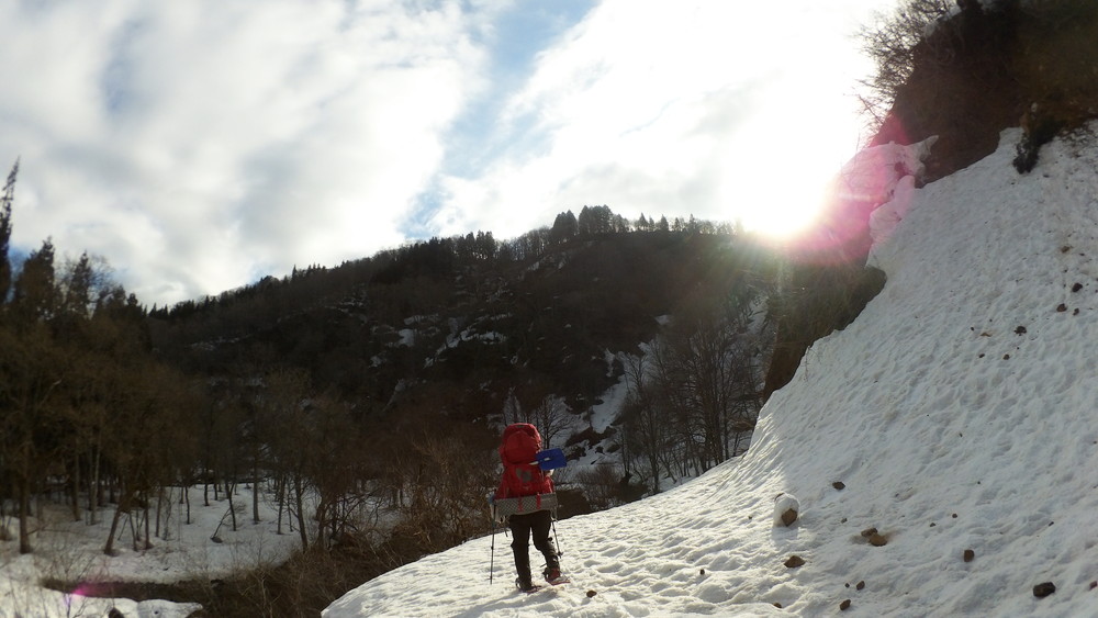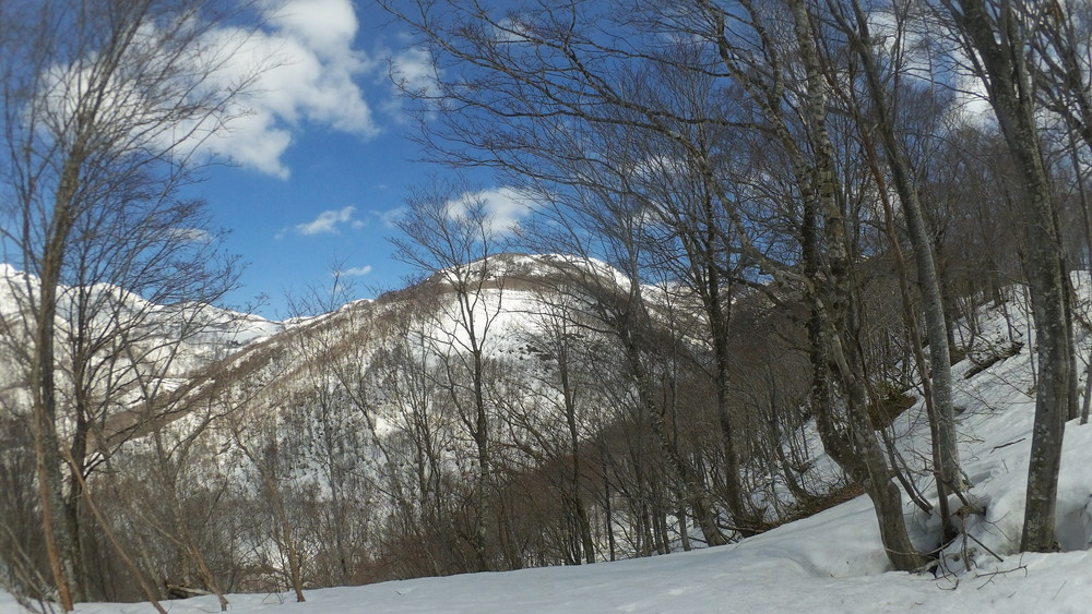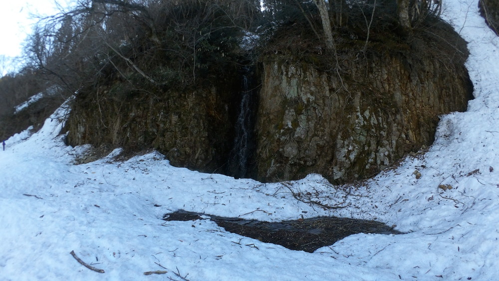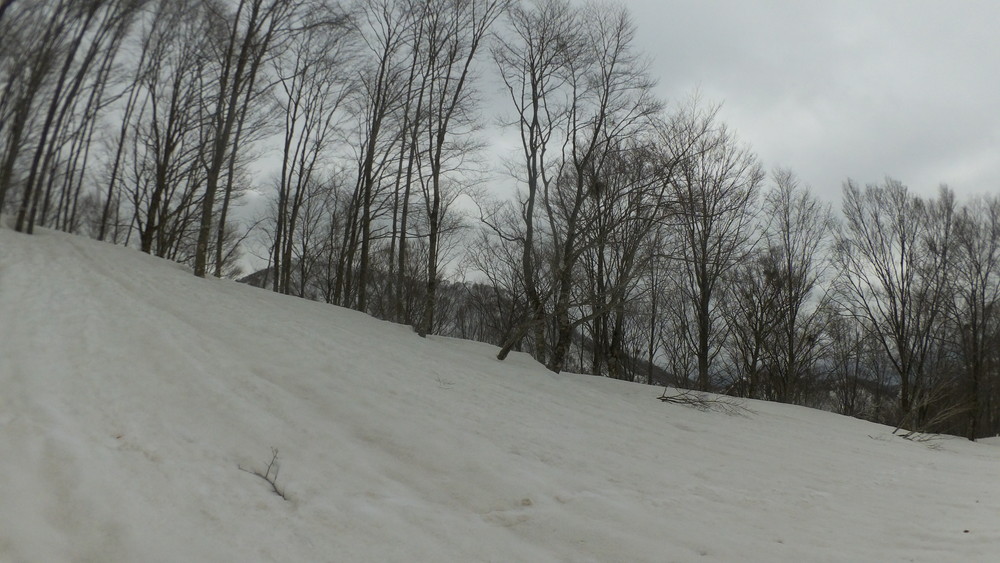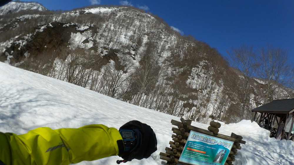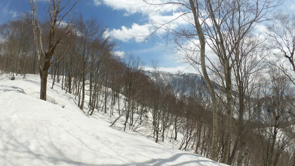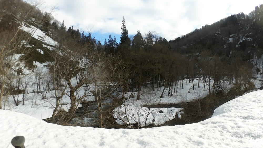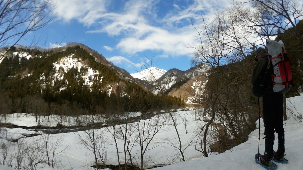 林道は何か所も雪崩ており、2.8km付近ではザラメ雪に加え足を置く幅のない斜面をトラバースするところがあり落ちれば段差8mほどの川にはまりそうな危険個所。かなり緊張しました。復路ではアイゼンにした方がよさそうだな。