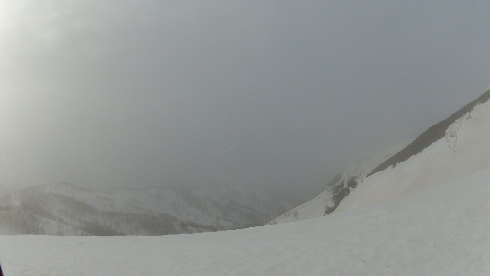 例の危険なトラバース地点。3歩目くらいで足を滑らせました。右手を雪の割れ目に突っ込んでぶら下がれたので良かったですが、