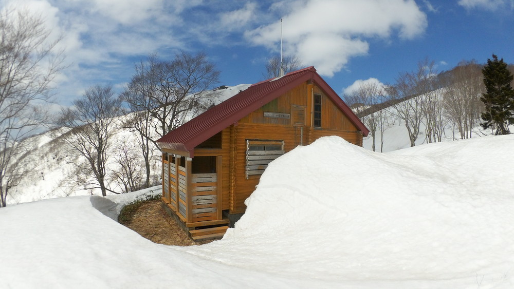小屋の前の雪よけを外して小屋の中を確認。きれいで広く、テーブルまである立派な小屋でした。