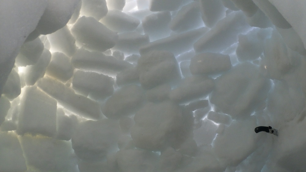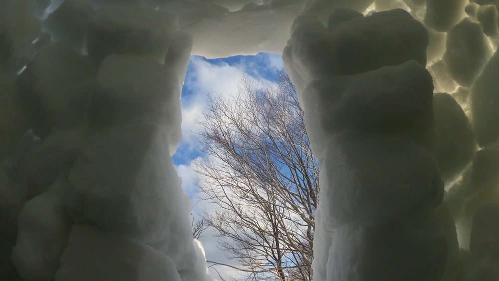 製作の過程を5秒間隔のインターバル撮影していたのですが雪のブロックの上のカメラが途中で落っこちてて埋もれた雪の中の様子を延々と撮影してました。