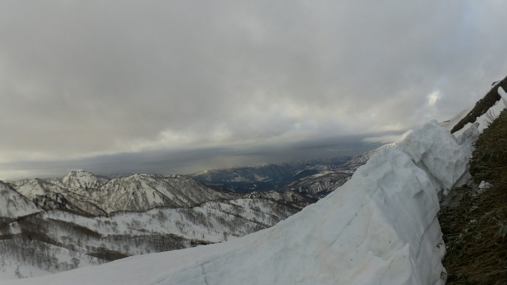 サクサクと歩いて1,620m地点で母御岩の方面を見るとゴツイ雪割れがたくさん。