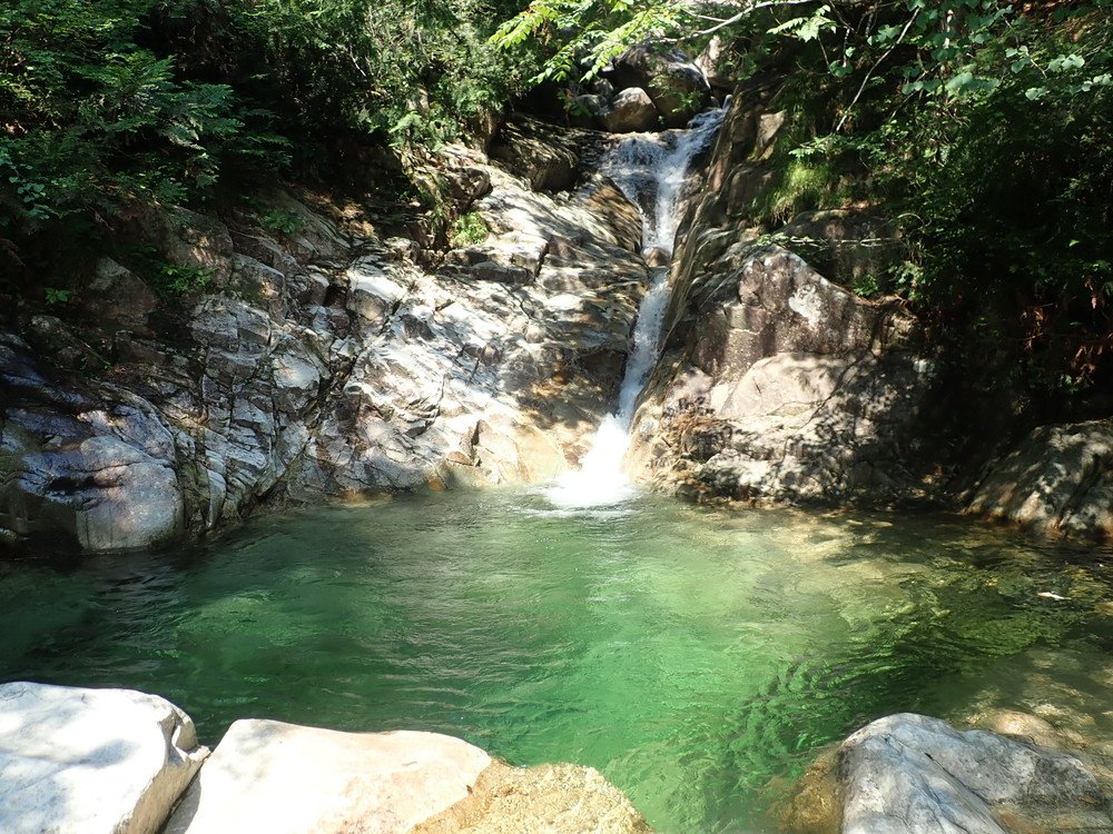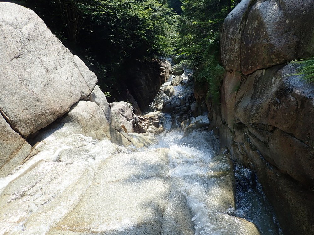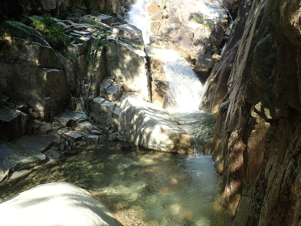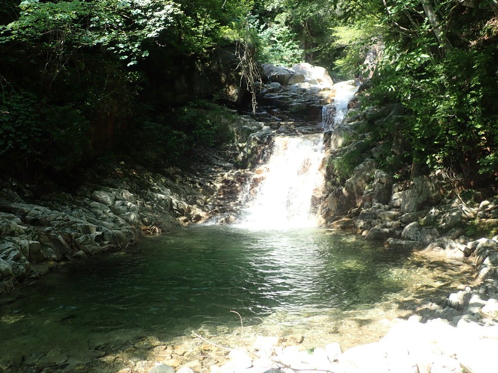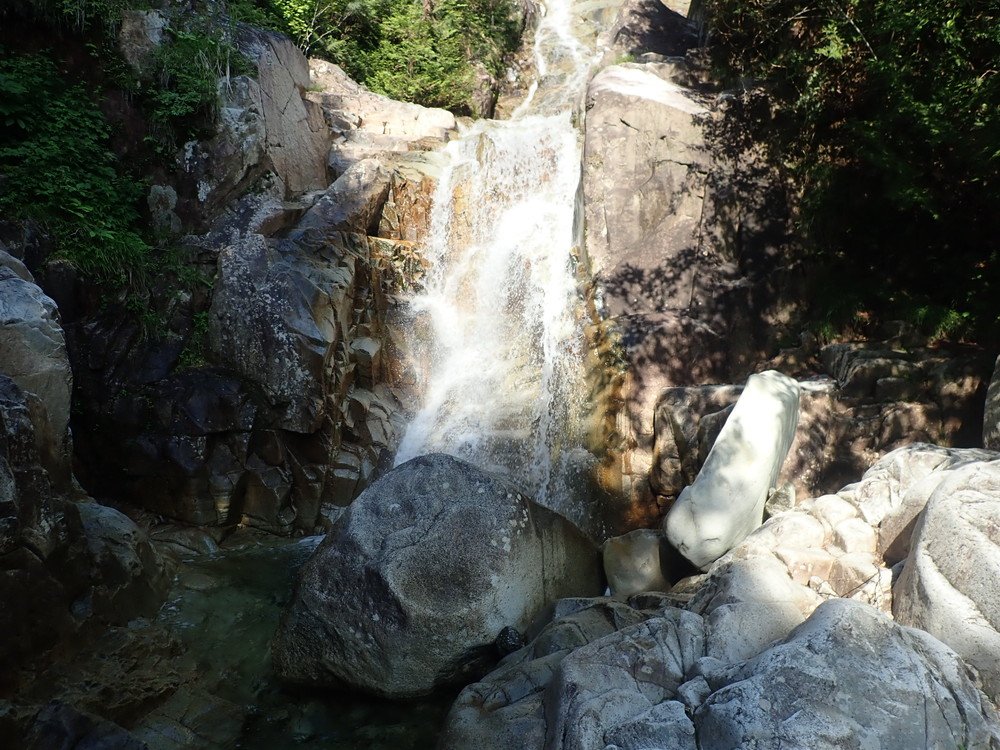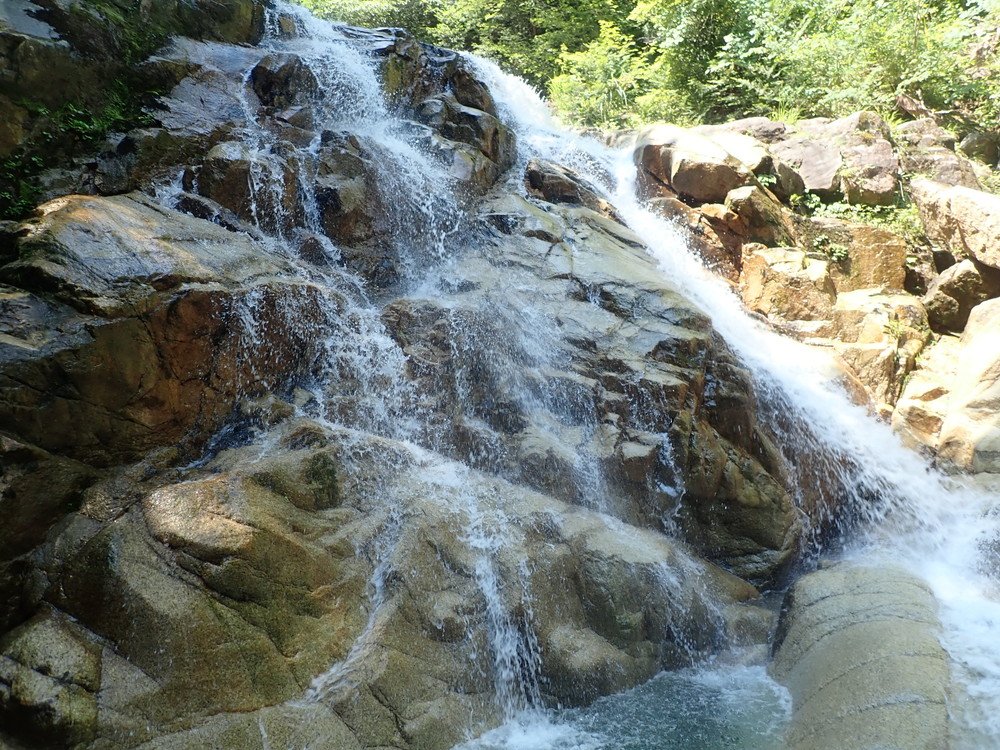 滝つぼのある滝ではなく角の取れた大きな岩の上にチョボチョボ流れ落ちるくらいの水量でしたがザック側から落ちてコテンと反転うつぶせになった形ですので