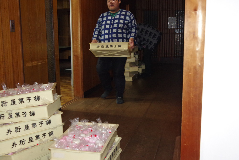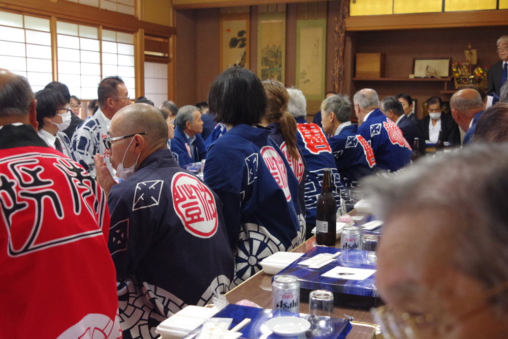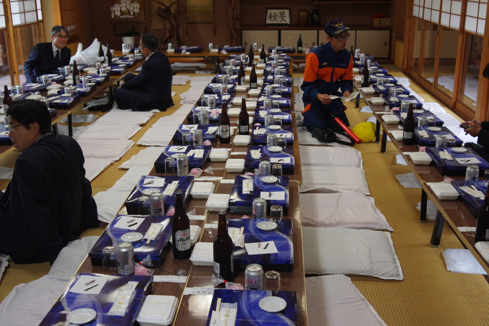 懇親会終了し、ゲストをお見送り後 怒涛の片付け作業。 大広間の片付けでは土木総代のお二人が大活躍。その働きぶりは出色です。ありがとうございました。