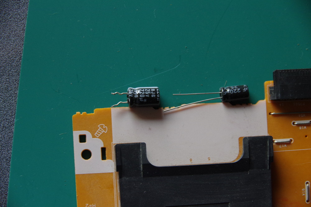 コンデンサ取り外し完了。左が取り外したもの。右がこれから取り付けるもの。耐圧と容量は同じだがサイズがずいぶん違う。