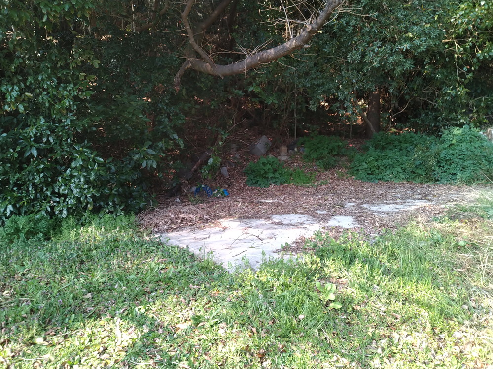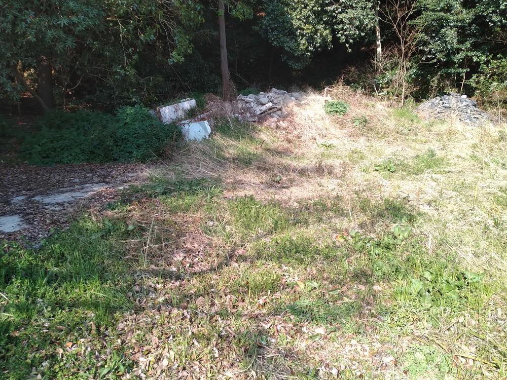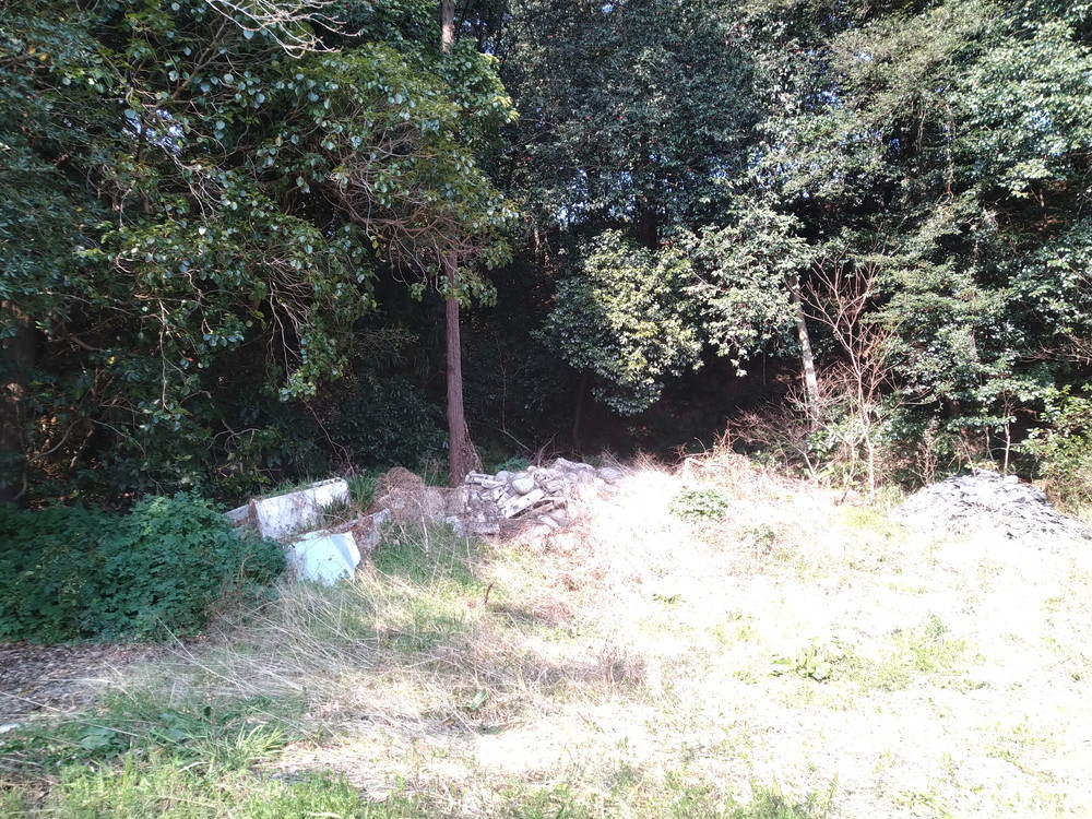 よーく見ると駐車場の北の端にがれきが寄せてあり壊されたブロックや割れた瓦等々いかにもお社を壊しましたという感じです。