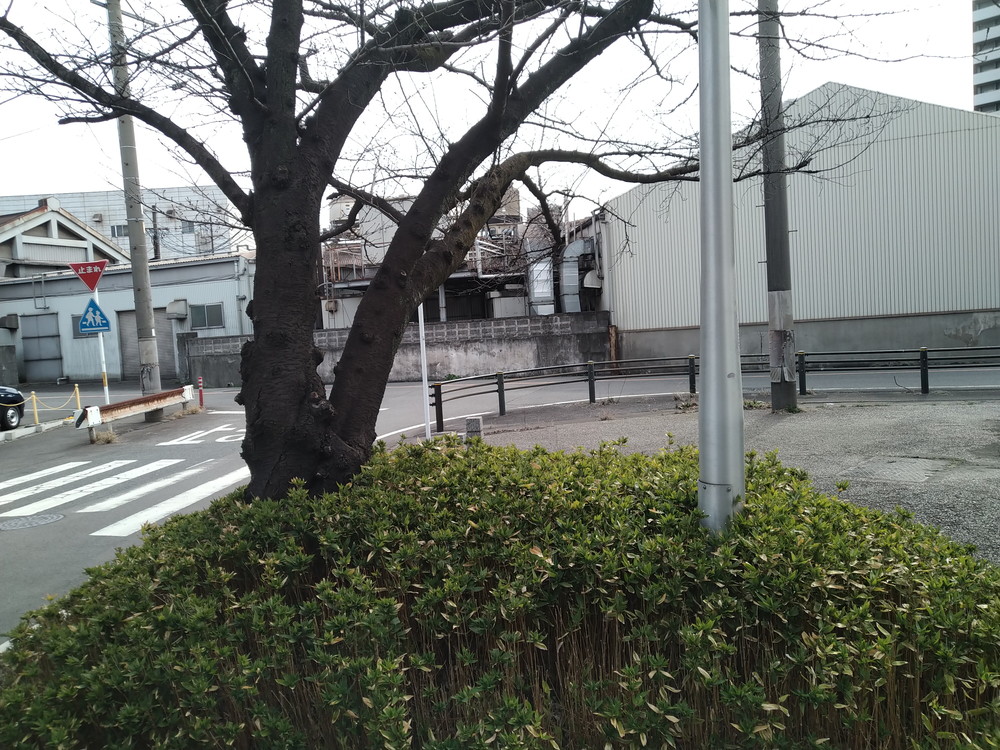 生垣と桜と電柱に囲まれてちょっと窮屈か