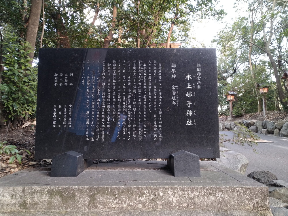 「氷上山」と称される丘陵上に鎮座し、熱田神宮の創祀以前に草薙剣が奉斎された地といわれる。